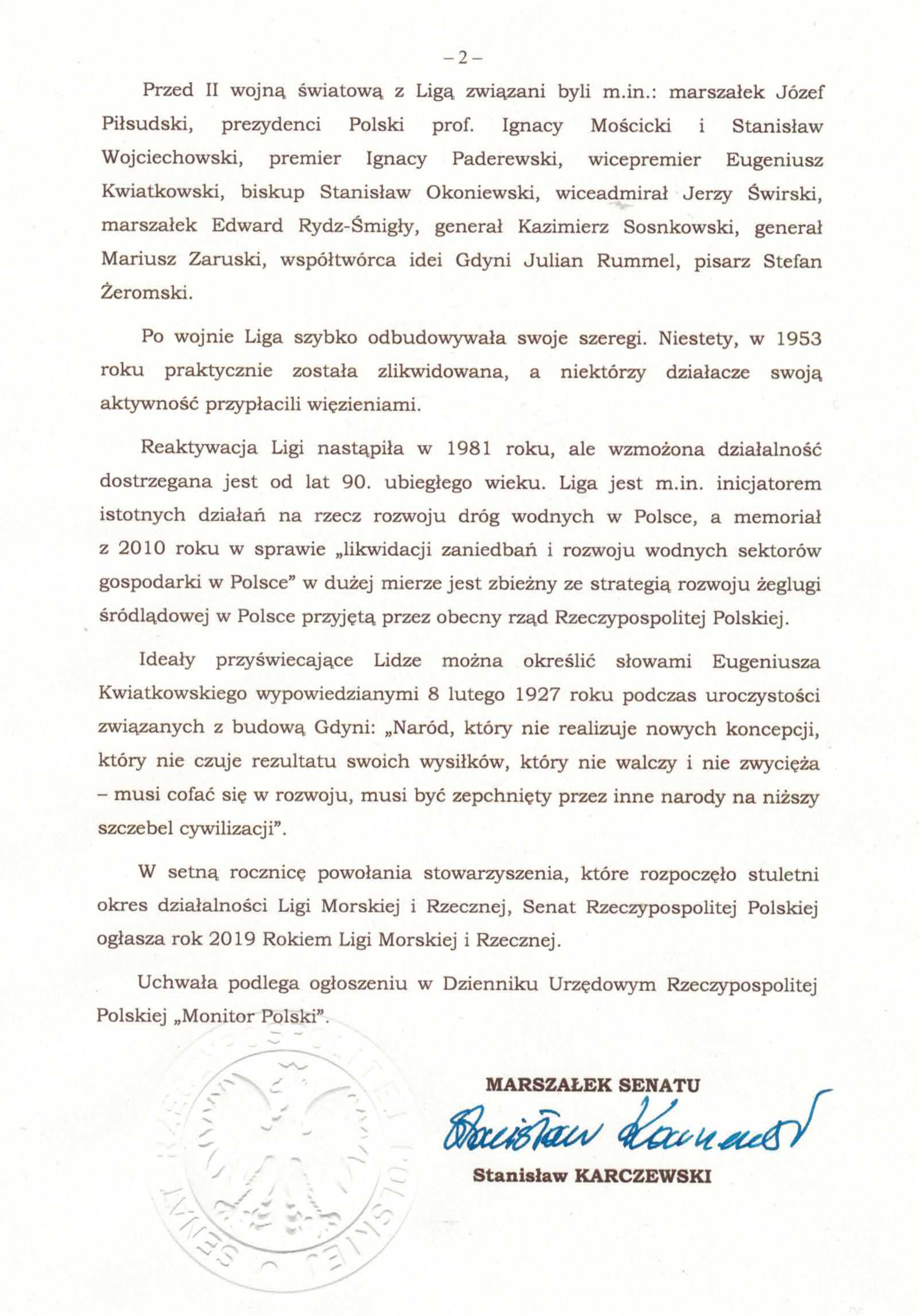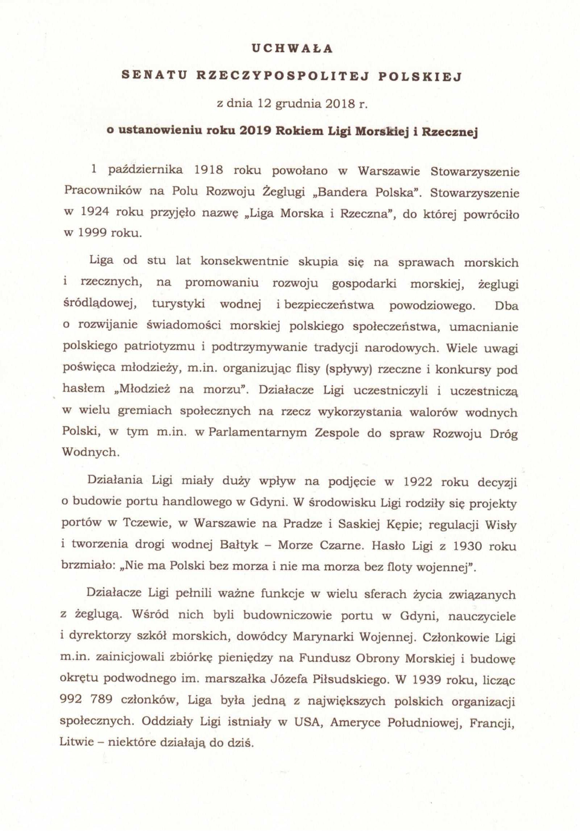 W 2018 roku obchodzimy 100- Rocznicę Odzyskania Niepodległości przez Polskę. Stowarzyszenie Liga Morska i Rzeczna w 2018 roku również obchodzi 100-rocznicę pracy społecznej członków na rzecz rozwoju gospodarki morskiej i rzecznej oraz zdolności obronnej naszej Ojczyzny.