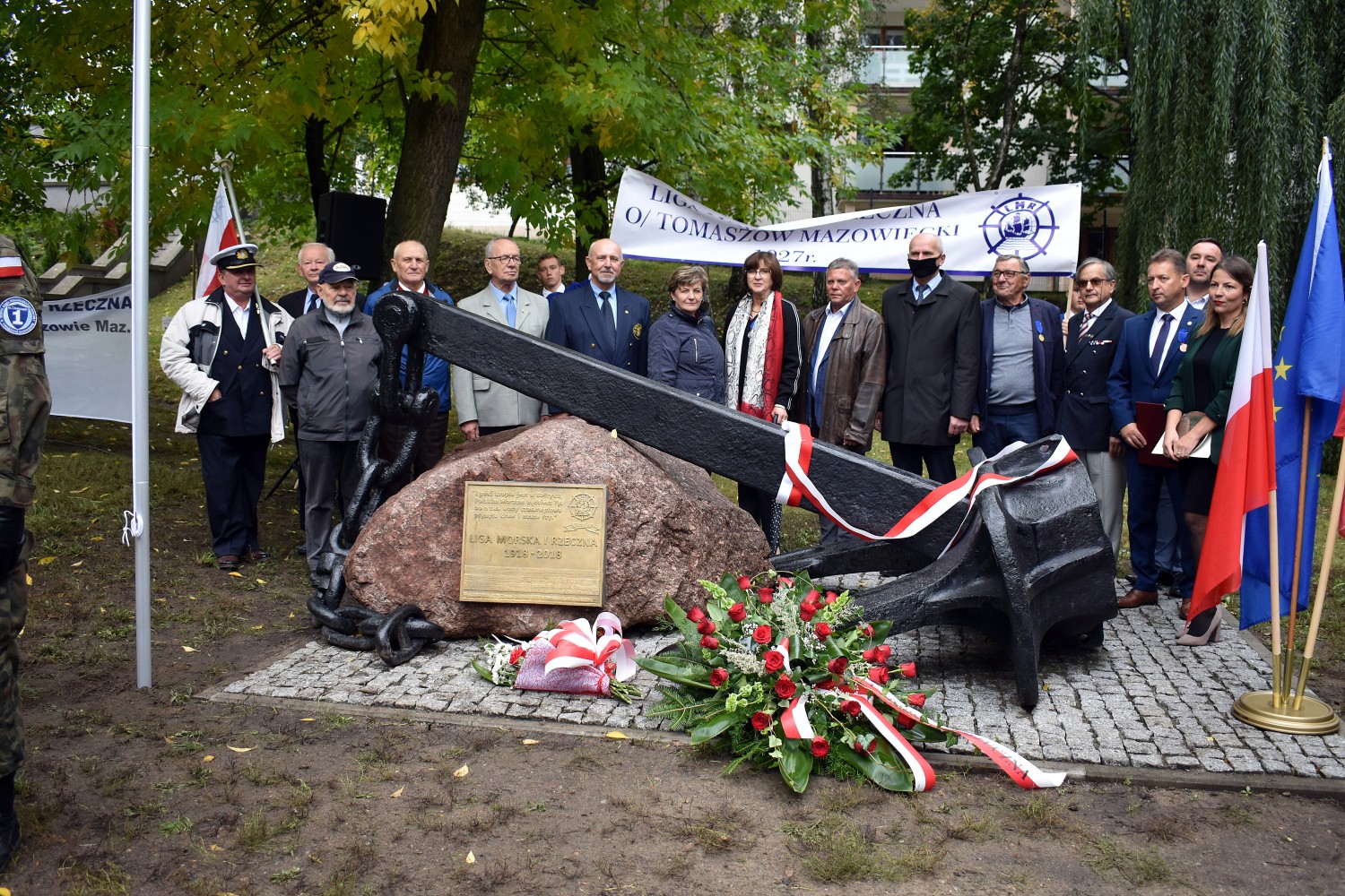 Napis: Liga Morska i Rzeczna 1918 – 2018. W 100 rocznicę odzyskania niepodległości i w 100 rocznicę powstania Ligi Morskiej i Rzecznej tomaszowianom budowniczym Polski Morskiej. Zarząd Oddziału w Tomaszowie Mazowieckim.