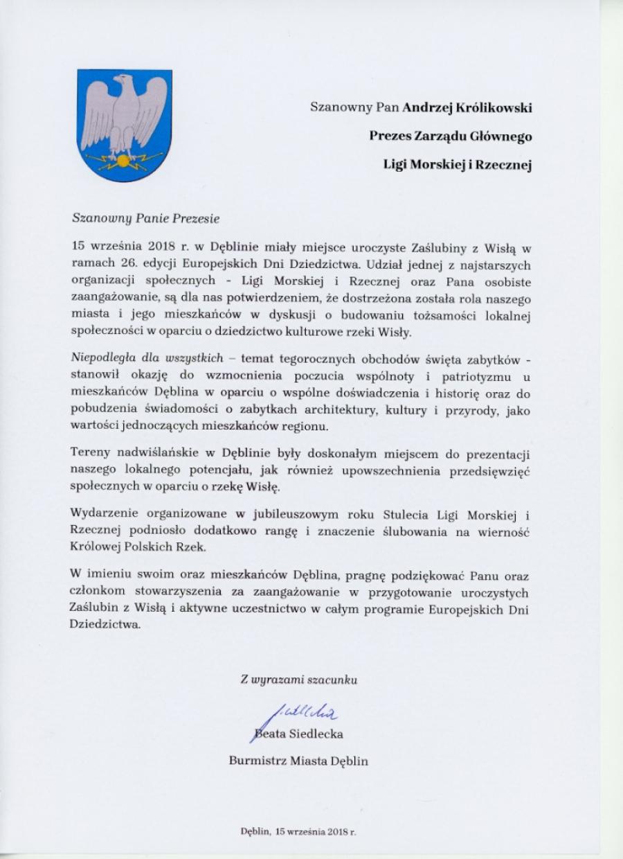 Gratulacje Beaty Siedleckiej Burmistrz Miasta Dęblin