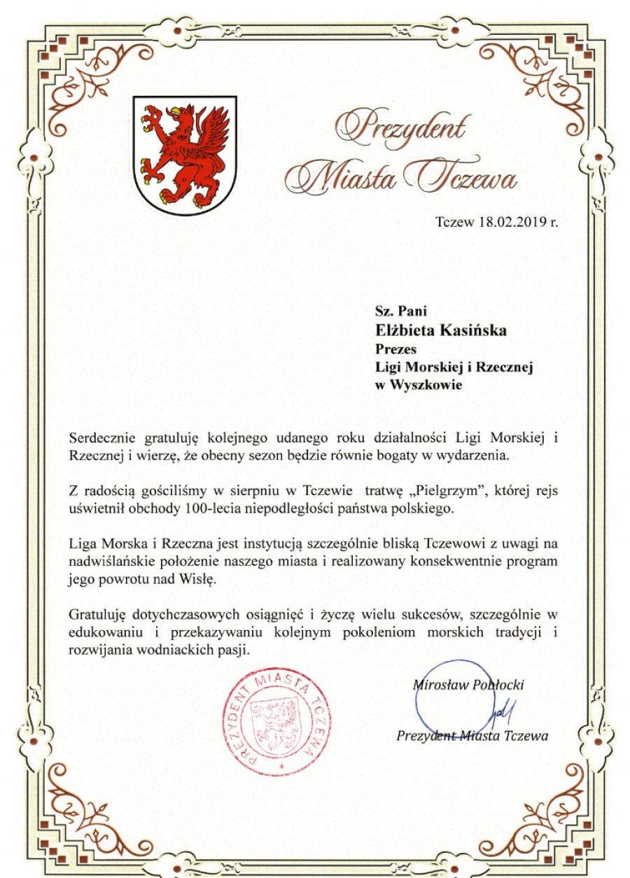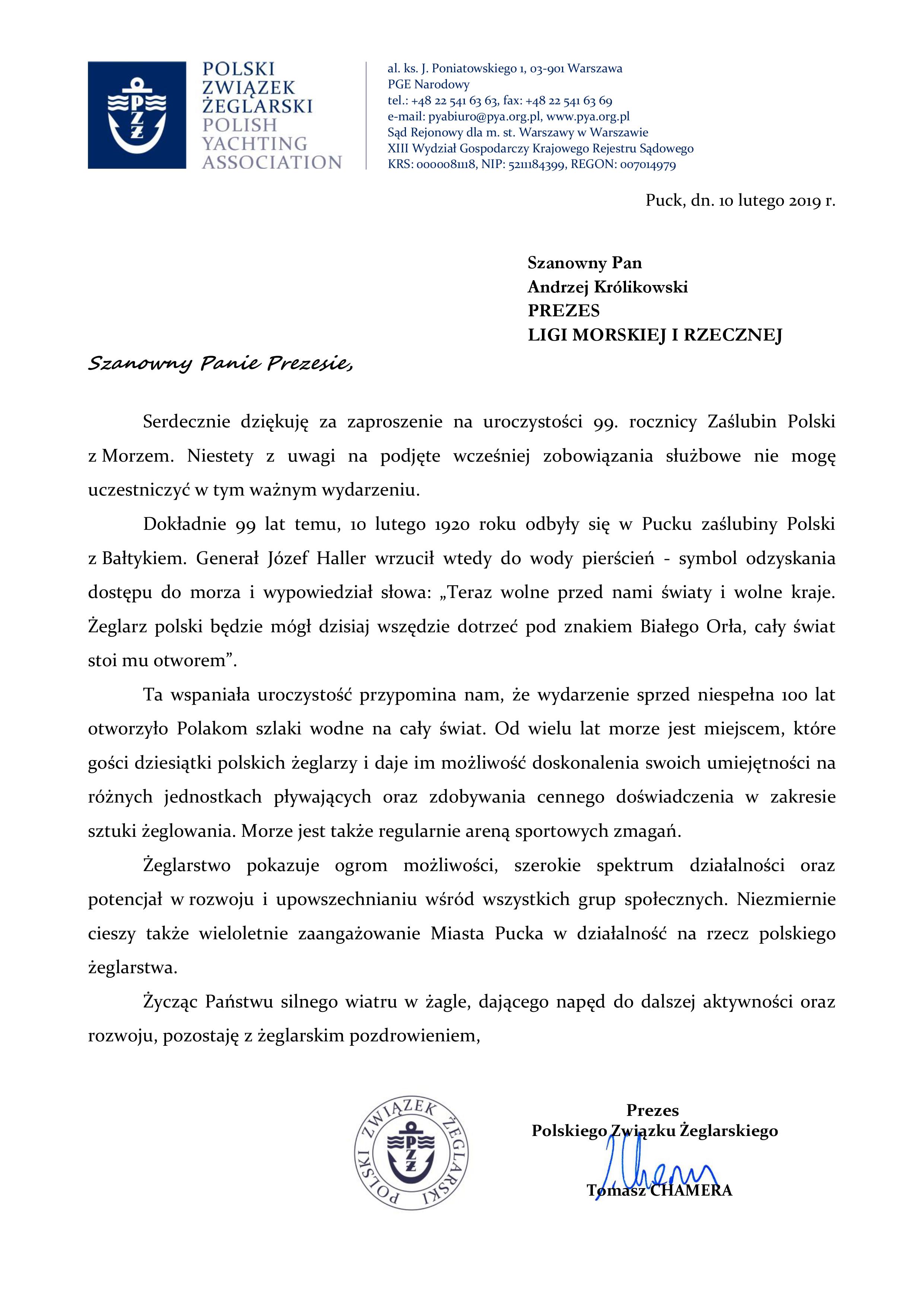 Gratulacje Prezesa Polskiego Związku Żeglarskiego