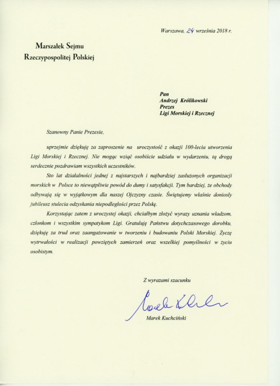 Gratulacje Marszałka Sejmu RP Marka Kuchcińskiego