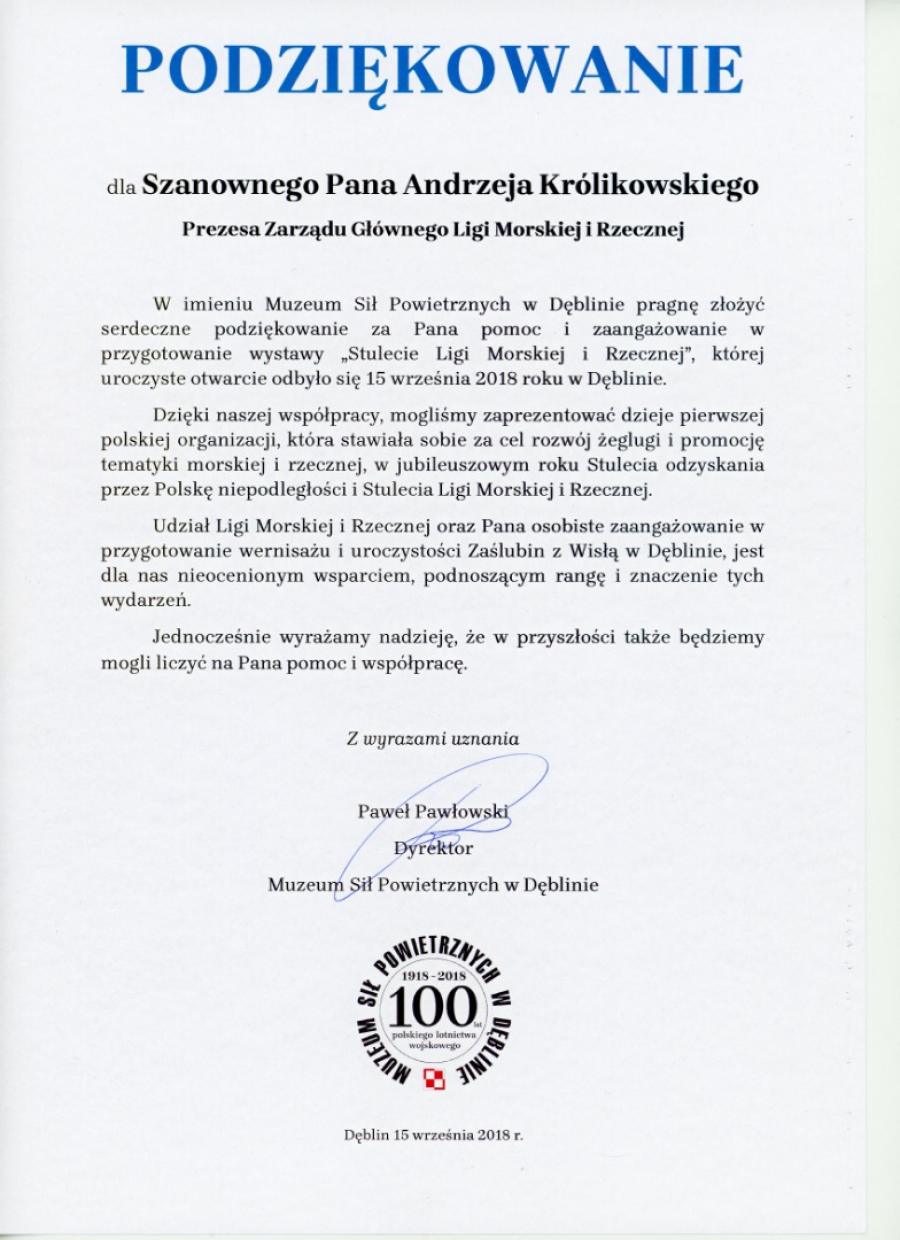 Podziękowanie Pawła Pawłowskiego Dyrektora Muzeum Sił Powietrznych w Dęblinie