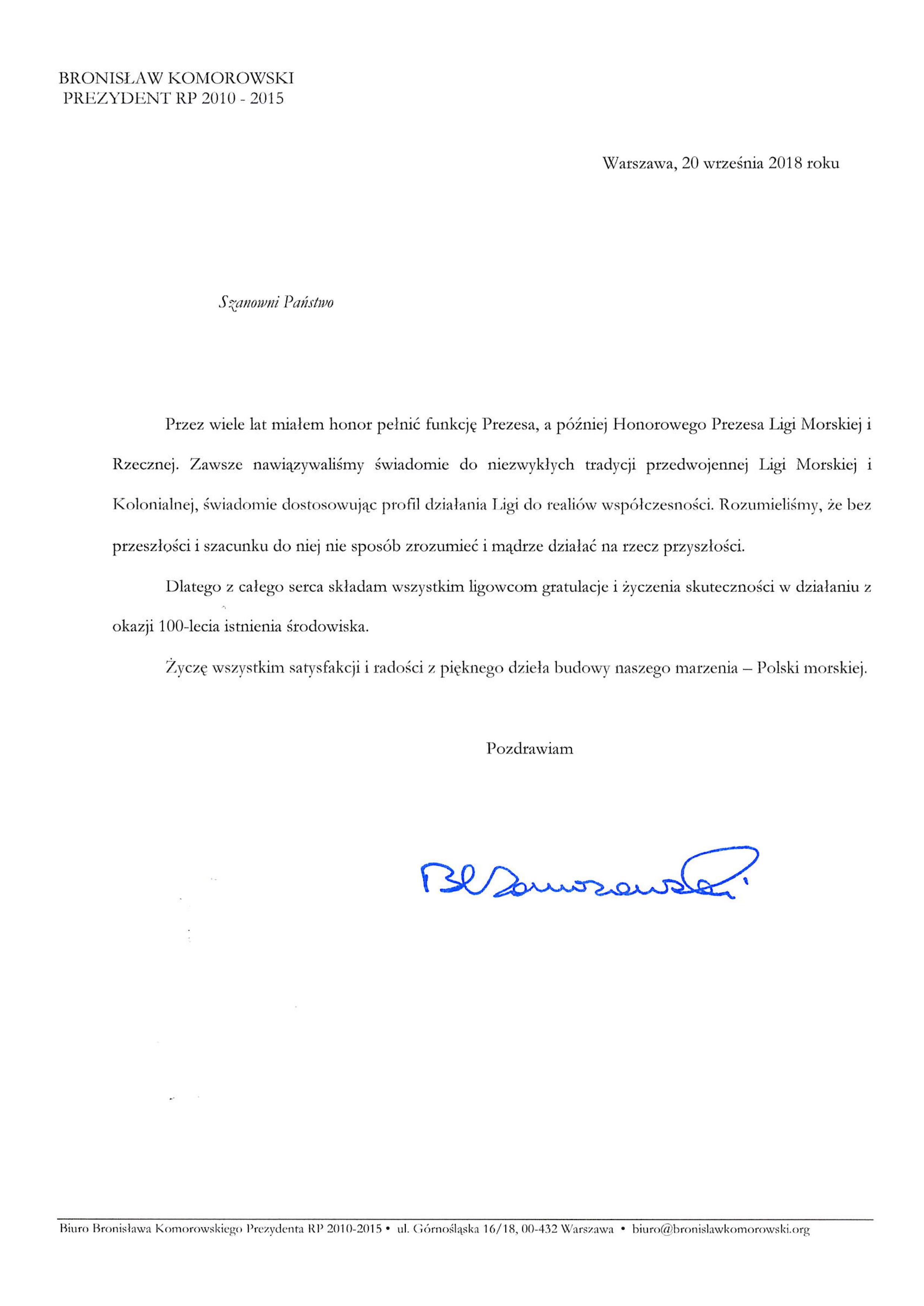 Życzenia od Bronisława Komorowskiego – Honorowego Prezesa LMiR