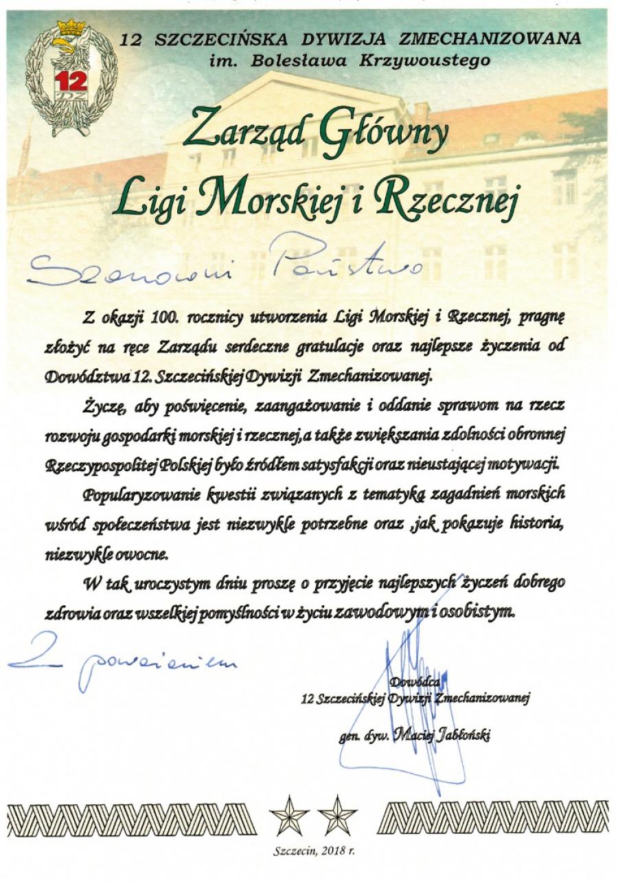 Gratulacje od Dowódcy 12 Szczecińskiej Dywizji Zmechanizowanej