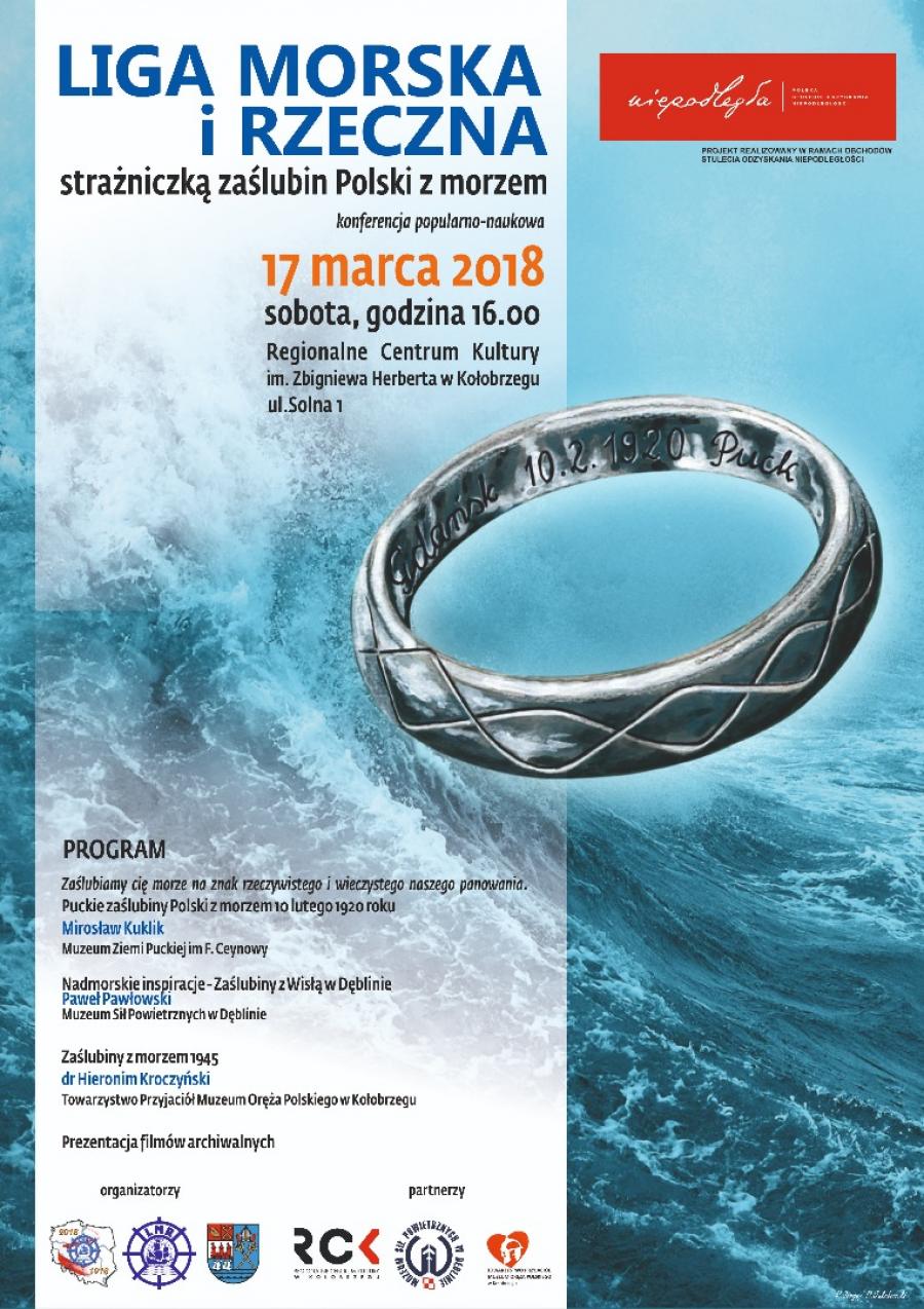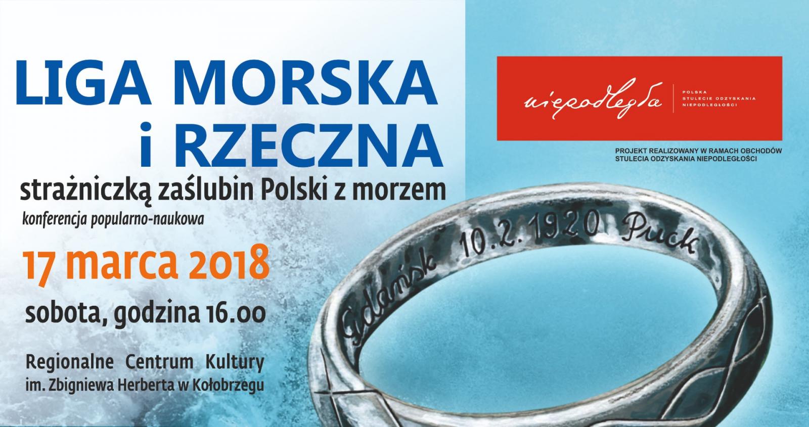 Liga Morska i Rzeczna Oddział w Kołobrzegu oraz Gmina Miasto Kołobrzeg zapraszają na konferencję popularno-naukową LIGA MORSKA I RZECZNA strażniczką tradycji zaślubin Polski z morzem w roku 100.lecia Ligii Morskiej i Rzecznej oraz 100.lecia odzyskania przez Polskę niepodległości. 17 marca 2018, sobota godzina 16.00 miejsce: Regionalne Centrum Kultury im. Zbigniewa Herberta w Kołobrzegu, ul. Solna […]
