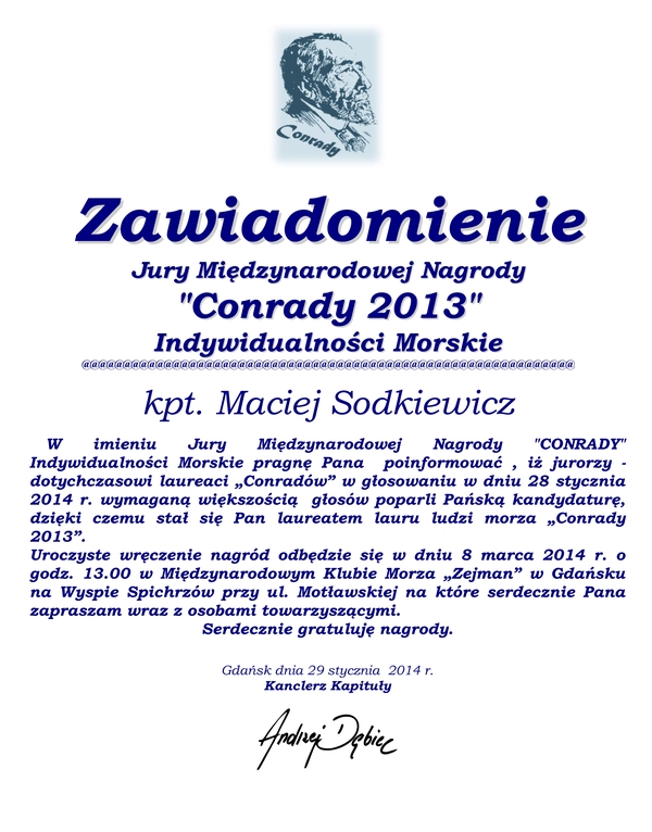 Andrzej Dębiec, Kanclerz Kapituły Międzynarodowej Nagrody „CONRADY” Indywidualności Morskie przesłał zawiadomienie o przyznaniu kpt. Maciejowi Sodkiewiczowi, organizatorowi wyprawy Sekstant Expedition – Rosyjska Arktyka 2013, lauru ludzi morza „CONRADY” za rok 2013. Obrady Kapituły odbyły się 28 stycznia 2014. Uroczyste wręczenie nagród XVIII edycji Conradów odbędzie się w dniu 8 marca 2014 r. o godz. 13.00 […]
