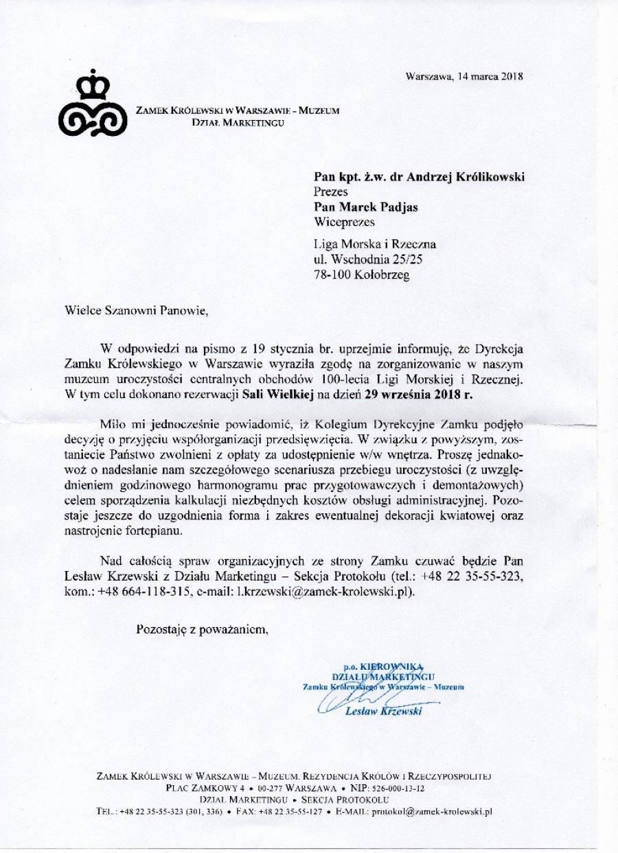 Patronat Honorowy Zamku Królewskiego w Warszawie nad Centralnymi Obchodami 100. lecia LMiR