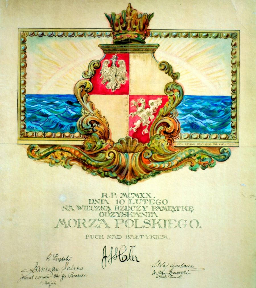 Koniec I wojny światowej i postanowienia Traktatu Wersalskiego z 28 czerwca 1919 r. przyniosły Polsce wyczekiwaną i wywalczoną niepodległość – po ponad 100 latach niebytu politycznego. Z niepodległością natomiast zawsze nierozłącznie wiązano uzyskanie dostępu do morza. W świadomości wielu Polska Niepodległa oznaczało – Polska Morska. 10 lutego 1920 r. jest dniem, w którym te nadzieje się zrealizowały i Polska powróciła nad Bałtyk. ” Wojsko Polskie(…) z generałem Hallerem na czele objęło na wieczyste posiadanie polskie morze” – głosi tekst na okolicznościowym słupie umieszczonym dla upamiętnienia tej historycznej chwili na puckim wybrzeżu. Konferencja w Wersalu i jej rezultaty były preludium do ostatecznego powrotu Polski nad Bałtyk. Gorącym orędownikiem tego pomysłu była delegacja polska na tę konferencję. Ignacy Paderewski, mówiąc o Pomorzu, porównywał je do okna na świat i płucach, bez których Polska nie może oddychać. Kamieniem milowym tej działalności był dekret Marszałka Piłsudskiego z 28 listopada 1918 roku, który tworzył w państwie jeszcze bez ostatecznie ukształtowanych granic marynarkę polską przy Ministerstwie Spraw Wojskowych. To posunięcie to ewidentny dowód na to, że rodzące się państwo polskie, świadome było swoich odwiecznych związków z morzem.