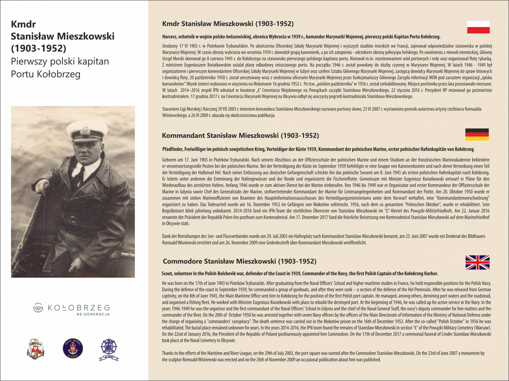 Z inicjatywy członków kołobrzeskiego oddziału LMiR wykonana została nowa, uaktualniona tablica informacyjna przy pomniku admirała Stanisława Mieszkowskiego. Poprzednia wykonana jeszcze w 2007 roku przedstawiała życiorys Bohatera do jego mordu sądowego. Doczesne szczątki Admirała zostały odnalezione i zidentyfikowane w kwaterze ,,Ł” cmentarza wojskowego na warszawskich Powązkach. W Gdyni odbył się wojskowy pogrzeb. Z honorami wojskowymi złożone na oksywskim cmentarzu marynarskim. Prezydent RP Andrzej Duda awansowała kmdr Stanisława Mieszkowskiego do stopnia kontradmirała.