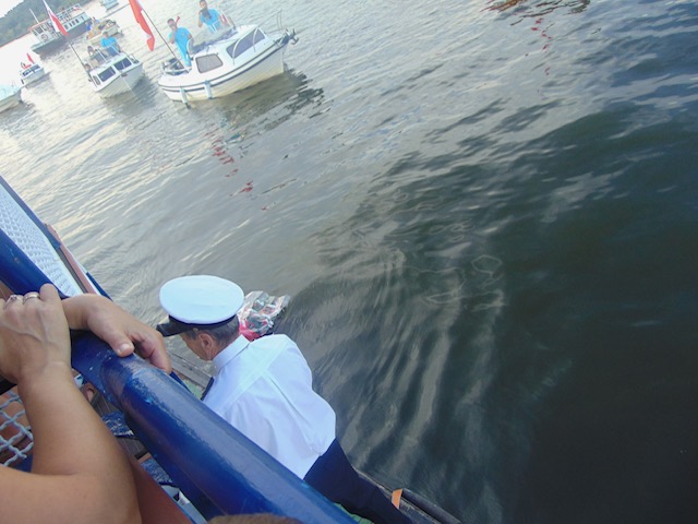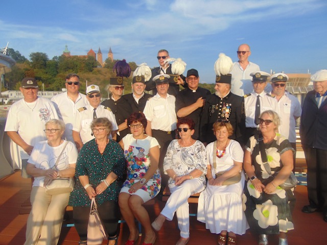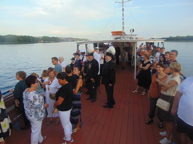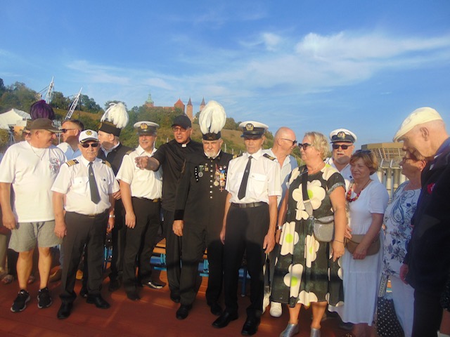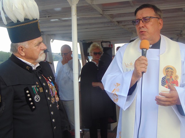 Proboszcz płockiej Bazyliki Katedralnej, Ks. Kan. Stefan CEGŁOWSKI z Ks. Infułatem prof. dr hab. Wojciechem GÓRALSKIM – wybitnym polskim kanonistą, podczas rzucania wiązanek kwiatów na dziś wyjątkową gładką toń Wisły, razem z uczestnikami tegoż patriotycznego ” Rejsu Pamięci „, zaintonował modlitwę – „Pod Twoja Obronę” oraz „Boże coś Polskę”…