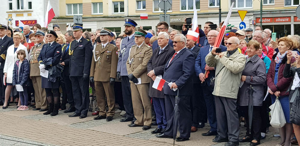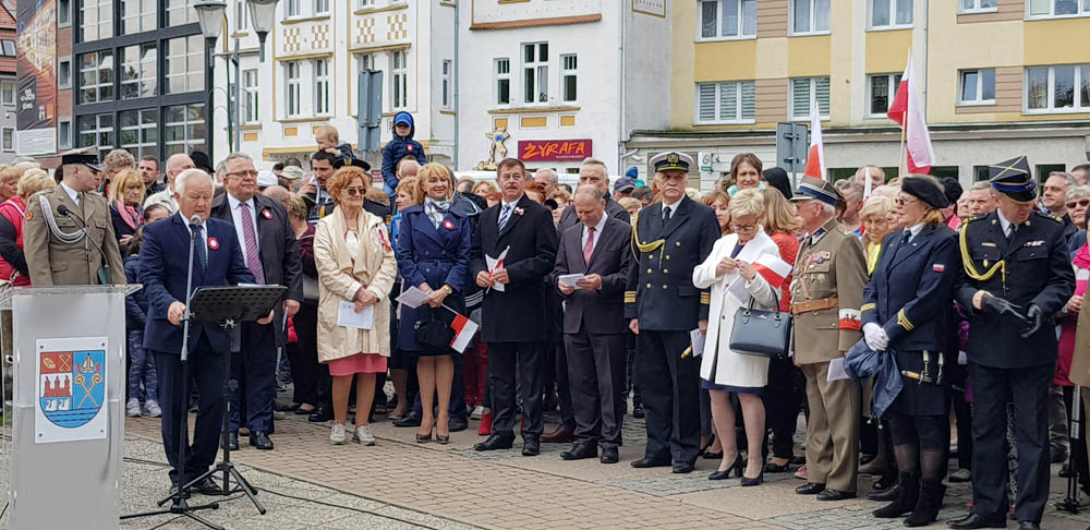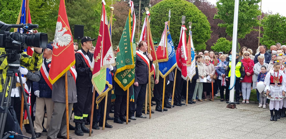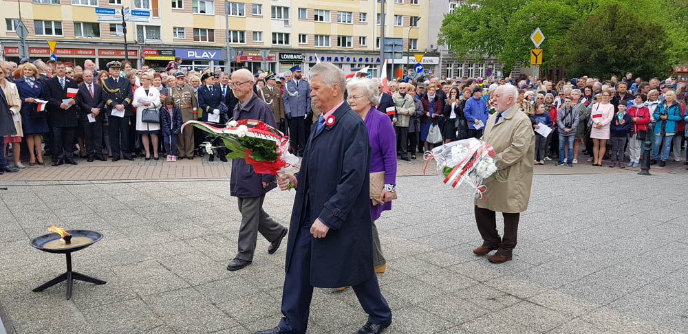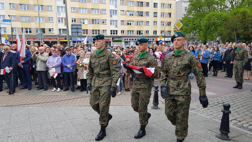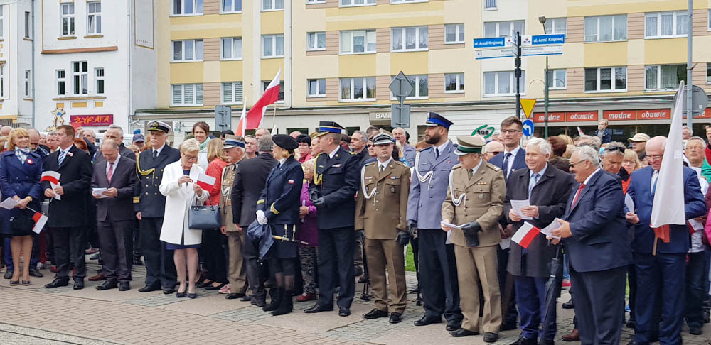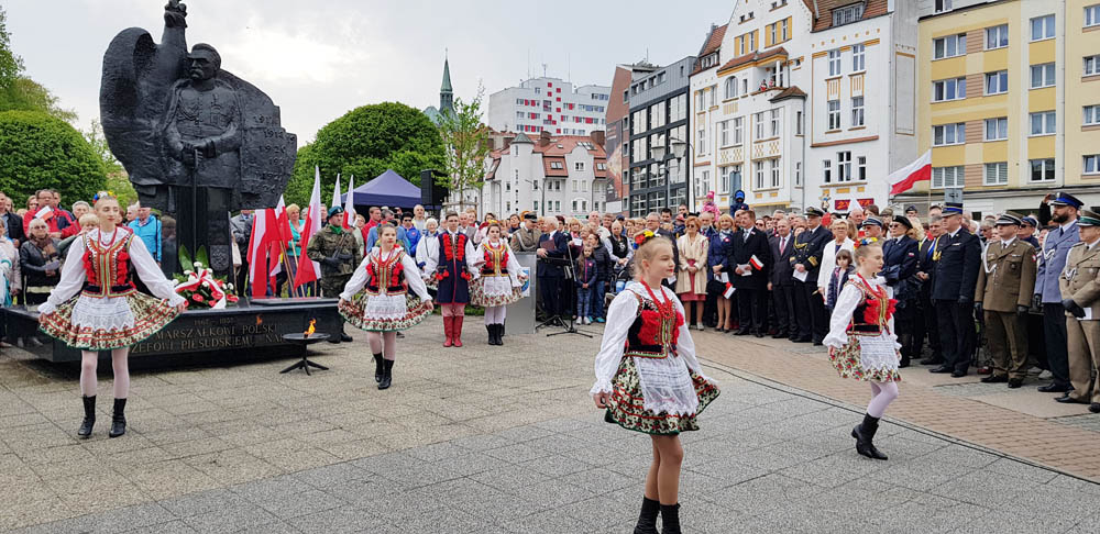 Druga część obchodów rozpoczęła się odśpiewaniem Mazurka Dąbrowskiego u stóp pomnika Marszałka Józefa Piłsudskiego. Po podniesieniu flagi państwowej oraz odczytaniu preambuły do Konstytucji 3 maja, do mieszkańców zwrócił się prezydent Janusz Gromek. W polskiej tradycji 3 maja jest dniem radosnego świętowania, dniem celebrowania naszej polskiej państwowości, której fundamentem jest konstytucja. Symbolizuje ona oświecone, mądre i odpowiedzialne dążenia rządzących do modernizacji naszego kraju. Przez 123 lata zaborów 3 majowa konstytucja była inspiracją dla niepodległościowych dążeń Rzeczypospolitej – mówił prezydent. W uroczystości udział wzięli członkowie organizacji, kombatanci, żołnierze, młodzież, harcerze jak również Liga Morska i Rzeczna. Na zakończenie wystąpił dziecięcy zespół Tirlitonki, a zebrani odśpiewali pieśni patriotyczne.