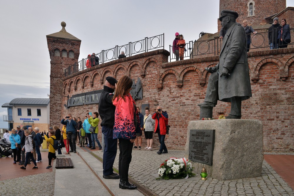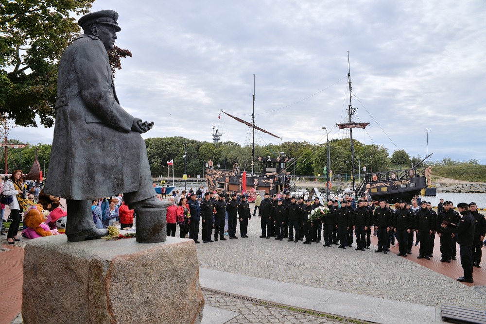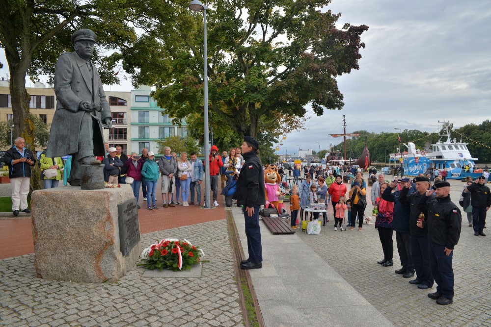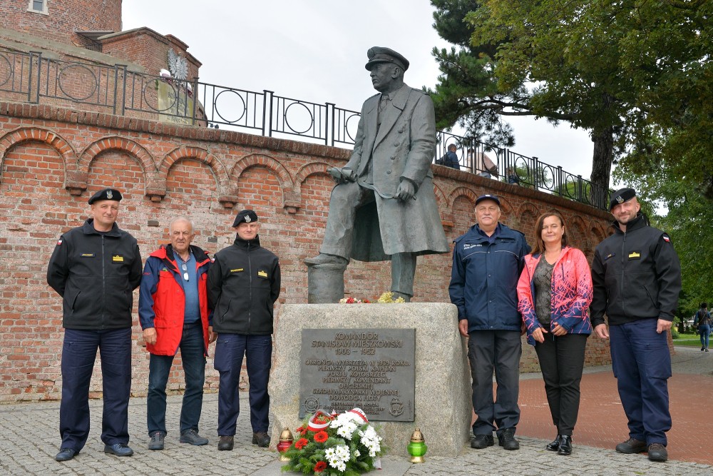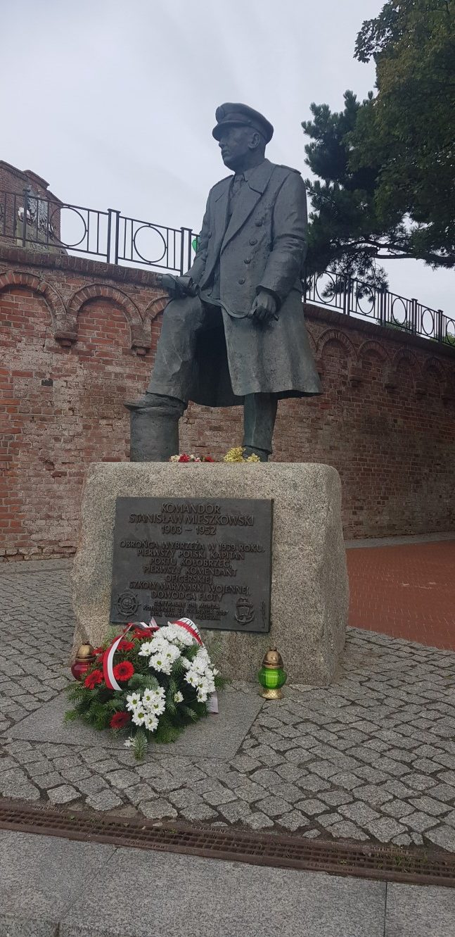 15.30 zbiórka przed okrętem. W szyku zwartym maszerujemy do portu pasażerskiego. Tam nieopodal latarni morskiej znajduje się pomnik kontradmirała Stanisława Mieszkowskiego. Odsłonięty podczas Centralnych Dni Morza w 2007 roku. Powstał z inicjatywy kołobrzeskich działaczy Ligi Morskiej i Rzecznej. Przez dwa lata zbierano potrzebne środki aby upamiętnić i przywrócić należny honor temu niezwykle zasłużonemu dla Polski Morskiej oficerowi. Wtedy jeszcze nie wiedziano gdzie znajdują się doczesne szczątki komandora. Badania i poszukiwania doprowadziły, że je odnaleziono i w 2019 spoczęły na oksywskim cmentarzu marynarskim razem z innymi oficerami obrońcami wybrzeża. Wcześniej Prezydent RP mianował komandora Stanisława Mieszkowskiego do stopnia kontradmirała. Zanim złożymy kwiaty jeden z podchorążych wygłasza wspomnienie o pierwszym komendancie Oficerskiej Szkoły Marynarki Wojennej w Gdyni. Delegacja w składzie: kmdr por. Marek Padjas, kmdr por. Mariusz Jankowski, kmdr ppor. Michał Rębiś, Gabriela Antos składa w imieniu zebranych wiązankę biało czerwonych kwiatów. Zapalają czerwony i zielony znicz. To symbole świateł nawigacyjnych. Na zakończenie uroczystości kmdr por. Marek Padjas opowiada o kołobrzeskim epizodzie Stanisława Mieszkowskiego. Podkreślił, że jako absolwenci gdyńskiej Alma Mater powinniśmy być dumni z takich wspaniałych poprzedników.
