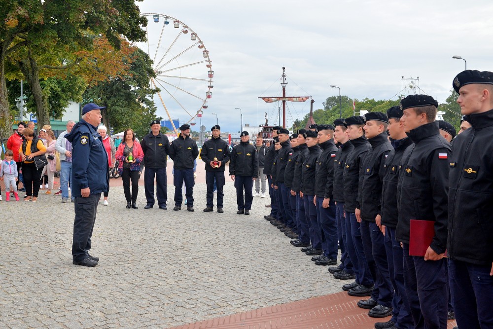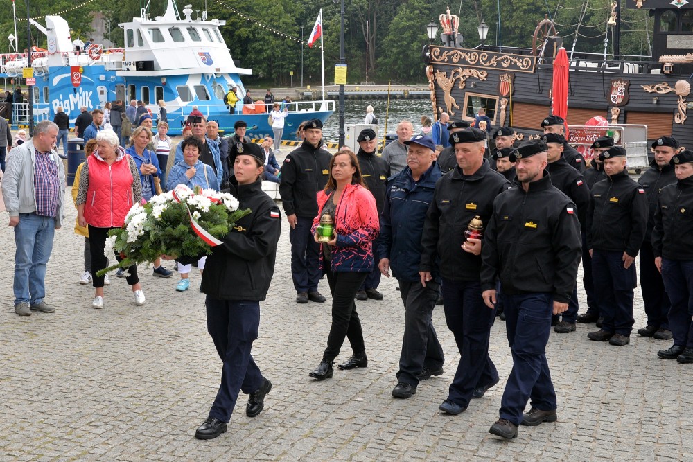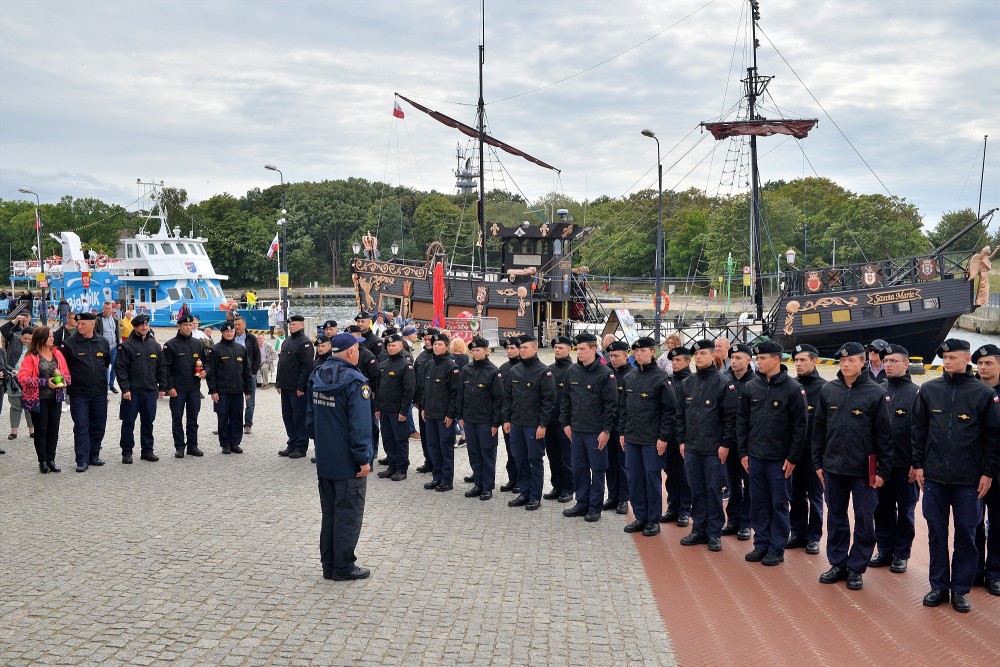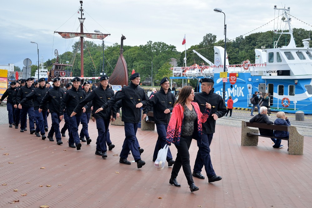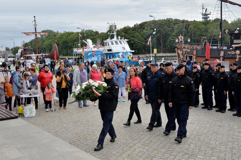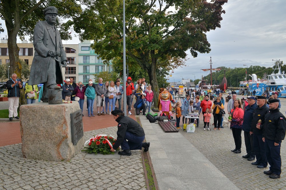15.30 zbiórka przed okrętem. W szyku zwartym maszerujemy do portu pasażerskiego. Tam nieopodal latarni morskiej znajduje się pomnik kontradmirała Stanisława Mieszkowskiego. Odsłonięty podczas Centralnych Dni Morza w 2007 roku. Powstał z inicjatywy kołobrzeskich działaczy Ligi Morskiej i Rzecznej. Przez dwa lata zbierano potrzebne środki aby upamiętnić i przywrócić należny honor temu niezwykle zasłużonemu dla Polski Morskiej oficerowi. Wtedy jeszcze nie wiedziano gdzie znajdują się doczesne szczątki komandora. Badania i poszukiwania doprowadziły, że je odnaleziono i w 2019 spoczęły na oksywskim cmentarzu marynarskim razem z innymi oficerami obrońcami wybrzeża. Wcześniej Prezydent RP mianował komandora Stanisława Mieszkowskiego do stopnia kontradmirała. Zanim złożymy kwiaty jeden z podchorążych wygłasza wspomnienie o pierwszym komendancie Oficerskiej Szkoły Marynarki Wojennej w Gdyni. Delegacja w składzie: kmdr por. Marek Padjas, kmdr por. Mariusz Jankowski, kmdr ppor. Michał Rębiś, Gabriela Antos składa w imieniu zebranych wiązankę biało czerwonych kwiatów. Zapalają czerwony i zielony znicz. To symbole świateł nawigacyjnych. Na zakończenie uroczystości kmdr por. Marek Padjas opowiada o kołobrzeskim epizodzie Stanisława Mieszkowskiego. Podkreślił, że jako absolwenci gdyńskiej Alma Mater powinniśmy być dumni z takich wspaniałych poprzedników.