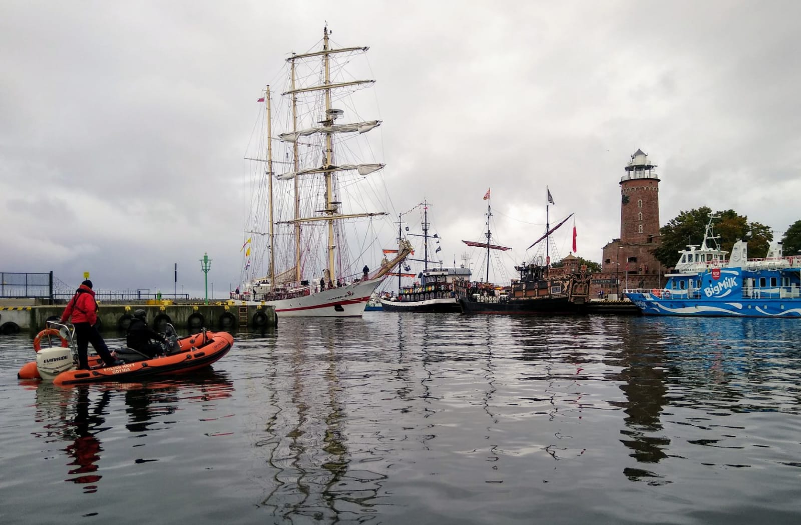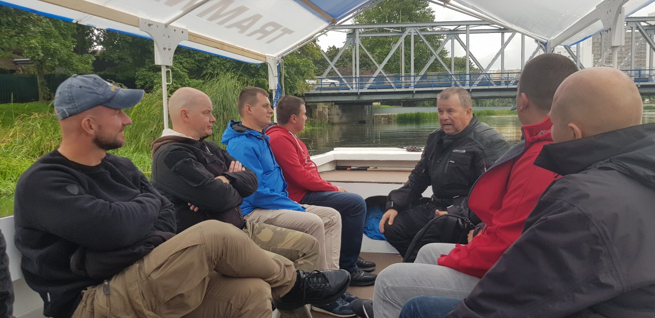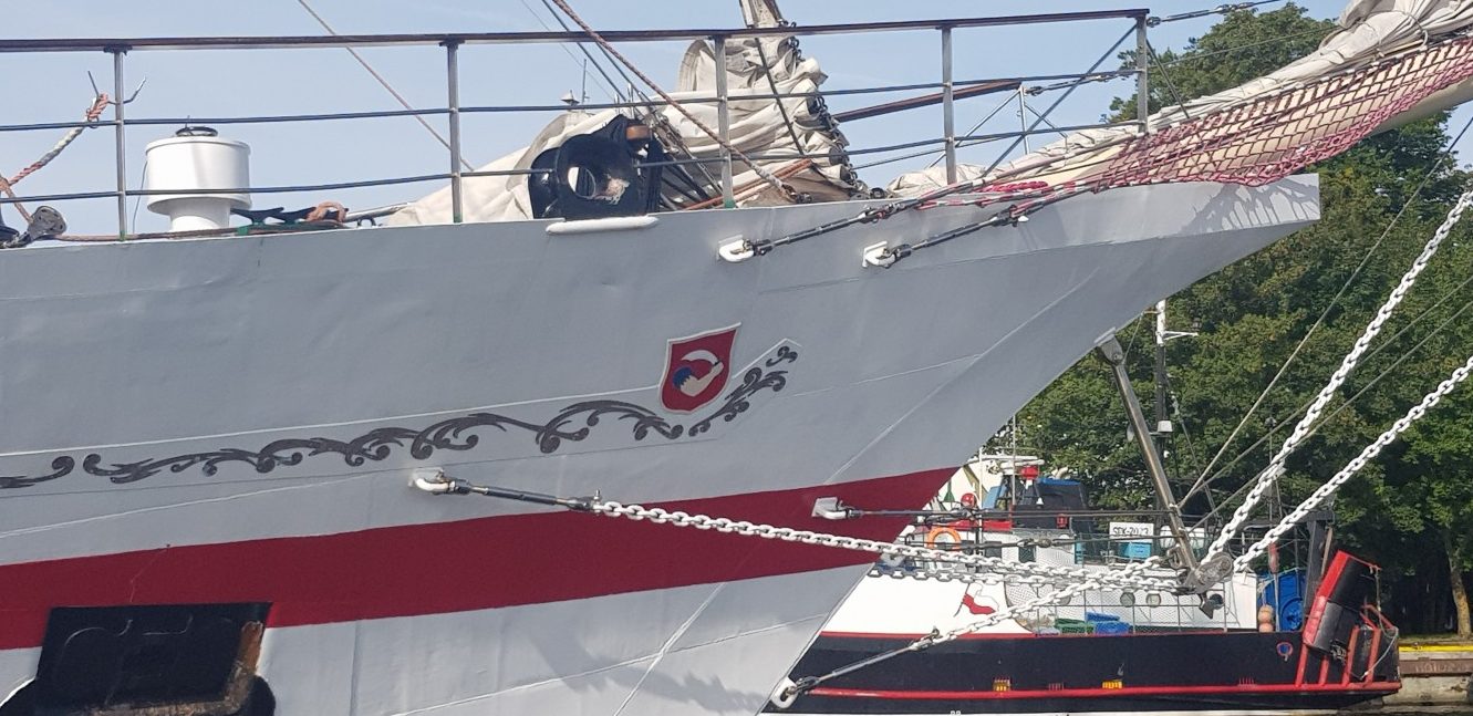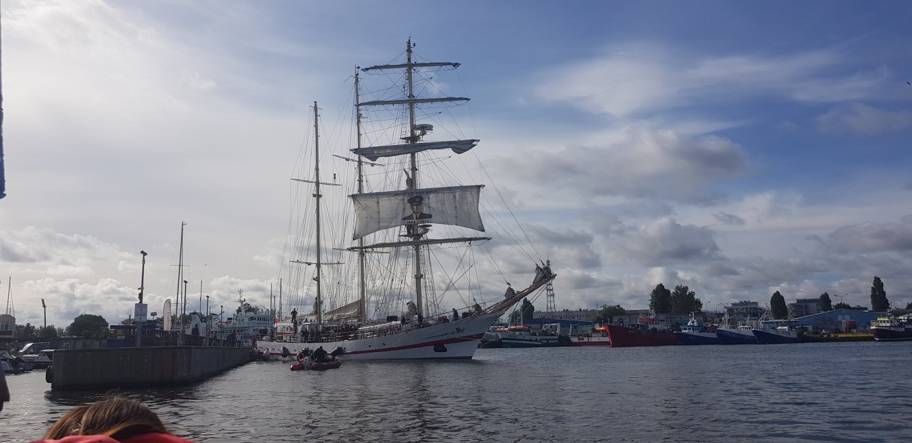 Od tego sezonu po rzece Parsęcie i porcie pływa tramwaj wodny. Podczas powrotu na okręt miły kapitan ,,tramwaju” zaprasza na pokład i załoga ma okazję zobaczyć miasto z zupełnie innej perspektywy. Przepływamy pod mostami, podziwiamy zabytkową część miasta. Piękny komentarz i opowieści z cyklu legend kołobrzeskich dopinają całości. To kolejna atrakcja, którą zafundowano załodze.
