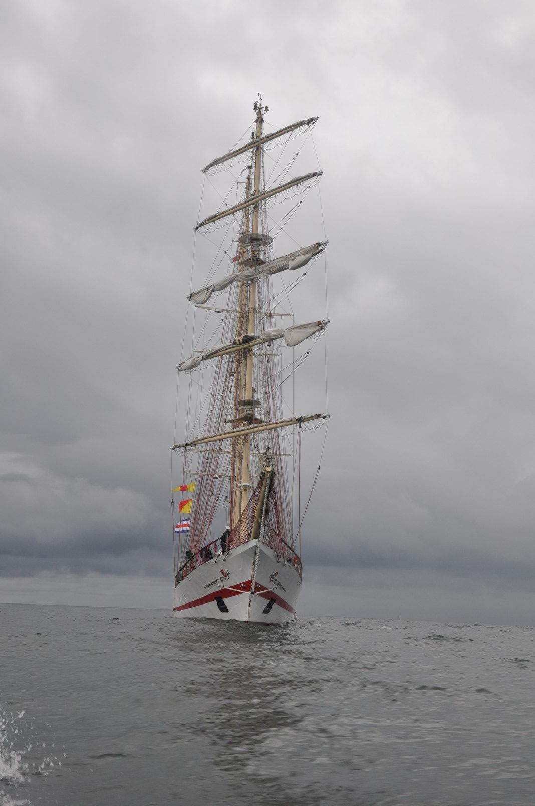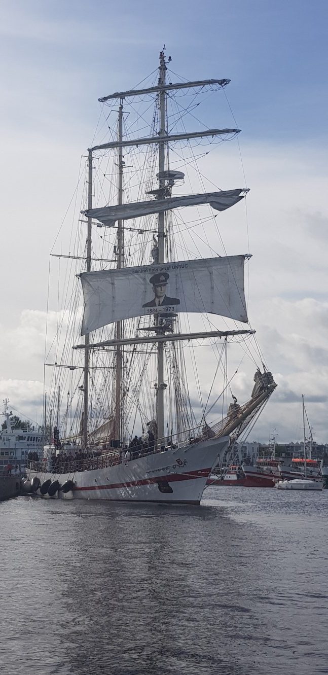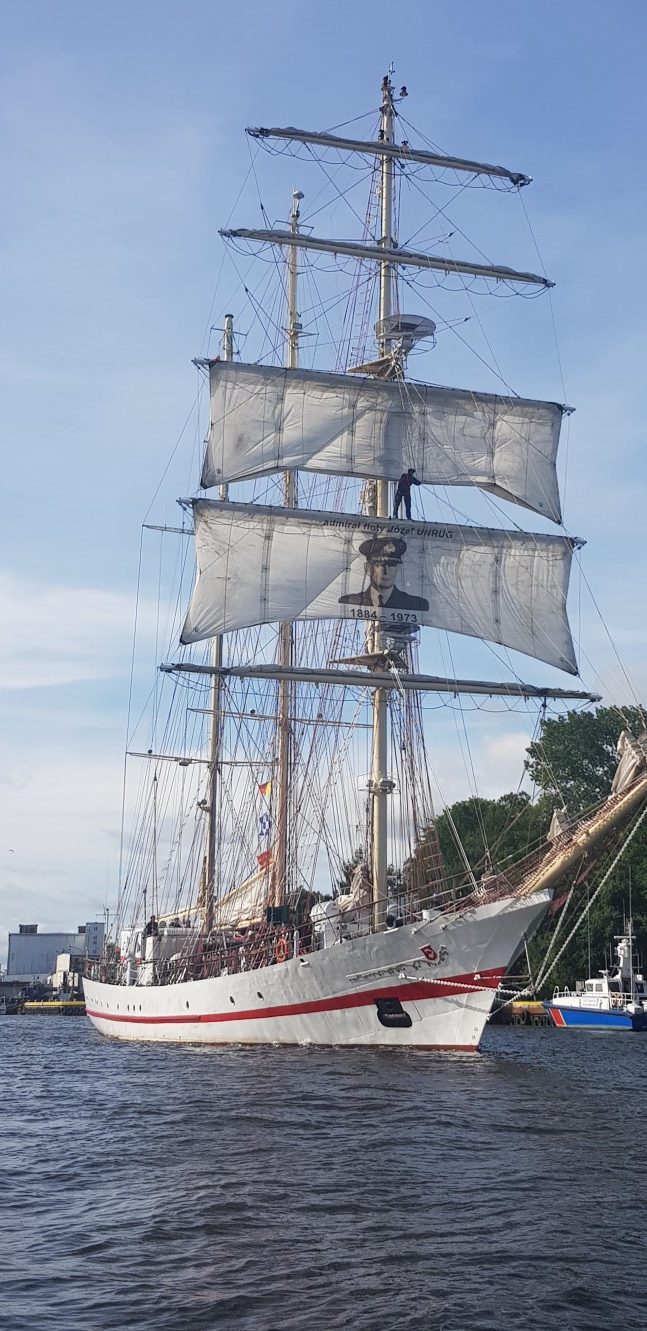 Środowy poranek. To już ostatnie chwile pobytu załogi ORP Iskra w Kołobrzegu. Od rana trwają przygotowania do wyjścia na morze. Załoga krząta się po pokładzie. W pomieszczeniach ształowane są wszystkie ruchome elementy wyposażenia. Wiadomo, że okręt płynący na żaglach będzie się przechylał i kołysał na fali, więc wszystkie rzeczy muszą być tak zamocowane, aby po pierwszym bujnięciu samoczynnie nie zaczęły podróży po całej kabinie. Pod czujnym okiem oficerów i bosmana marynarze realizują wszystkie nakazane czynności. Okręt gotowy do drogi. Pożegnalne uściski i słychać gwizdki nakazujące oddanie cum. Iskra majestatyczne wysuwa dziób na wodę. Bukszpryt kieruje się na kanał portowy. Dwa gwizdki i szpring rufowy powraca na pokład. Kończy się ostatnia więź z lądem. Okręt wychodzi na obrotnicę. Na fokmaszcie postawione zostają: górny i dolny marsel. Na tym niższym widnieje wizerunek admirała floty Józefa Unruga. Był on dowódcą obrony Wybrzeża w 1939 roku. Po kapitulacji razem ze swoimi żołnierzami udał się do niewoli. Mimo, że z racji pochodzenia proponowano mu wolność nie skorzystał z propozycji, a z Niemcami komunikował się za pośrednictwem tłumacza. Po uwolnieniu w 1945 roku uczestniczył w rozwiązywaniu Polskich Sił Zbrojnych na Zachodzie. Już nigdy nie wrócił do kraju. Żył na emigracji w Wielkiej Brytanii i Francji. Zmarł w 1973 roku. Spoczywał na cmentarzu w Montresor. Żagiel po raz pierwszy zaprezentowano 30 września 2018 roku podczas powitania na polskich wodach fregaty ORP Gen. T. Kościuszko, wiozącej z Francji prochy admirała. Uroczystość odbyła się na Zatoce Gdańskiej na wysokości Helu.
