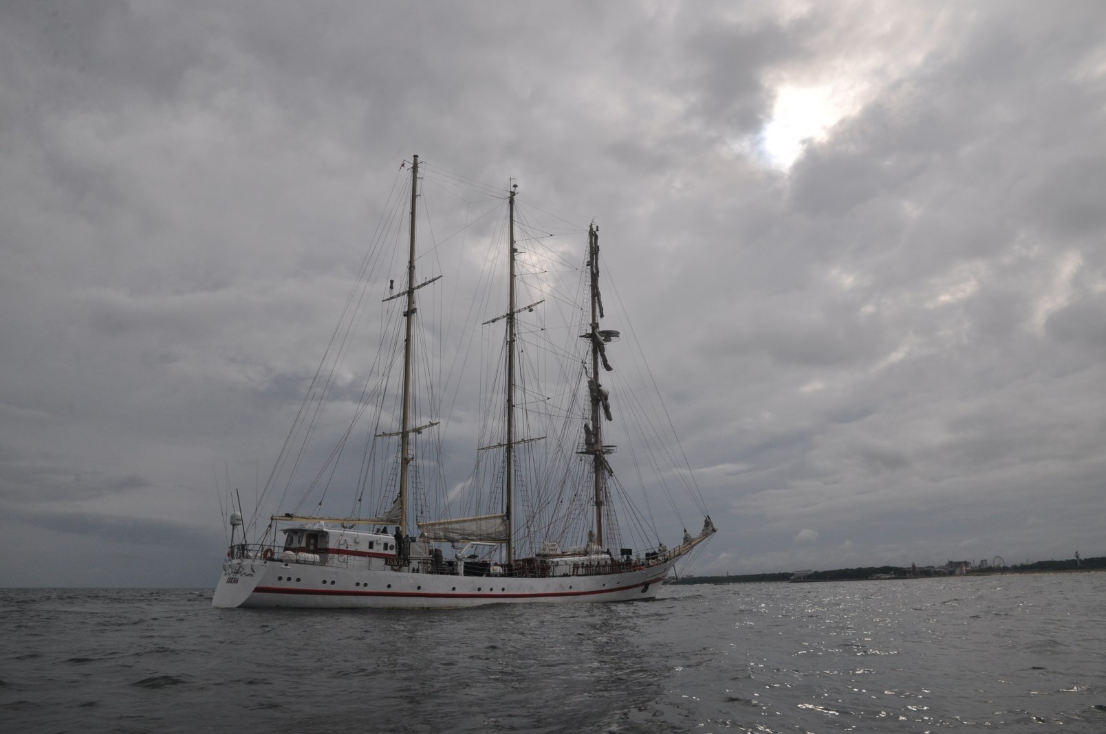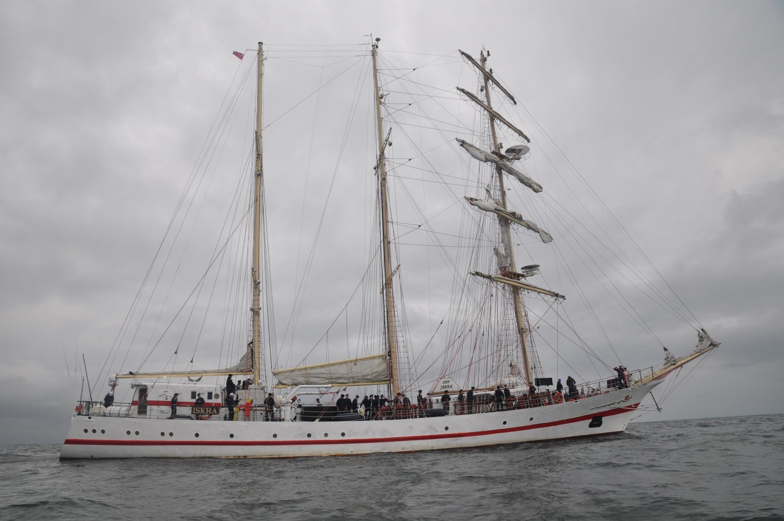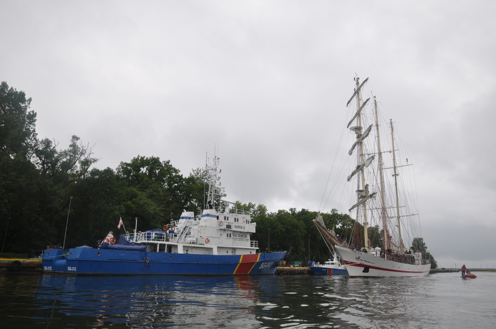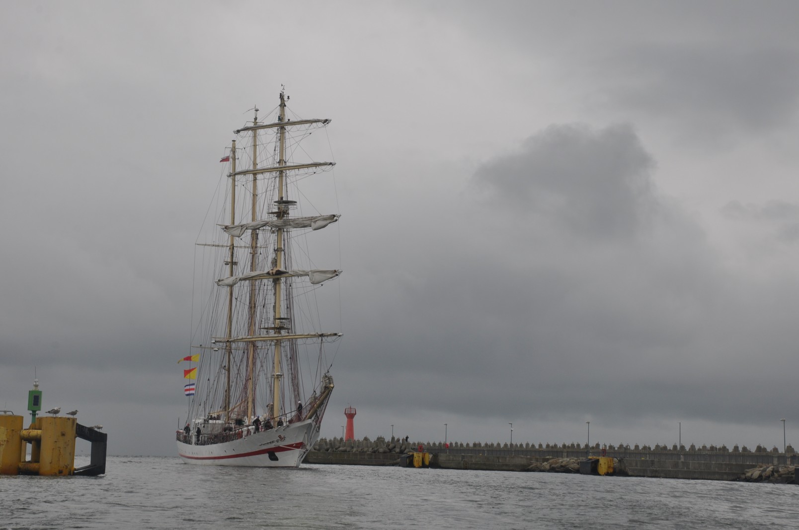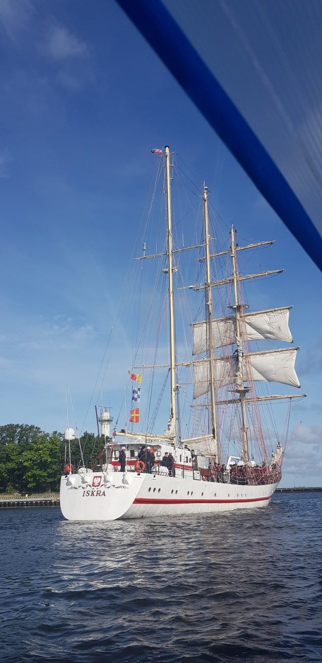 Z dwudniowym opóźnieniem ORP Iskra melduje się na redzie kołobrzeskiego portu. To nic, że trzeba było przesunąć wszystkie zaplanowane atrakcje. Ważne, że są i za chwilę miną główki portu. Wypływamy im naprzeciw. Naszą motorówką steruje Bogdan Jałoszyński, syn ikony kołobrzeskiego żeglarstwa. Nikogo nie dziwią jego umiejętności, a przede wszystkim intuicja. Dzielnie manewruje pomiędzy falami. W porównaniu z Iskrą jesteśmy jak łupinka. Z daleka widać ruch na pokładzie, załoga szykuje się do zejścia z kotwicy. Za chwilę dowódca poda komendę i ogłosi przygotowanie do wejścia do portu. Mimo dżdżystej pogody i zachmurzonego nieba pstrykają migawki aparatów. To rzadka okazja aby z tak bliska sfotografować taką jednostkę. Z daleka pozdrawiamy obecnych na pokładzie. Słychać dzwonki alarmowe, podniesiony zostaje sygnał Międzynarodowego Kodu Sygnałowego. Majestatycznie Iskra kieruje się w stronę portu. Obsady manewrowe na stanowiskach, reszta załogi w paradzie burtowej. Mijamy okręt aby zająć lepszą pozycję do robienia zdjęć. W czasie tego manewru zbliżamy się do burty. Widzimy znajome twarze. Pozdrawiamy się wzajemnie. Na mostku dowódca, zastępca, mechanik. Za sterem sternik manewrowy. Wchodzą do kanału portowego. Na nabrzeżu tłumy witających. Okrzyki powitania. Załoga odpowiada sygnałem syreną. Docierają na obrotnicę. Wykonują zwrot aby zacumować prawą burtą. Na Nabrzeżu Szkolnym oczekują ich przyjaciele, znajomi i miłośnicy żeglarstwa.
