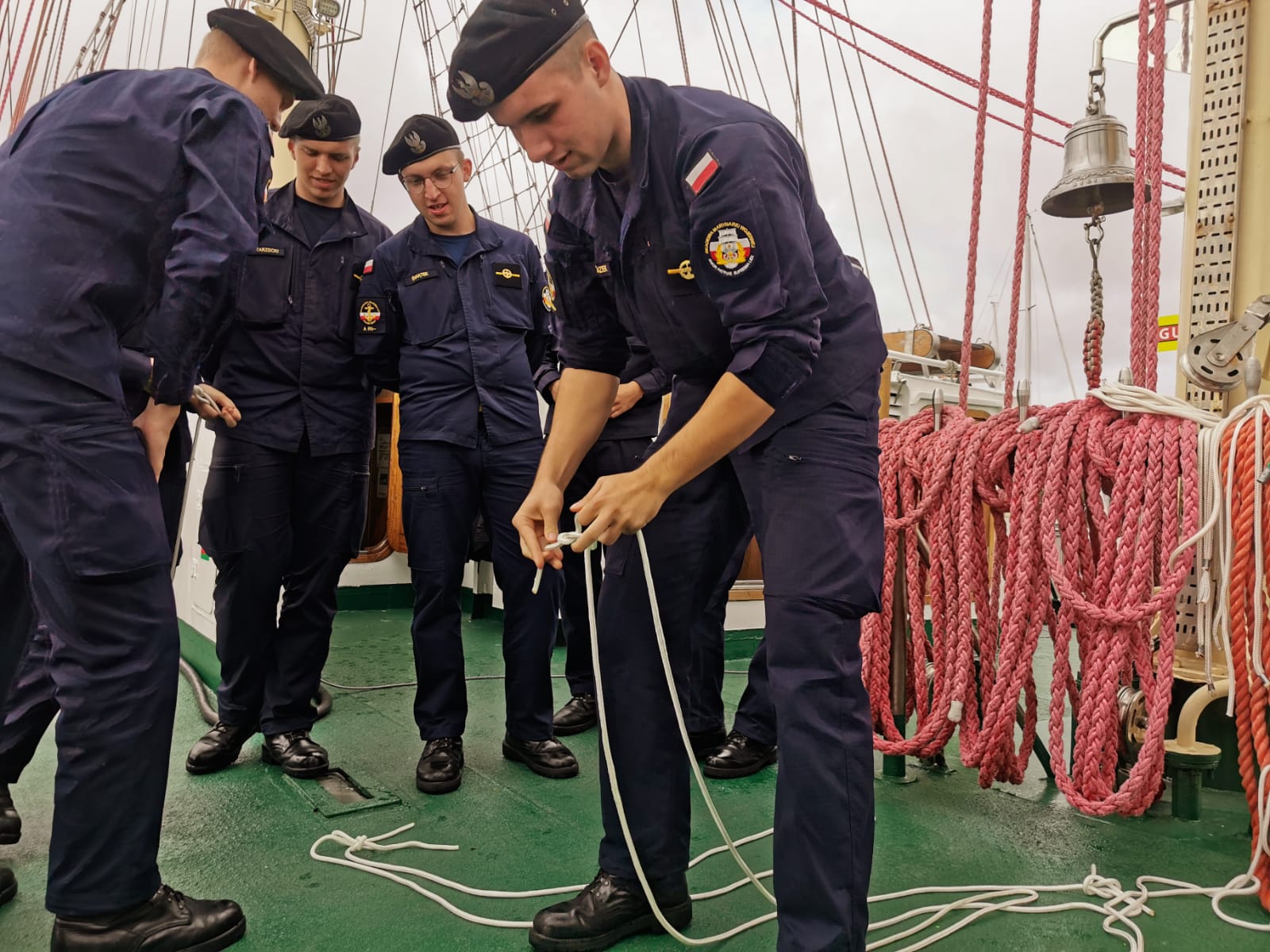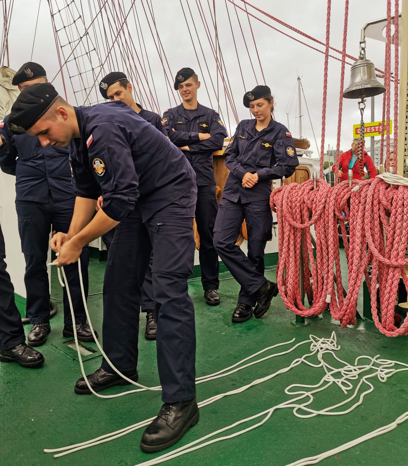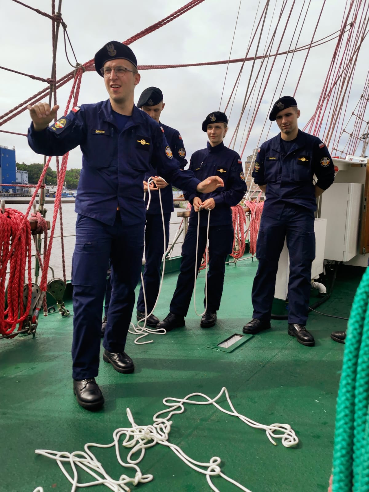 Po zwiedzaniu sama prezes kołobrzeskich ligowców Gabriela Antos przeprowadziła zawody marynarskie dla podchorążych uczestników 30. Zlotu jungów. Okazuje się, że rok studiów pozwolił na bardzo dobre żeglarskie przygotowanie. Wszyscy wzorowo wykonali poszczególne konkurencje.