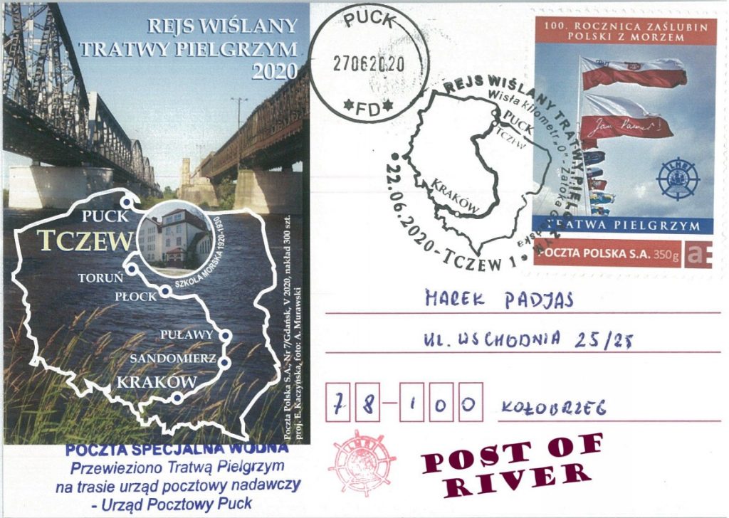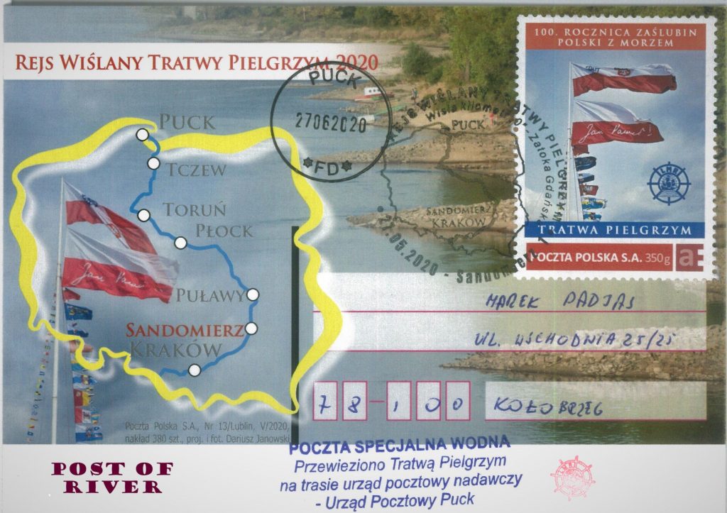 Podczas rejsu tratwy Pielgrzym, który odbywał się od 18 maja do 27 czerwca 2020 roku na jej pokładzie uruchomiona została Poczta Wodna. W odwiedzanych miejscowościach stosowano okolicznościowe datowniki. Poczta Polska wydała również karty korespondencyjne oraz znaczki personalizowane. Na kartach zobaczyć można charakterystyczne dla danych miejsc widoki. Natomiast znaczki przedstawiają: pierwszy Relikwiarz Św. Jana Pawła II, drugi Maszt tratwy z ligową banderą oraz flagą z autografem Św. Jana Pawła II, trzeci zarys granic Polski w papieskich barwach oraz trasę wyprawy. Większość kart i datowników zaprojektował Dariusz Janowski, znaczki Marek Padjas.