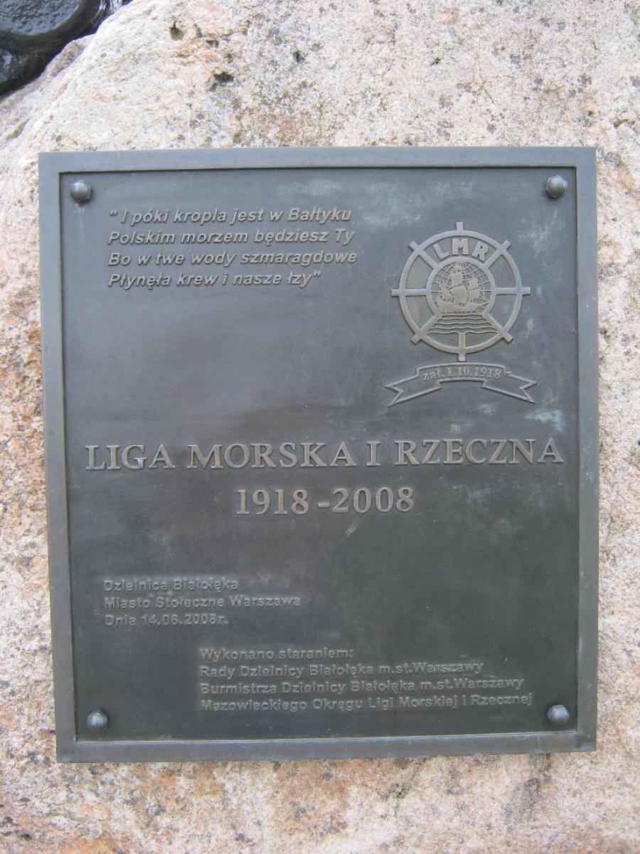 Pomnik Ligi Morskiej i Rzecznej znajduje się na rogu ulic Światowida i Hanki Ordonówny w warszawskiej dzielnicy Białołęka. Pomnik przedstawia głaz, na którym oparta jest kotwica. Pochodzi ona z niszczyciela rakietowego ORP Warszawa, okrętu flagowego Polskiej Marynarki Wojennej z lat 1988-2003. Na głazie znajduje się przymocowana tablica, na której widnieje napis: „I póki kropla jest w Bałtyku, polskim morzem będziesz ty, bo o twe wody szmaragdowe płynęła krew i nasze łzy. – Liga Morska i Rzeczna 1918-2008”. Pomnik został odsłonięty 14 czerwca 2008 roku.