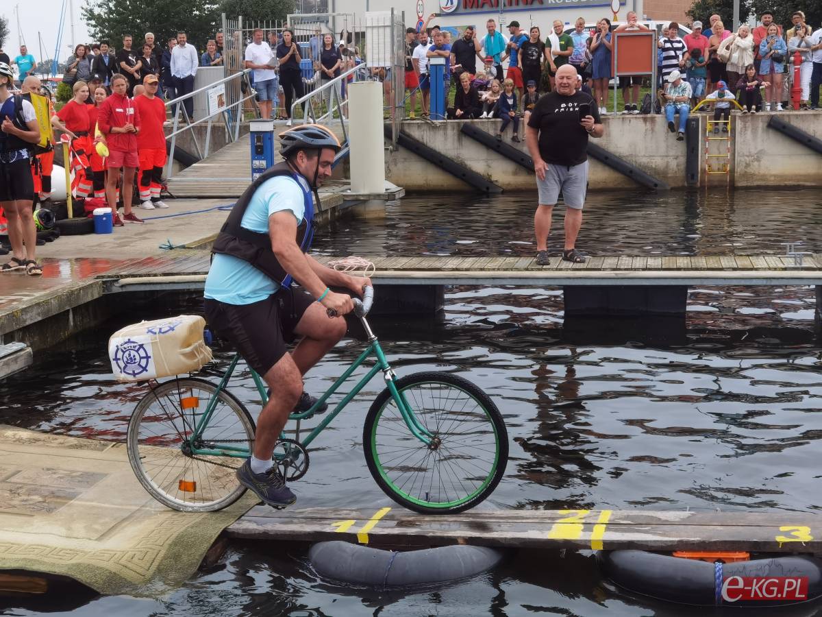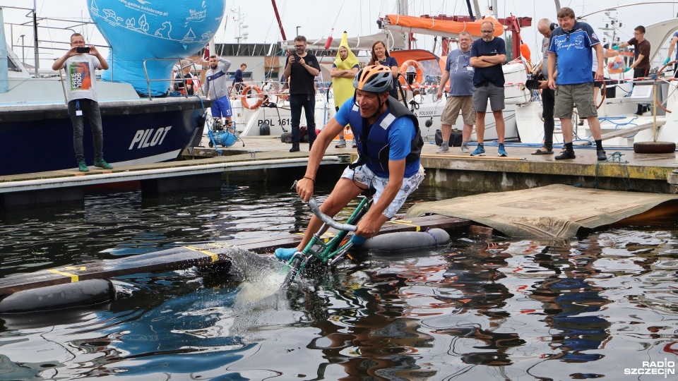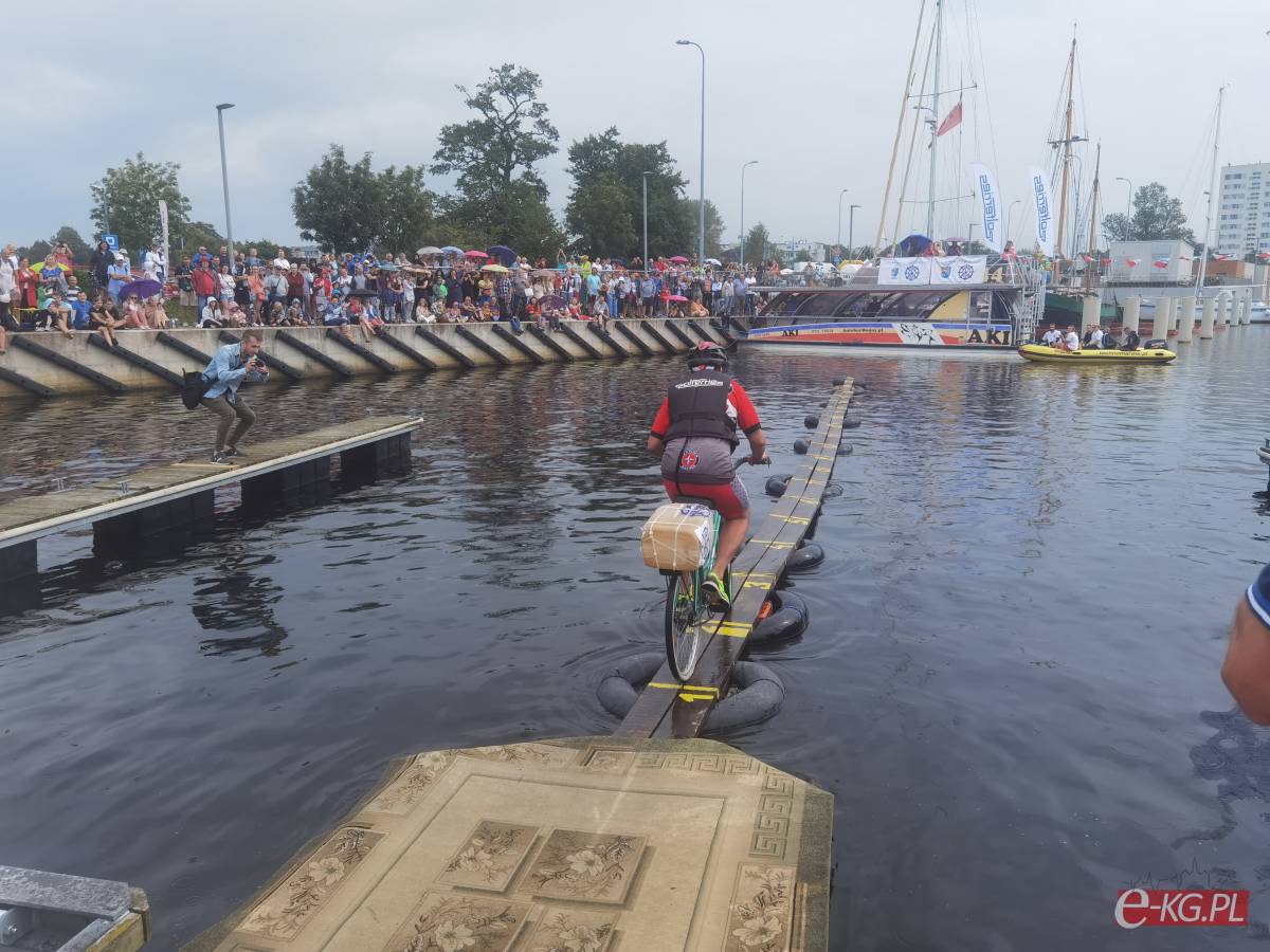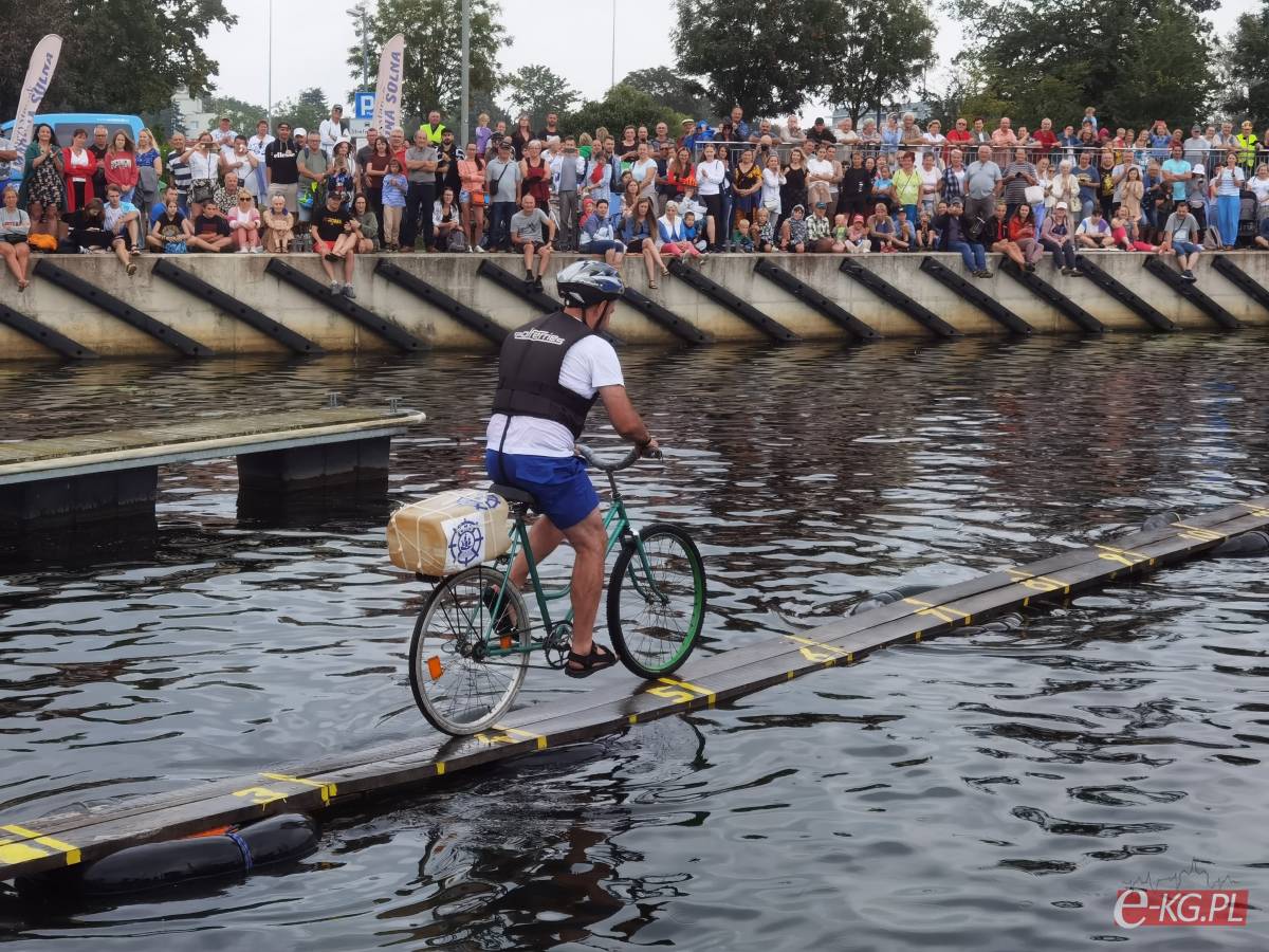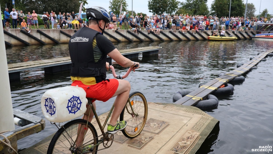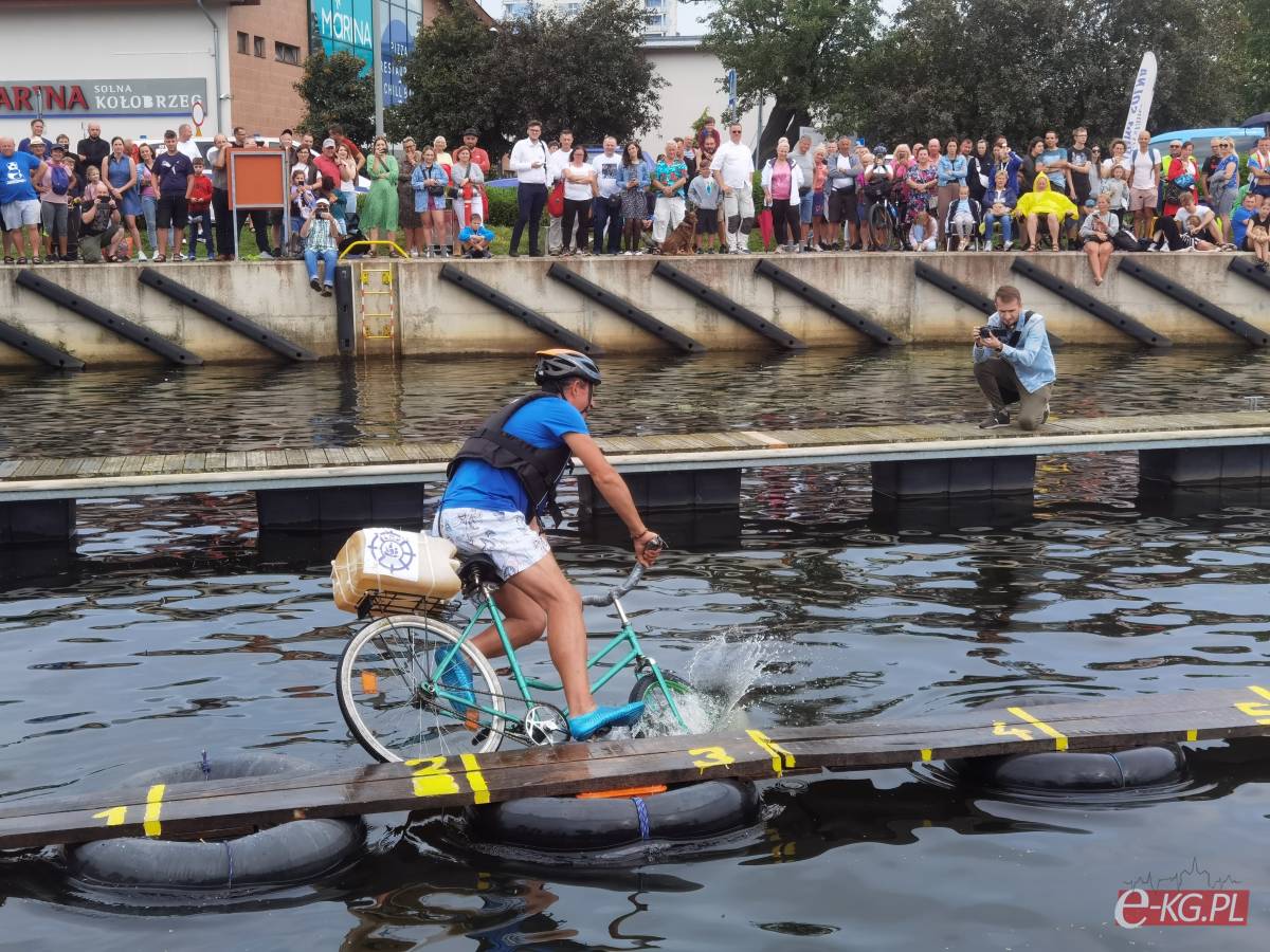 W minioną sobotę 26 sierpnia w kołobrzeskiej Marinie Solnej rozegrane zostały bardzo nietypowe zawody w jeździe rowerem po desce na wodzie. Pomysł ich rozgrywania zrodził się w niemieckim, partnerskim mieście Barth. To tam podczas dorocznych ,,Dni Zalewu i Zatoki” Klub Wioślarski Pommernexpress oprócz wyścigów smoczych łodzi organizował to niezwykle widowiskowe wydarzenie. Kołobrzeska Liga Morska i Rzeczna organizowała rejsy żeglarskie, po portach polskich i niemieckich. Celem podróży było właśnie Barth. Uczestnicy podziwiali śmiałków, którzy podejmowali wyzwanie pokonania 21 metrowej deski. Wśród nich najbardziej zapalonym był nieodżałowany Antoni Szarmach – prezes kołobrzeskiego Oddziału Ligi Morskiej i Rzecznej. Jako zapalony rowerzysta pierwszy spróbował przejechać nakazany dystans. Pokonał zaledwie trzy metry, ale gospodarze utworzyli specjalną klasyfikację zawodników zagranicznych. Był jedynym w tej kategorii, więc zdobył najwyższą nagrodę – termos. Dodatkowo gościnni gospodarze podarowali jeden segment konstrukcji jezdnej i przeszkodę w postaci garbu. To wszystko zostało zaształowane na jednej z łodzi i popłynęło do Kołobrzegu. Takie były początki. Na miejscu wykonano odpowiednie elementy składające się z platformy startowej, desek jezdnych, pływaków z dętek samochodowych i skrzynek po napojach. Pierwsze kołobrzeskie zawody rozegrano w Porcie Jachtowym na terenie starego basenu gdzie nie było jeszcze pomostów. Okazało się, że zawody zgromadziły licznych kibiców, a przede wszystkim zawodników. I tak każdego roku zwiększała się popularność zawodów.