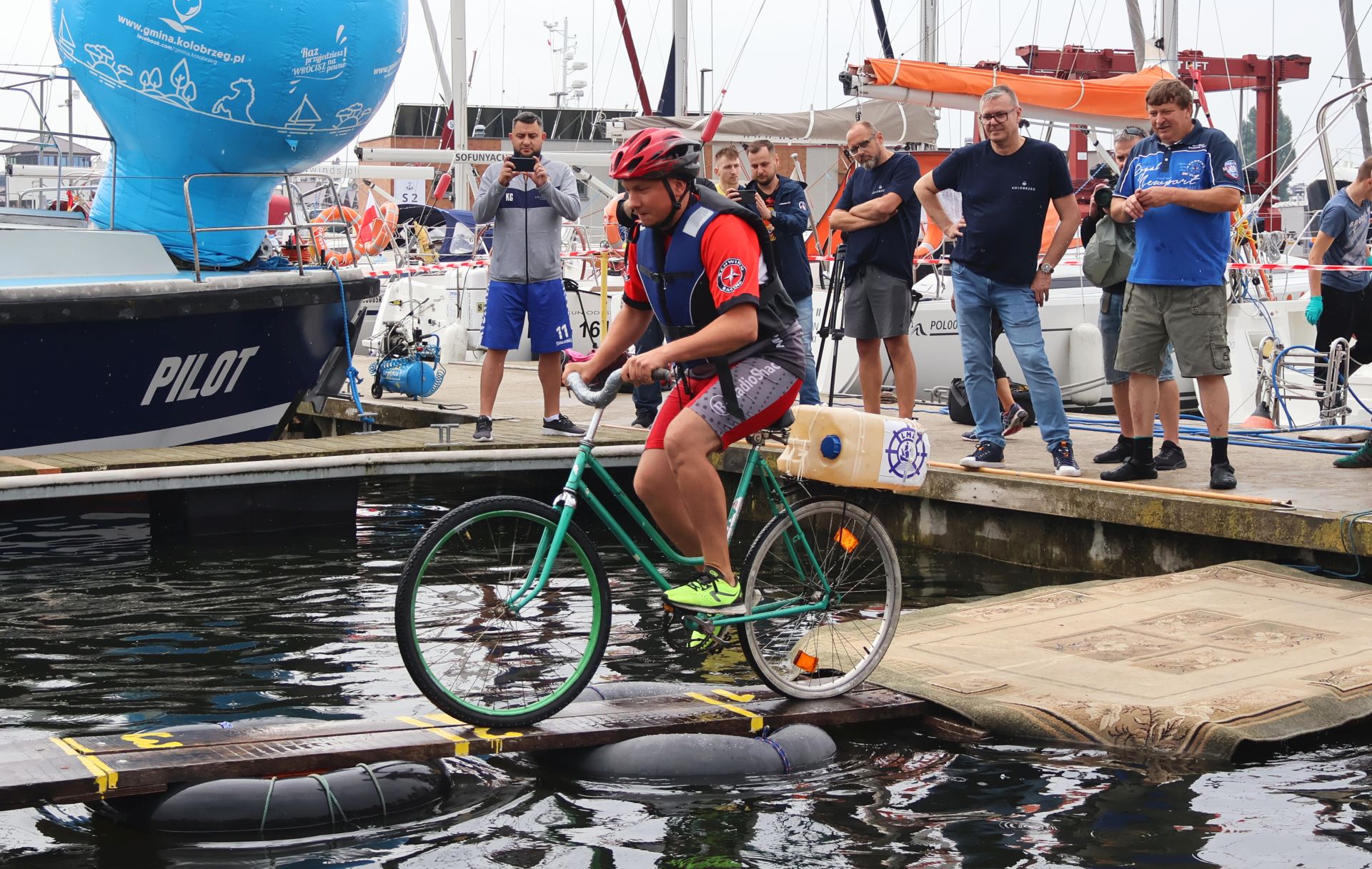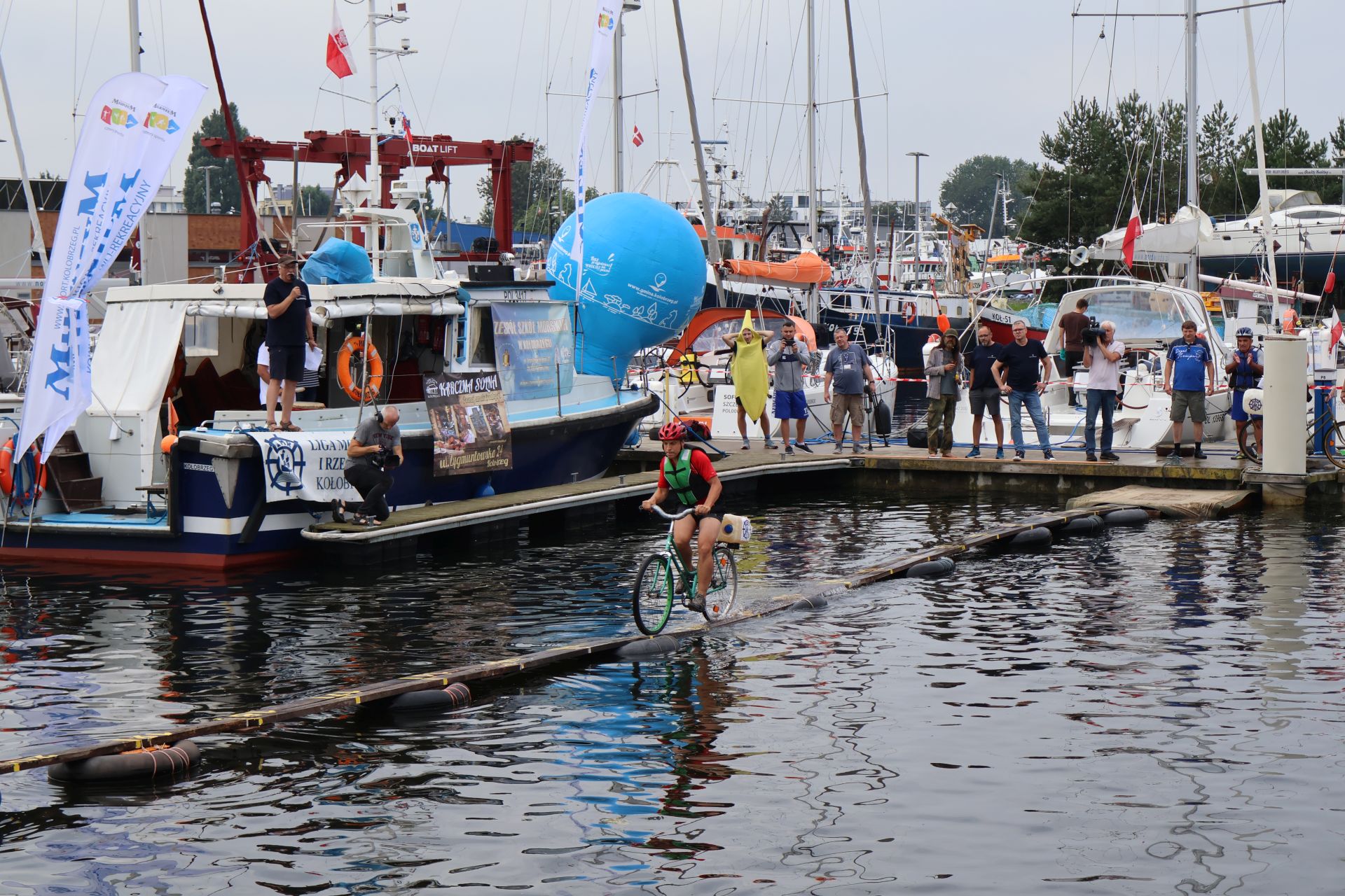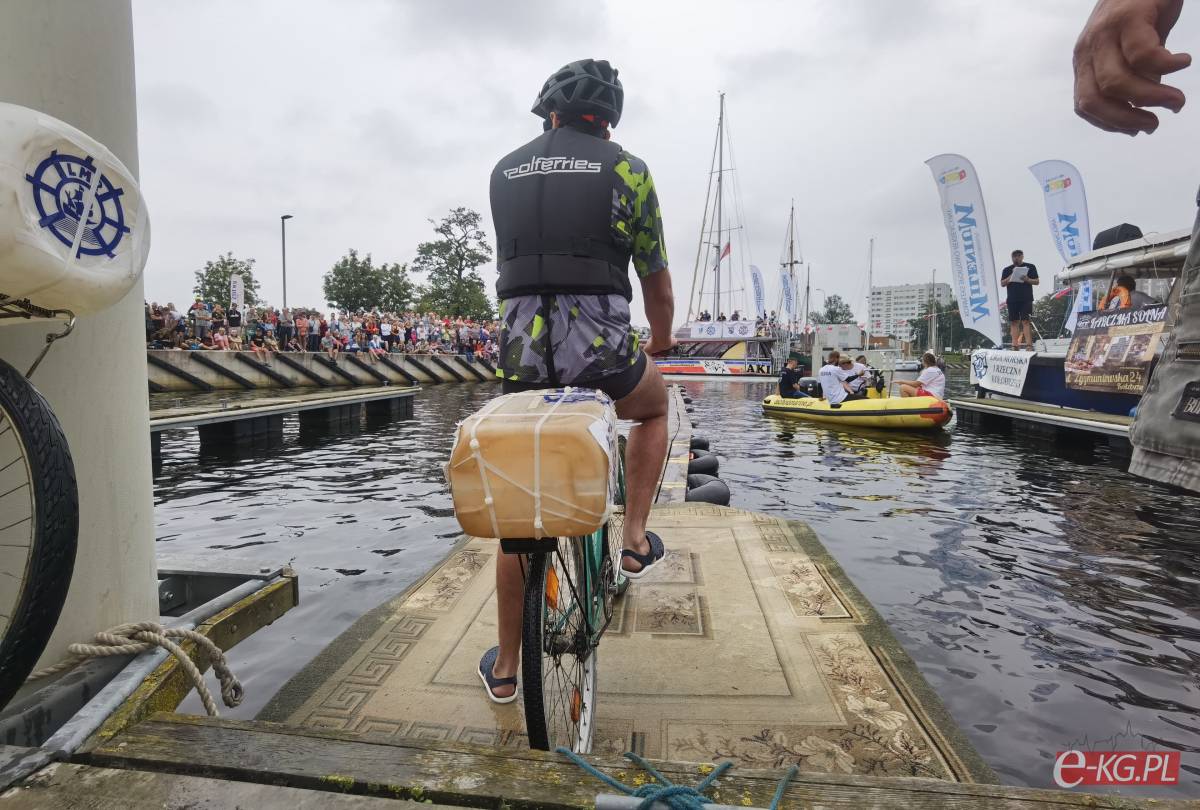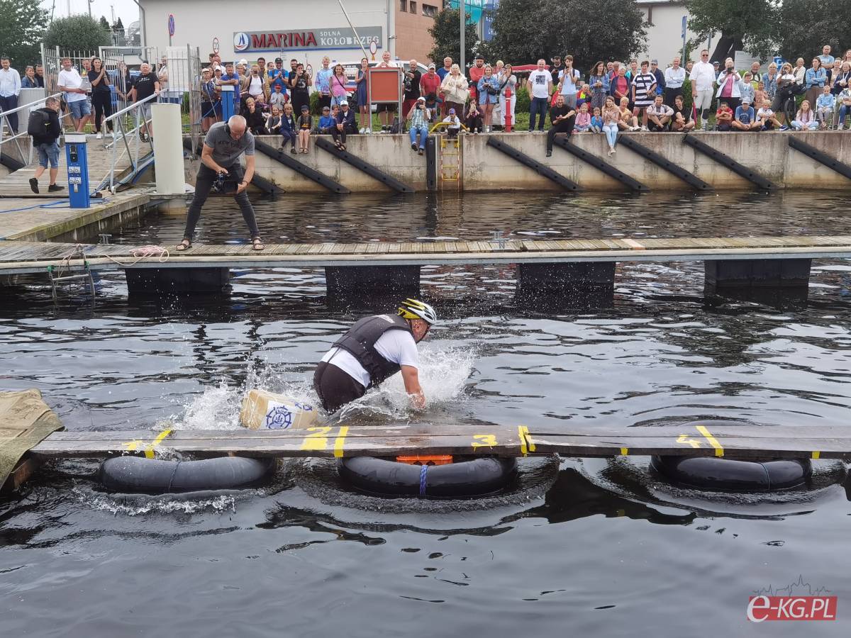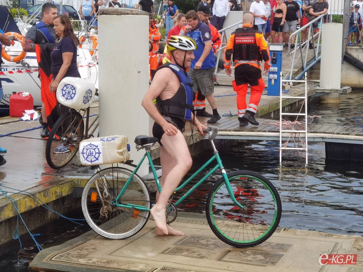 W minioną sobotę 26 sierpnia w kołobrzeskiej Marinie Solnej rozegrane zostały bardzo nietypowe zawody w jeździe rowerem po desce na wodzie. Pomysł ich rozgrywania zrodził się w niemieckim, partnerskim mieście Barth. To tam podczas dorocznych ,,Dni Zalewu i Zatoki” Klub Wioślarski Pommernexpress oprócz wyścigów smoczych łodzi organizował to niezwykle widowiskowe wydarzenie. Kołobrzeska Liga Morska i Rzeczna organizowała rejsy żeglarskie, po portach polskich i niemieckich. Celem podróży było właśnie Barth. Uczestnicy podziwiali śmiałków, którzy podejmowali wyzwanie pokonania 21 metrowej deski. Wśród nich najbardziej zapalonym był nieodżałowany Antoni Szarmach – prezes kołobrzeskiego Oddziału Ligi Morskiej i Rzecznej. Jako zapalony rowerzysta pierwszy spróbował przejechać nakazany dystans. Pokonał zaledwie trzy metry, ale gospodarze utworzyli specjalną klasyfikację zawodników zagranicznych. Był jedynym w tej kategorii, więc zdobył najwyższą nagrodę – termos. Dodatkowo gościnni gospodarze podarowali jeden segment konstrukcji jezdnej i przeszkodę w postaci garbu. To wszystko zostało zaształowane na jednej z łodzi i popłynęło do Kołobrzegu. Takie były początki. Na miejscu wykonano odpowiednie elementy składające się z platformy startowej, desek jezdnych, pływaków z dętek samochodowych i skrzynek po napojach. Pierwsze kołobrzeskie zawody rozegrano w Porcie Jachtowym na terenie starego basenu gdzie nie było jeszcze pomostów. Okazało się, że zawody zgromadziły licznych kibiców, a przede wszystkim zawodników. I tak każdego roku zwiększała się popularność zawodów.