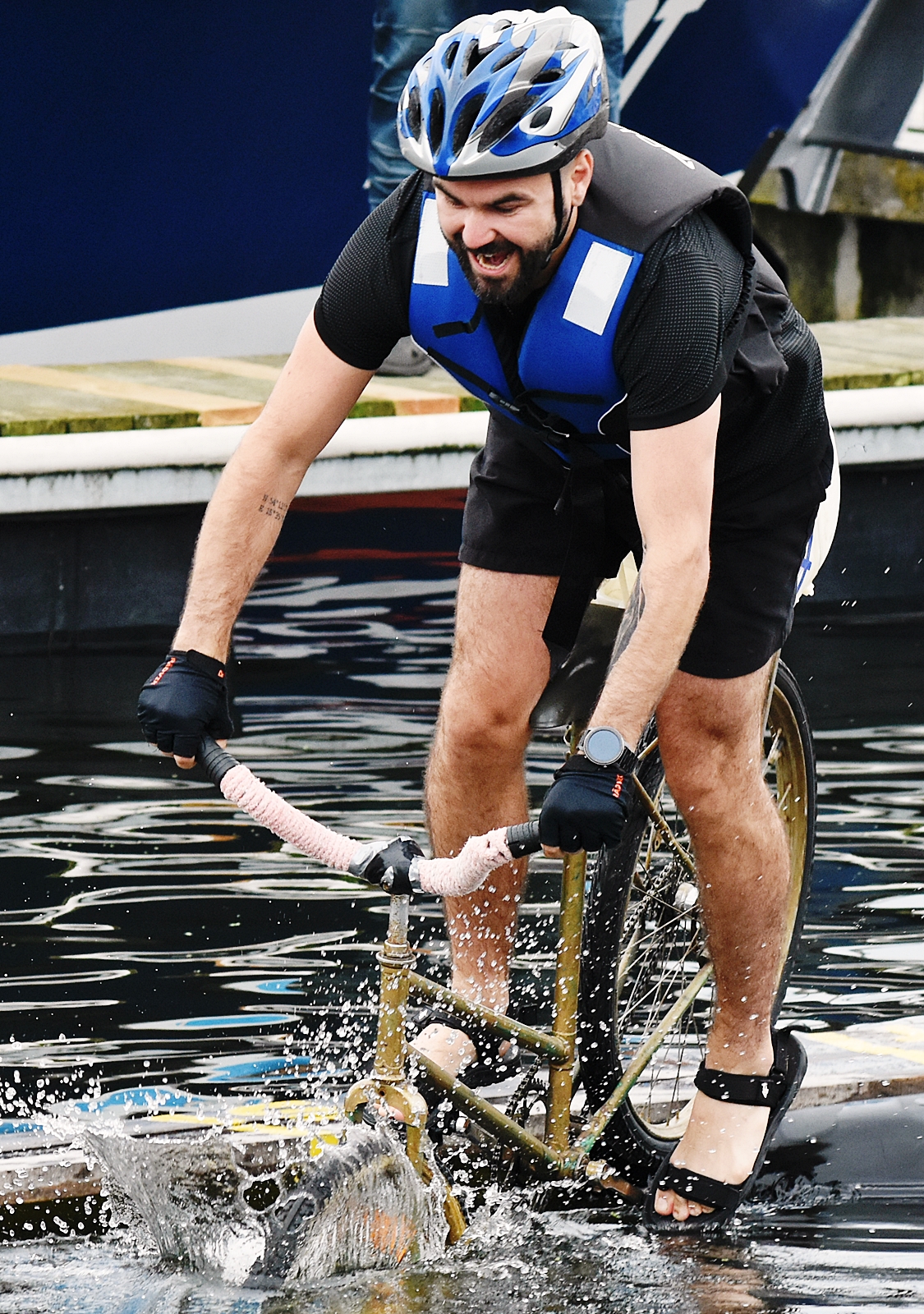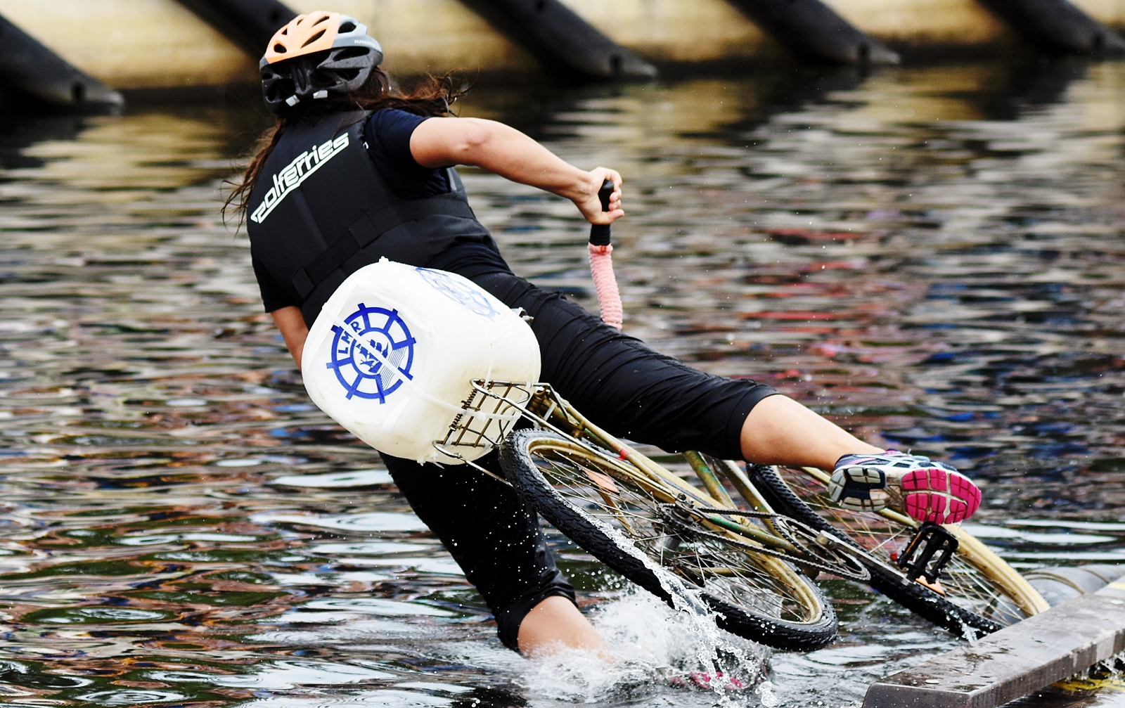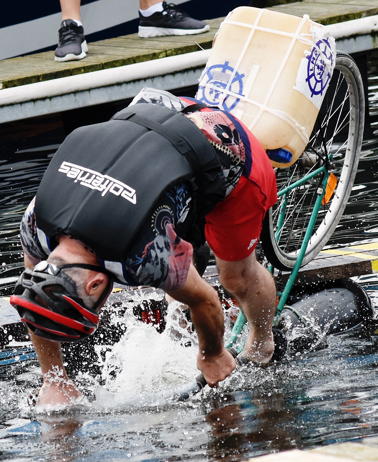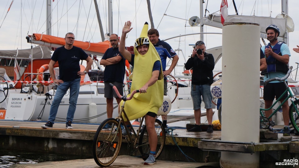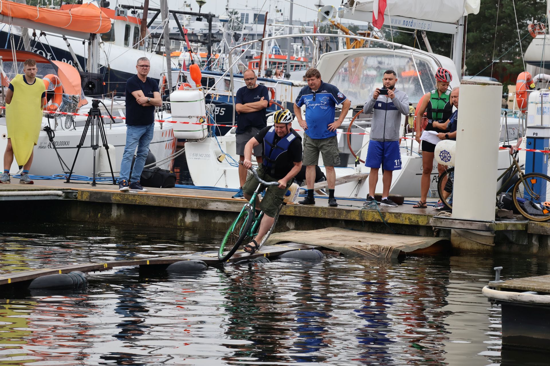 W minioną sobotę 26 sierpnia w kołobrzeskiej Marinie Solnej rozegrane zostały bardzo nietypowe zawody w jeździe rowerem po desce na wodzie. Pomysł ich rozgrywania zrodził się w niemieckim, partnerskim mieście Barth. To tam podczas dorocznych ,,Dni Zalewu i Zatoki” Klub Wioślarski Pommernexpress oprócz wyścigów smoczych łodzi organizował to niezwykle widowiskowe wydarzenie. Kołobrzeska Liga Morska i Rzeczna organizowała rejsy żeglarskie, po portach polskich i niemieckich. Celem podróży było właśnie Barth. Uczestnicy podziwiali śmiałków, którzy podejmowali wyzwanie pokonania 21 metrowej deski. Wśród nich najbardziej zapalonym był nieodżałowany Antoni Szarmach – prezes kołobrzeskiego Oddziału Ligi Morskiej i Rzecznej. Jako zapalony rowerzysta pierwszy spróbował przejechać nakazany dystans. Pokonał zaledwie trzy metry, ale gospodarze utworzyli specjalną klasyfikację zawodników zagranicznych. Był jedynym w tej kategorii, więc zdobył najwyższą nagrodę – termos. Dodatkowo gościnni gospodarze podarowali jeden segment konstrukcji jezdnej i przeszkodę w postaci garbu. To wszystko zostało zaształowane na jednej z łodzi i popłynęło do Kołobrzegu. Takie były początki. Na miejscu wykonano odpowiednie elementy składające się z platformy startowej, desek jezdnych, pływaków z dętek samochodowych i skrzynek po napojach. Pierwsze kołobrzeskie zawody rozegrano w Porcie Jachtowym na terenie starego basenu gdzie nie było jeszcze pomostów. Okazało się, że zawody zgromadziły licznych kibiców, a przede wszystkim zawodników. I tak każdego roku zwiększała się popularność zawodów.