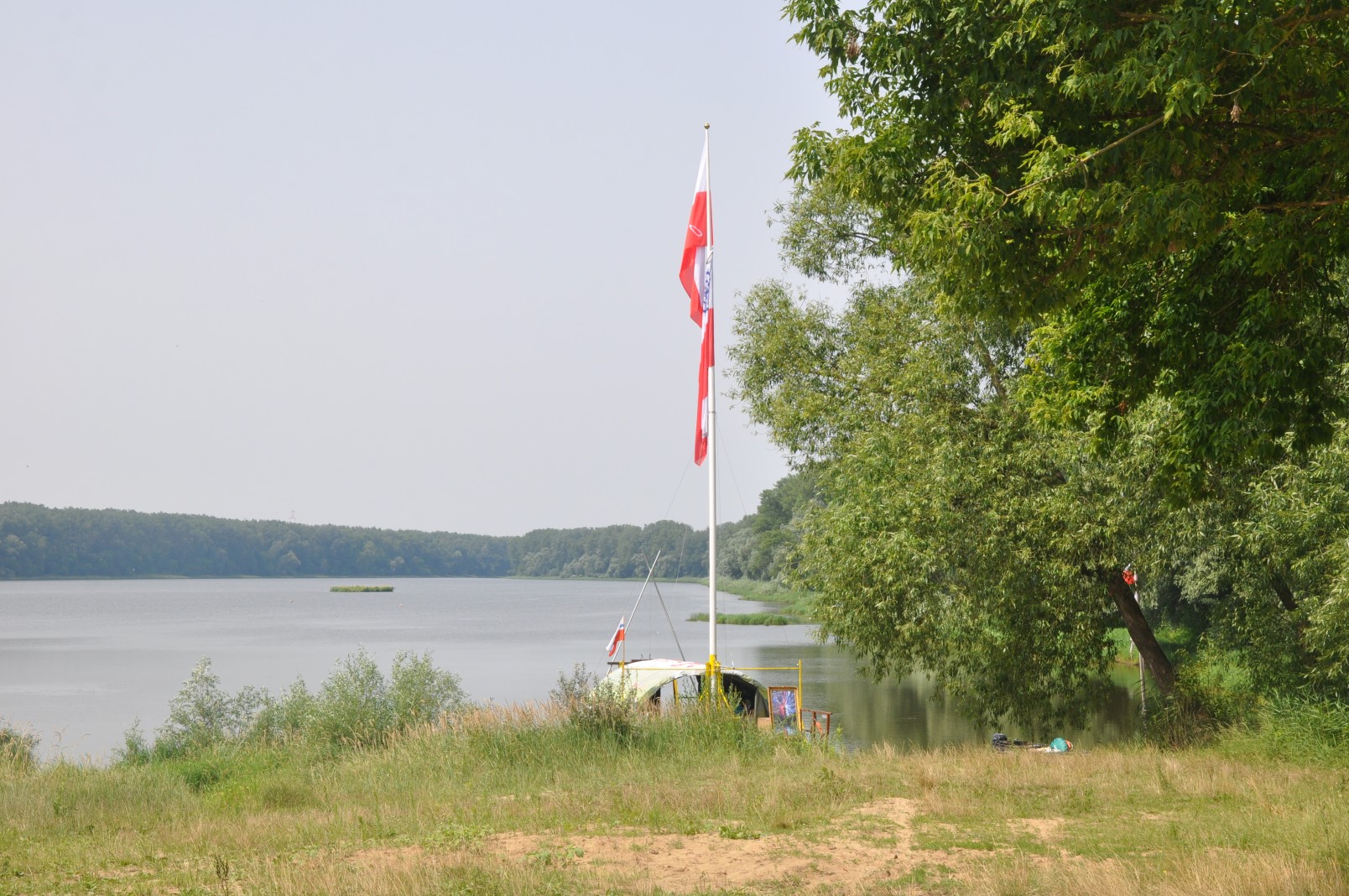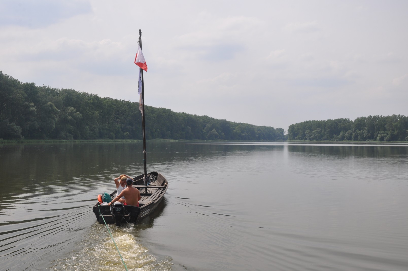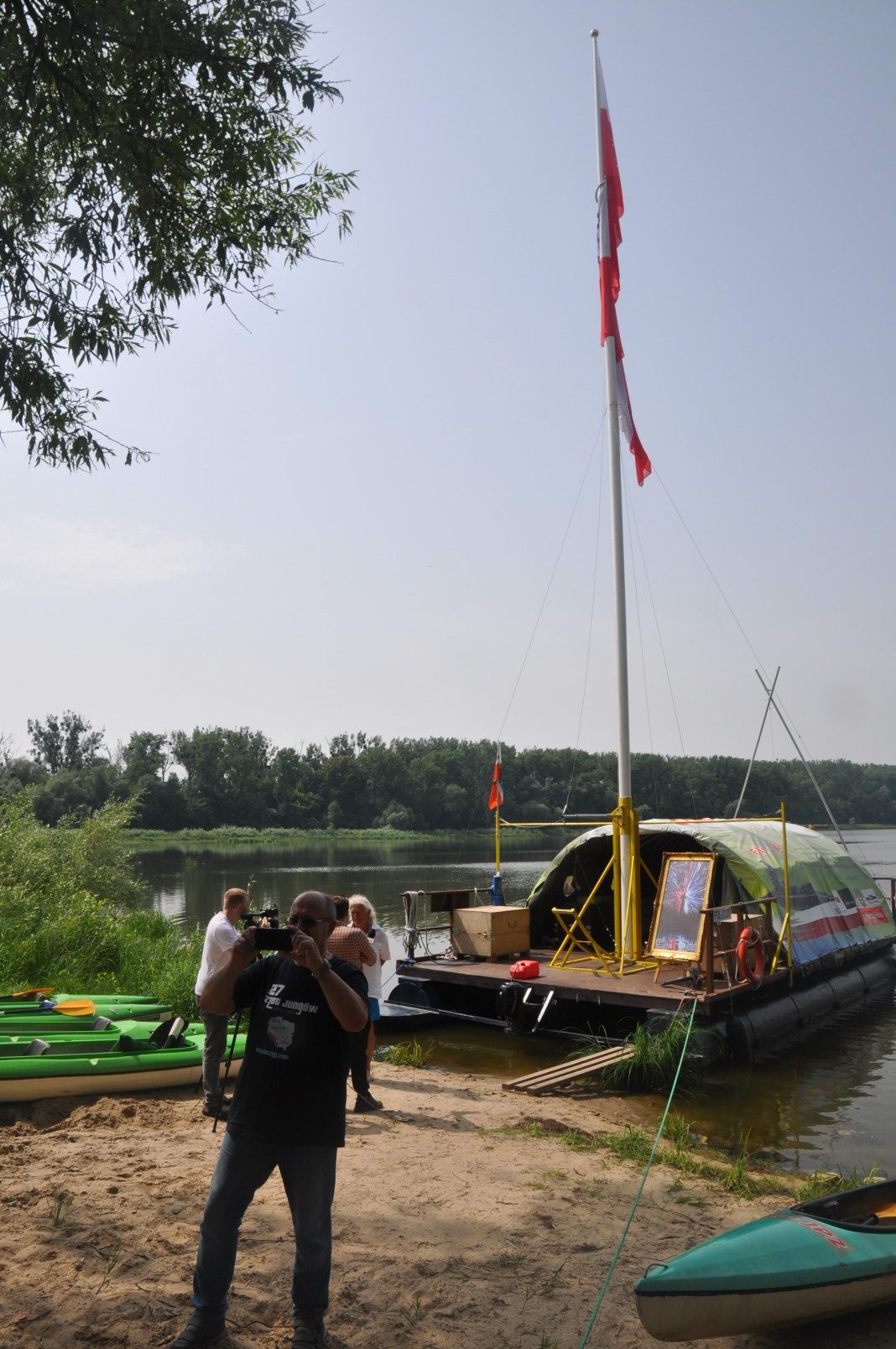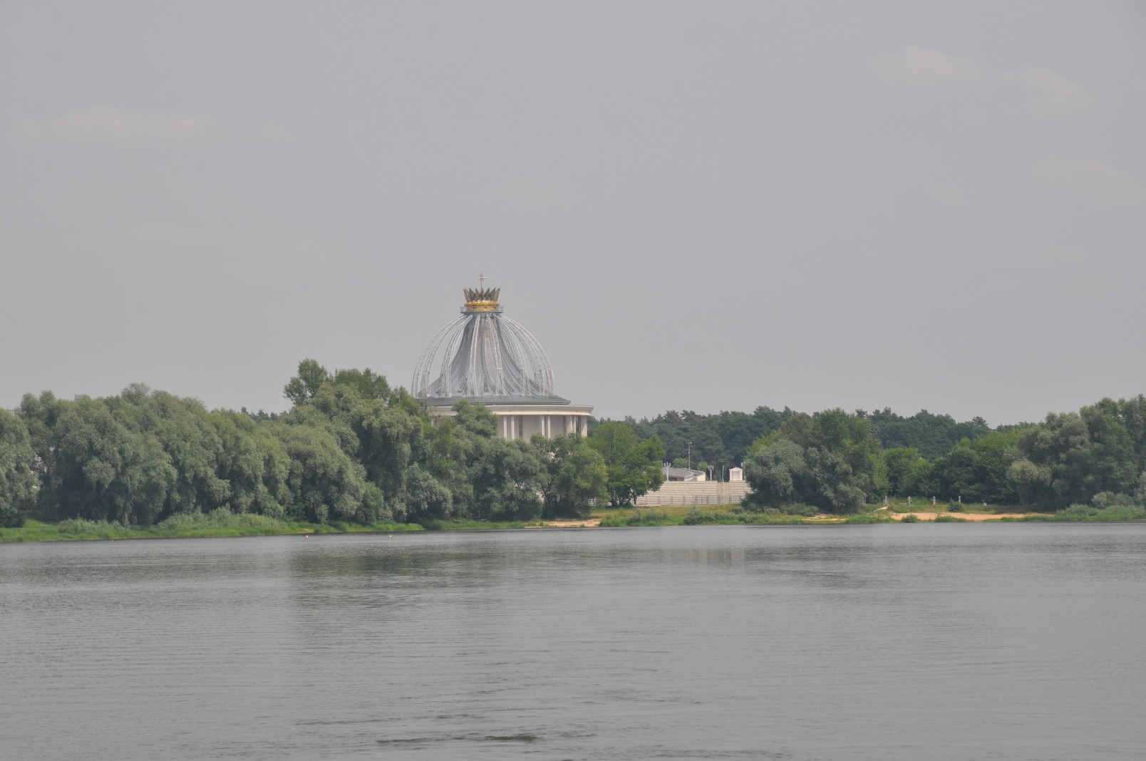 Neptun słodkich wód spowodował piękną pogodę, brak wiatru – wymarzone warunki do żeglugi i wiosłowania. Szybko osiągnęliśmy wysokość Portu Drzewnego. Kajaki mają małe zanurzenie. Nie martwimy się o wejście na mieliznę. Na pokładzie Pielgrzyma zostali Wojtek, Benia, Maciek i Roman, który dotarł do nas rano. Pozostali wiosłują. Na brzegach pełno ludzi opalających się i wędkarzy. Brzegi ze ściętą wikliną poustawianą w sterty jak kiedyś snopki zboża. Z tej wikliny robiło się materace do umacniania brzegów rzek i budowy główek zwanych też ostrogami. Teraz z tej wikliny powyrastały wierzby grube, wielkie, kruche, spróchniałe, połamane. Rzeka pusta, ani żywego ducha. Fotografujemy siebie i piękną przyrodę. Dopływamy do miejsca prowadzącego do Portu Drzewnego. Jest to tak naprawdę zatoka Wisły nad którą w ostatnich latach wyrósł kompleks Wyższej Szkoły Dziennikarstwa i Kultury Medialnej o. Rydzyka. Wpływamy pierwsi i sondujemy dno. Wszystko wskazuje, że będzie płytko , a nawet bardzo płytko i Pielgrzym może mieć problem z przejściem. Zmniejszają prędkość i uważnie, bardzo uważnie manewrują. Dodatkowo trzeba patrzeć w górę, aby nie zahaczyć o konary drzew. Przeszedł. Jest ok. Woda w Porcie Drzewnym jest stojąca, akwen osłoniony z obu stron wałami od wiatru. Długość Portu Drzewnego to około 3 km. To ponad pół godziny żeglugi. Podziwiamy przyrodę od strony wody, jest spokojnie, romantycznie i przecudnie. W oddali odsłania się majestatyczna kopuła Kościoła Najświętszej Maryi Panny Gwiazdy Nowej Ewangelizacji i św. Jana Pawła II. Robi wrażenie. Z wody wszystko wygląda zupełnie inaczej, piękniej. Po 30 minutach dochodzimy do miejsca cumowania. Na brzegu ekipa telewizyjna, kamery poszły w ruch. Załoga Pielgrzyma na galowo. Najbardziej efektownie prezentuje się Maciej. W górniczym mundurze ze szpadą u boku, to szczególny element górniczego munduru. Szpadę honorową dostaje się za wybitne zasługi w górnictwie. Maciej całe dorosłe życie pracował jako górnik. Z zamiłowania żeglarz i wspaniały gawędziarz. Na dziobie w pięknych złotych ramach obraz ,,Iskra”. Był z nami cały czas. Niesie w sobie przesłanie, że ta symboliczna Boża Iskra ogarnie cały świat. Powitanie i wywiady, które udzielają Wojtek i Ela. Mówią o wyprawie, myśli przewodniej i najbliższych planach. Za chwilę pomaszerujemy na Mszę Świętą. Świątynia powstała jako wotum wdzięczności za pontyfikat papieża Jana Pawła II.