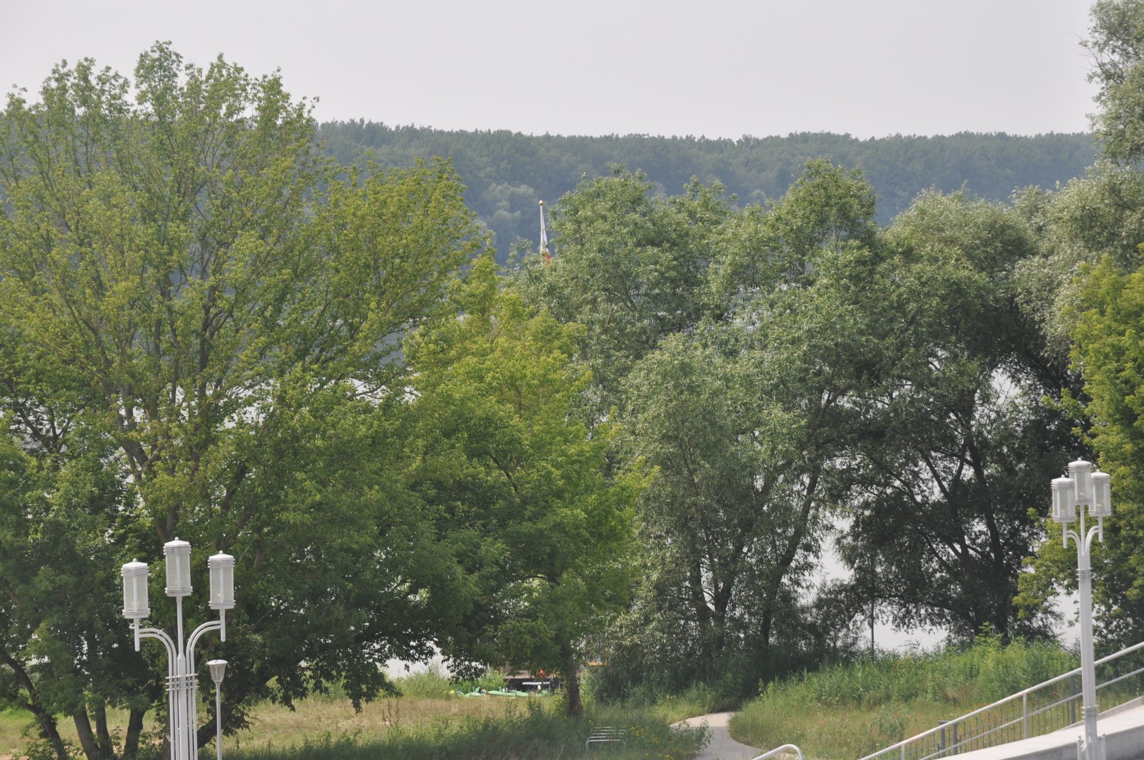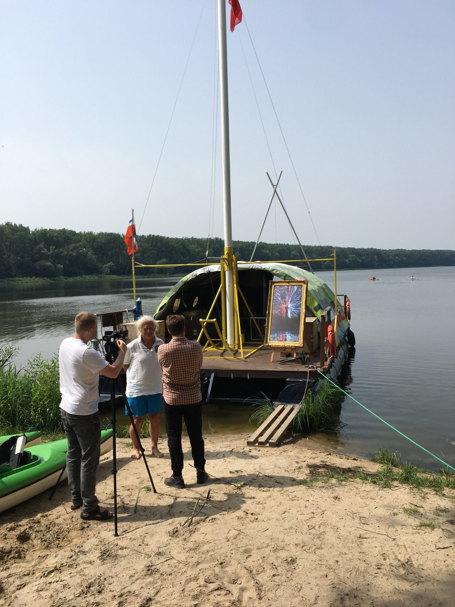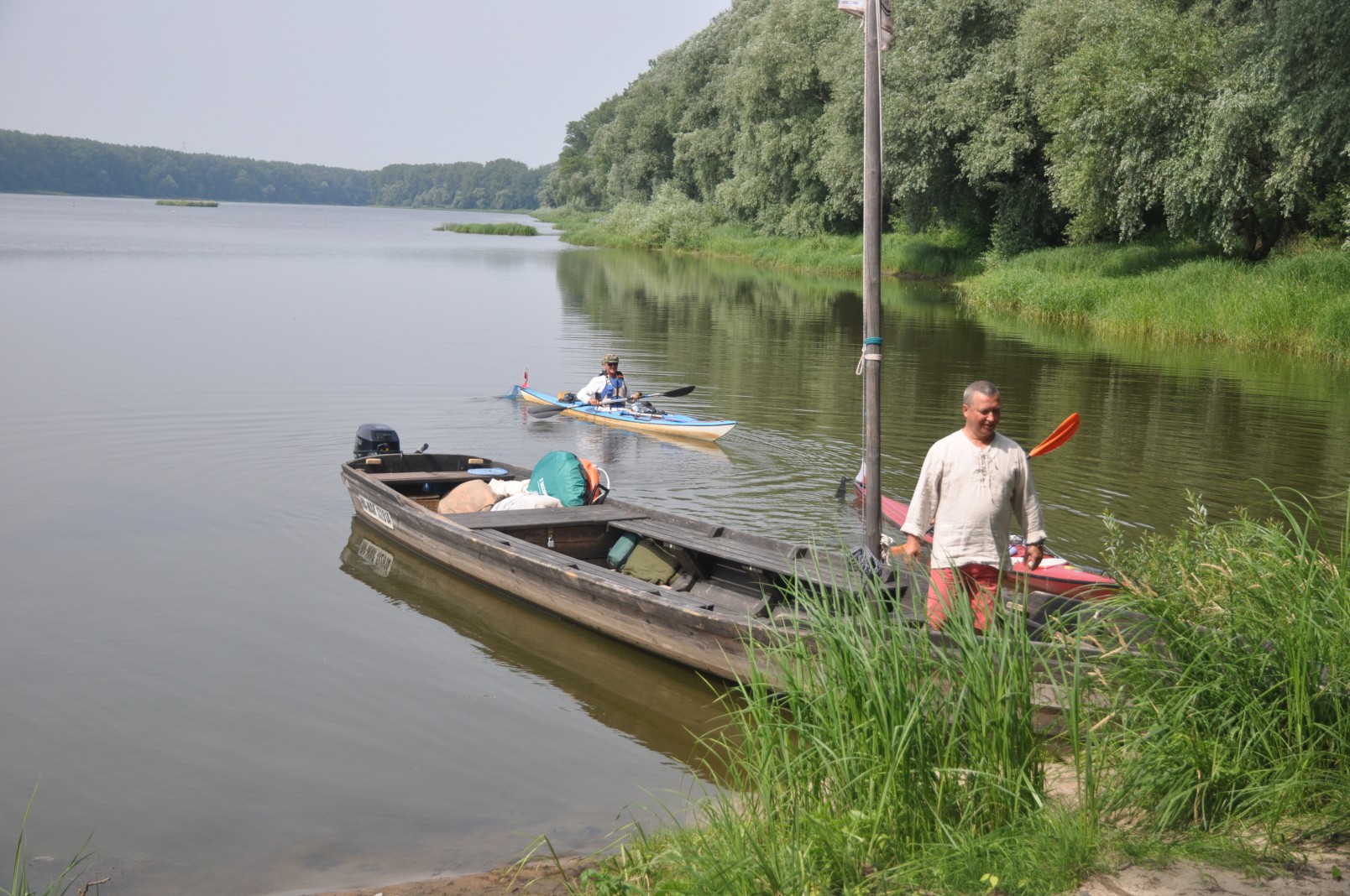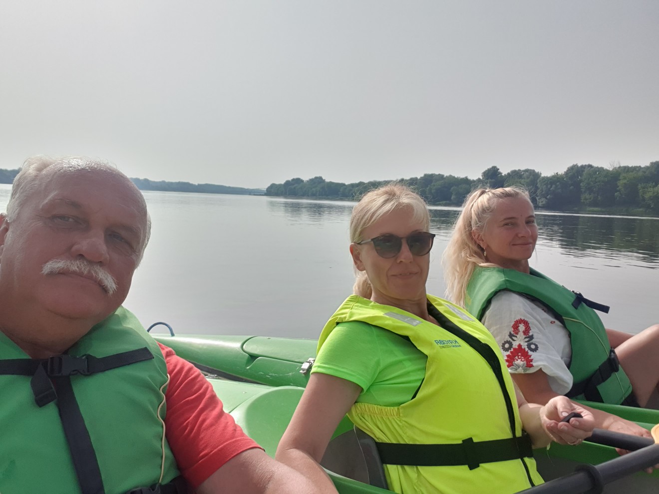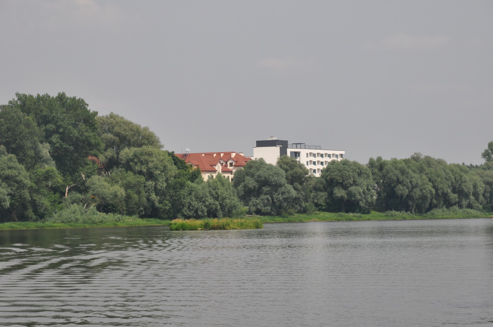 Neptun słodkich wód spowodował piękną pogodę, brak wiatru – wymarzone warunki do żeglugi i wiosłowania. Szybko osiągnęliśmy wysokość Portu Drzewnego. Kajaki mają małe zanurzenie. Nie martwimy się o wejście na mieliznę. Na pokładzie Pielgrzyma zostali Wojtek, Benia, Maciek i Roman, który dotarł do nas rano. Pozostali wiosłują. Na brzegach pełno ludzi opalających się i wędkarzy. Brzegi ze ściętą wikliną poustawianą w sterty jak kiedyś snopki zboża. Z tej wikliny robiło się materace do umacniania brzegów rzek i budowy główek zwanych też ostrogami. Teraz z tej wikliny powyrastały wierzby grube, wielkie, kruche, spróchniałe, połamane. Rzeka pusta, ani żywego ducha. Fotografujemy siebie i piękną przyrodę. Dopływamy do miejsca prowadzącego do Portu Drzewnego. Jest to tak naprawdę zatoka Wisły nad którą w ostatnich latach wyrósł kompleks Wyższej Szkoły Dziennikarstwa i Kultury Medialnej o. Rydzyka. Wpływamy pierwsi i sondujemy dno. Wszystko wskazuje, że będzie płytko , a nawet bardzo płytko i Pielgrzym może mieć problem z przejściem. Zmniejszają prędkość i uważnie, bardzo uważnie manewrują. Dodatkowo trzeba patrzeć w górę, aby nie zahaczyć o konary drzew. Przeszedł. Jest ok. Woda w Porcie Drzewnym jest stojąca, akwen osłoniony z obu stron wałami od wiatru. Długość Portu Drzewnego to około 3 km. To ponad pół godziny żeglugi. Podziwiamy przyrodę od strony wody, jest spokojnie, romantycznie i przecudnie. W oddali odsłania się majestatyczna kopuła Kościoła Najświętszej Maryi Panny Gwiazdy Nowej Ewangelizacji i św. Jana Pawła II. Robi wrażenie. Z wody wszystko wygląda zupełnie inaczej, piękniej. Po 30 minutach dochodzimy do miejsca cumowania. Na brzegu ekipa telewizyjna, kamery poszły w ruch. Załoga Pielgrzyma na galowo. Najbardziej efektownie prezentuje się Maciej. W górniczym mundurze ze szpadą u boku, to szczególny element górniczego munduru. Szpadę honorową dostaje się za wybitne zasługi w górnictwie. Maciej całe dorosłe życie pracował jako górnik. Z zamiłowania żeglarz i wspaniały gawędziarz. Na dziobie w pięknych złotych ramach obraz ,,Iskra”. Był z nami cały czas. Niesie w sobie przesłanie, że ta symboliczna Boża Iskra ogarnie cały świat. Powitanie i wywiady, które udzielają Wojtek i Ela. Mówią o wyprawie, myśli przewodniej i najbliższych planach. Za chwilę pomaszerujemy na Mszę Świętą. Świątynia powstała jako wotum wdzięczności za pontyfikat papieża Jana Pawła II.