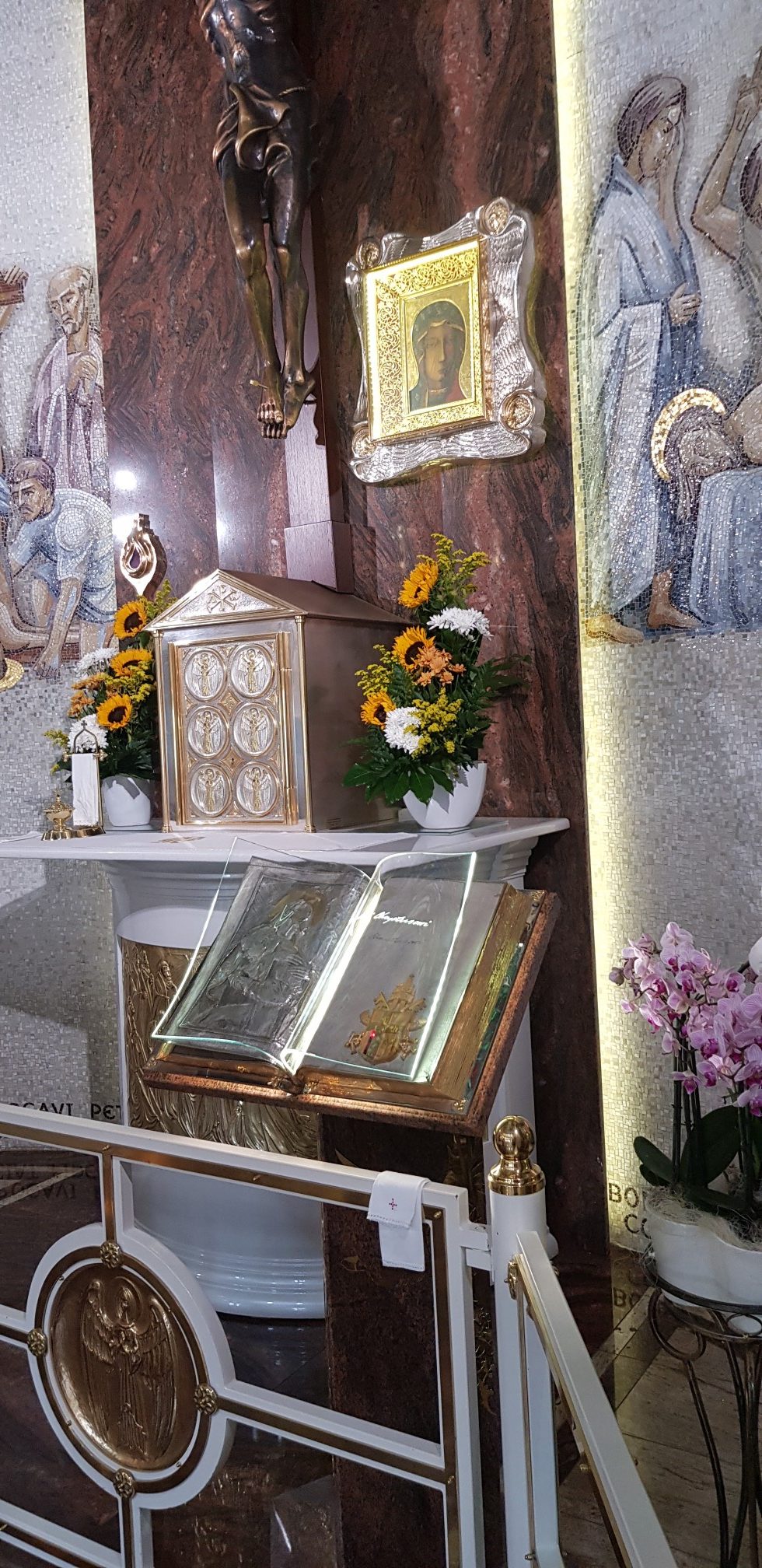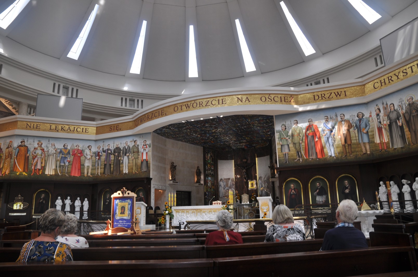 Ojciec Andrzej Laskosz CSsR kustosz sanktuarium przewodniczy celebrze. W kazaniu mówi o załodze Tratwy Pielgrzym i jej misji. Podkreśla, ,,…że każdy trud i wysiłek dla Boga się opłaca…załoga tratwy Pielgrzym pokonała wodą wiele kilometrów aby dotrzeć w to miejsce”. Jest nam niezwykle miło, czujemy się docenieni, że te dwa tygodnie dały nam tak wiele. Przede wszystkim umocniły nas duchowo. Na pamiątkę otrzymujemy albumy poświęcone historii sanktuarium. Podziękowania, krótki spacer wokół budowli i wracamy na Pielgrzyma. Żegnamy Benię i Macieja, którzy wracają do domu.