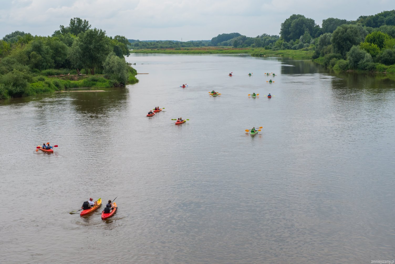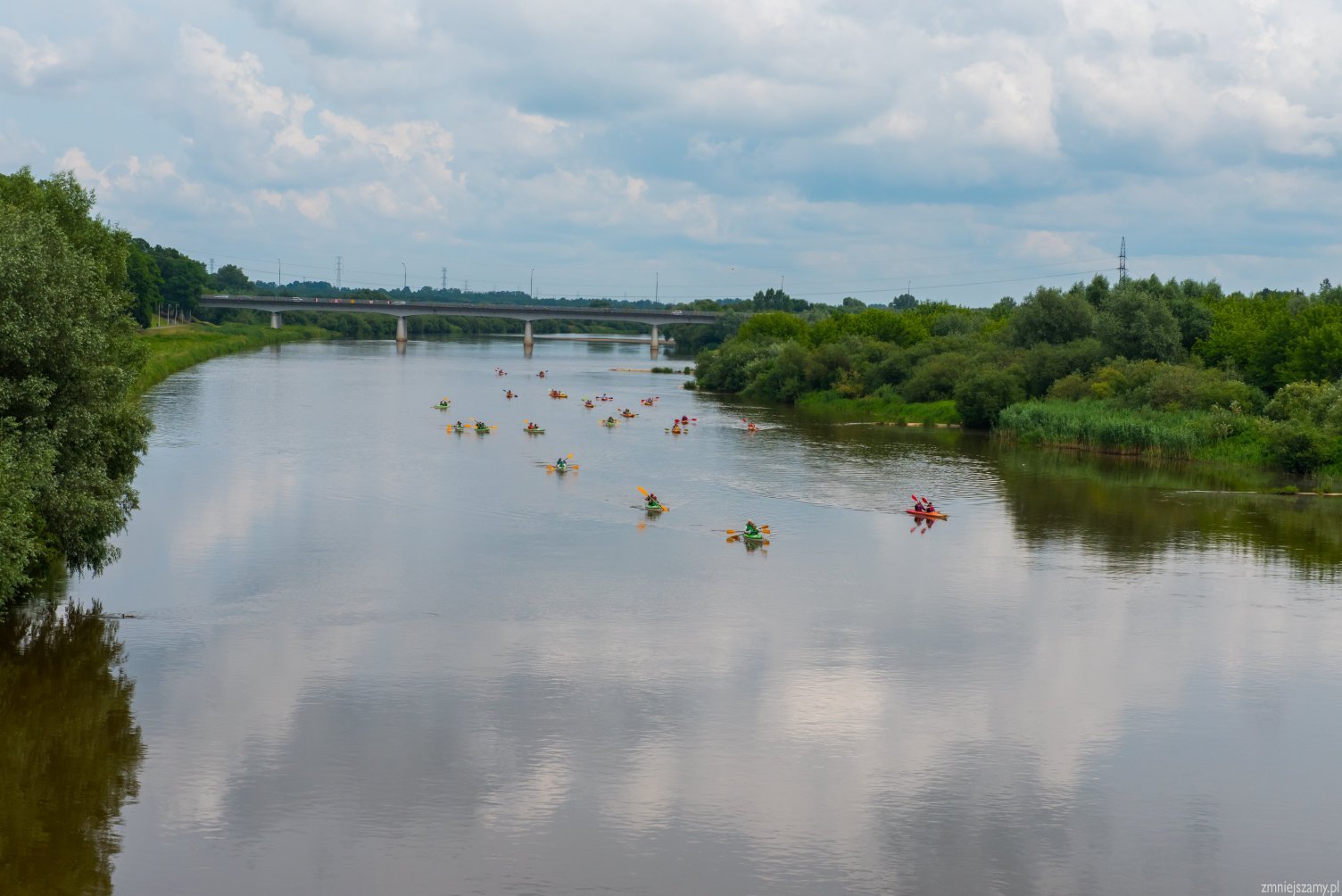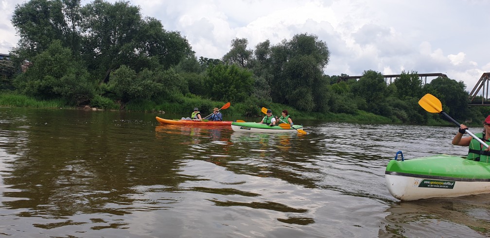 Ruszają, kawalkada kajaków wyrusza w kierunku Popowa. Nasza żegluga zaczyna się na 34,5 km do ujścia Bugu do Narwi. Przepływamy pod mostem kolejowym na linii Ostrołęka – Tłuszcz. Niby zwykły żelazny most kolejowy, ale to właśnie na nim kręcone były sceny do filmów: „Katyń” – Andrzeja Wajdy, ”Przedwiośnie” – Filipa Bajona, a także do „Czterech Pancernych”. Rzeka Bug doskonale nadaje się do rozpoczęcia przygody z kajakiem i do spływów rodzinnych. Uznawana jest za jeden z ciekawszych szlaków kajakowych w Polsce. W Europie jest to jedna z ostatnich tak dużych rzek o praktycznie nienaruszonej przez człowieka strukturze. Na trasie będziemy mijać wielokrotnie białe znaki kilometrażu rzeki. Oznaczają one długość rzeki liczoną od jej ujścia do Zalewu Zegrzyńskiego. Liczne mielizny i wyspy oznaczone są tyczkami biało-czerwonymi – oznaczającymi prawą stronę szlaku (przepływamy mając je z prawej strony) oraz biało-zielonymi – oznaczającymi stronę lewą (przepływamy mając je z lewej strony). Aby uniknąć często rozległych i licznych mielizn należy o tym pamiętać. Bug jest naprawdę pokręconą rzeką. Tworzą go liczne meandry wśród lasów i pól, niesamowite wysepki z plażami, często porośnięte wierzbą. Jest to rzeka szeroka, najwęższe miejsca mają ok. 50m a najszersze ok. 200m.