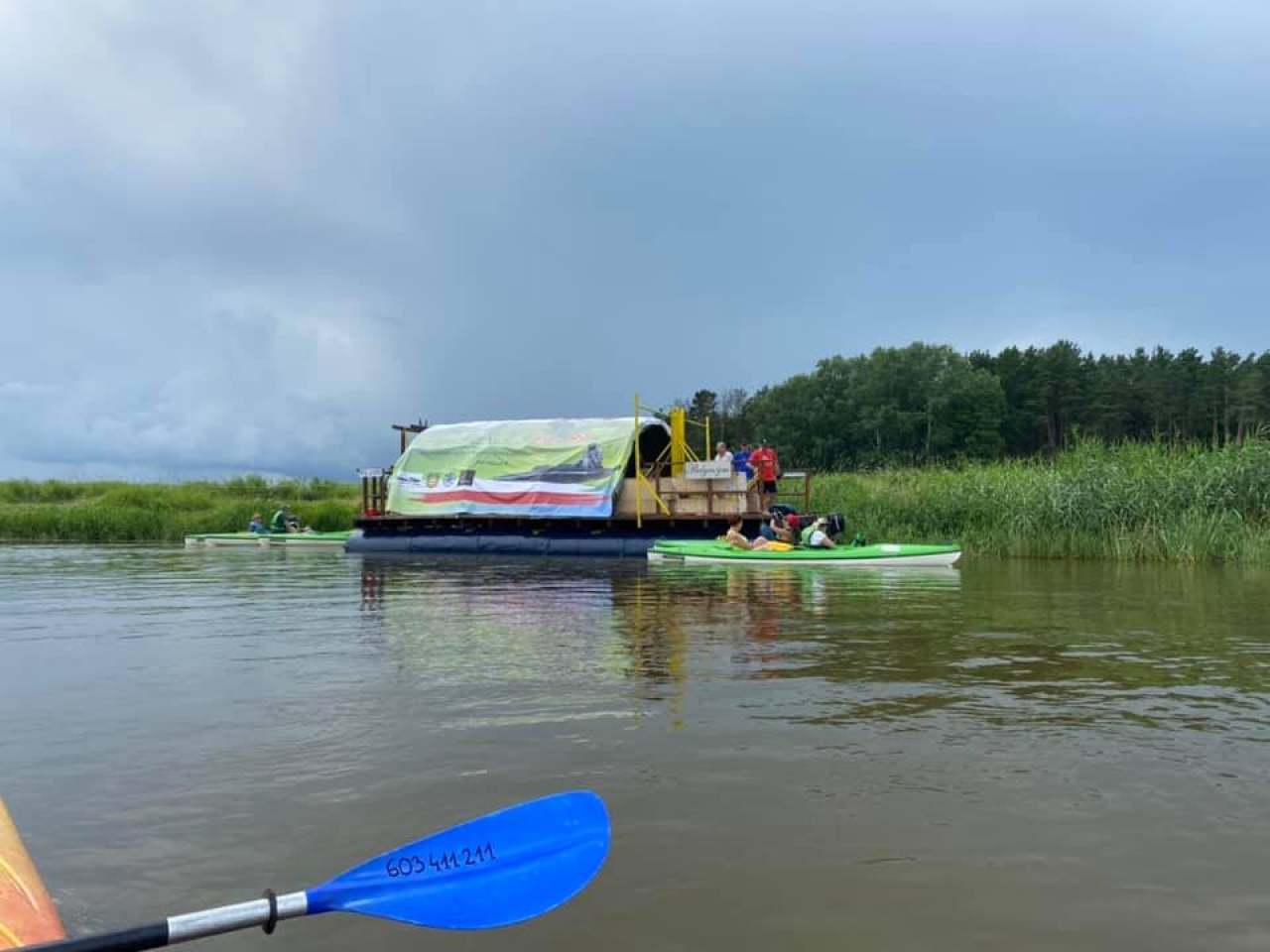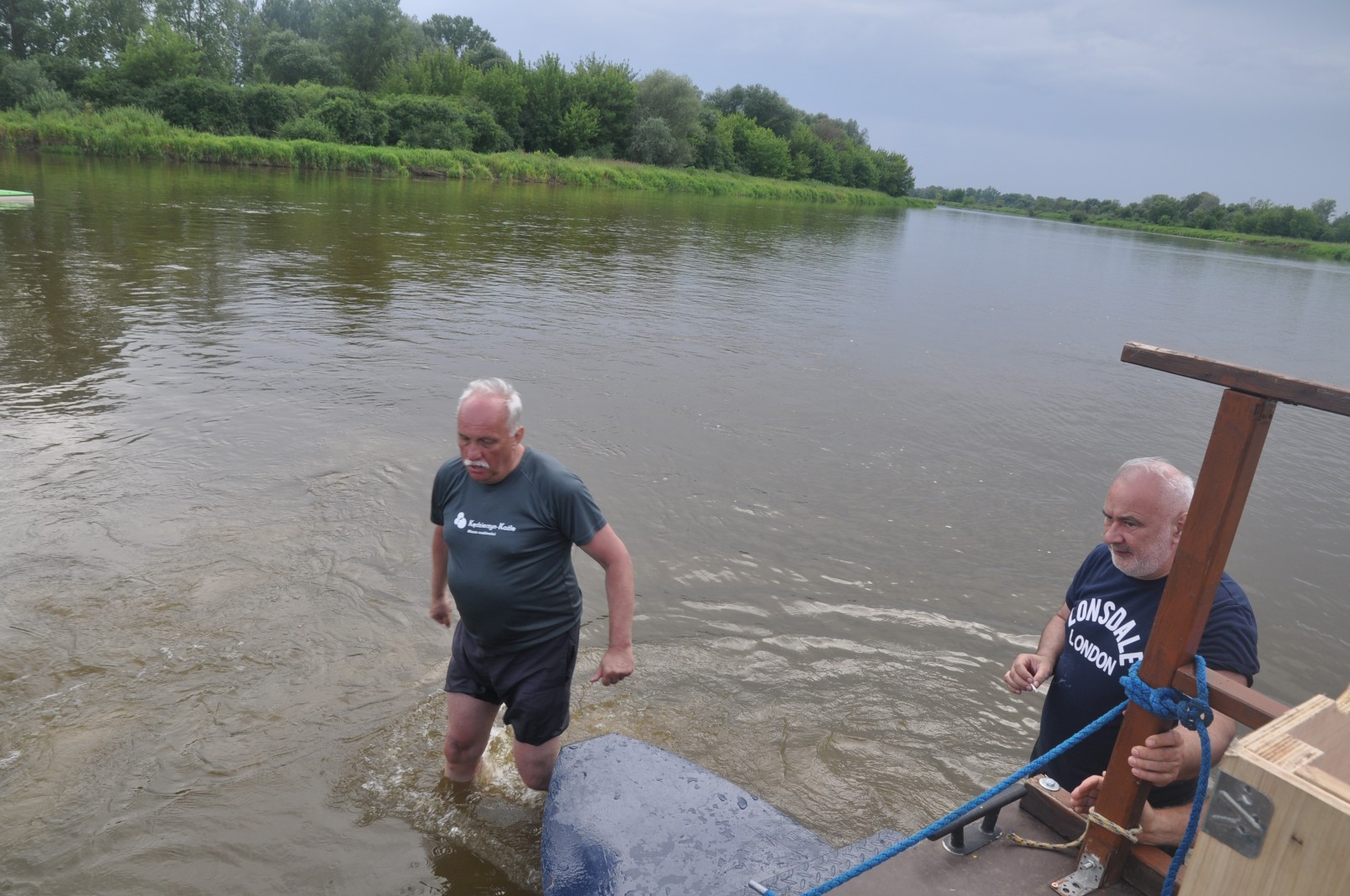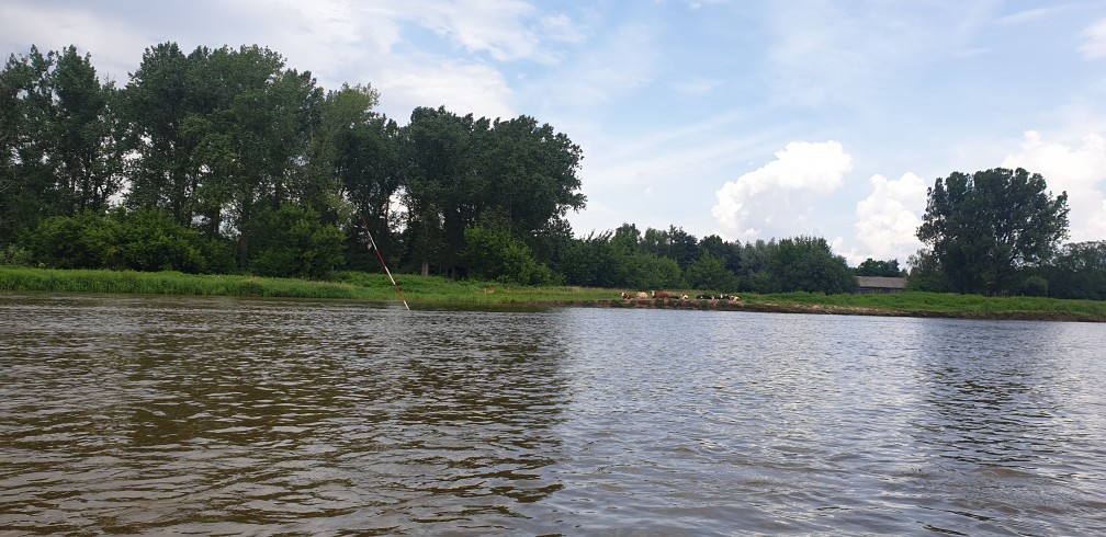 Gulczewo – To ostatni etap spływu. Rzeka staje się mniej kręta, a na prawym brzegu ciągnie się właściwie bez przerwy letniskowa zabudowa. Rzeka ma coraz bardziej bagienny charakter, stąd coraz liczniejsze starorzecza i odnogi po obu stronach. Dopływamy do Barcic. Tu na prawym brzegu zacumowana, czeka na nas tratwa Pielgrzym. Załoganci gotowi do drogi. Po krótkim odpoczynku uruchamiamy silniki i w towarzystwie kajakarzy ruszamy w stronę Popowa Kościelnego. Mimo małego obciążenia nie udaje się pokonać trasy bez wejścia na mieliznę. Chwila nieuwagi i prawy kadłub wbija się w piaszczystą łachę. Pomagają nam strażacy z OSP Popowo i niezastąpiony Rysiu ze swoim sprzętem – dziękujemy. Popowo Kościelne, nad rękawem starorzecza z prawej kościół neogotycki; u połączenia rzeki ze starorzeczem ośrodek wypoczynkowy. Cumujemy na przystani i już na nogach idziemy do remizy OSP. Tu królewskie przyjęcie. Czekają przyjaciele. Wspólne rozmowy nie mają końca i toczą się do późnej nocy. Jutro niedziela i kolejny etap spływu do Nieporętu.