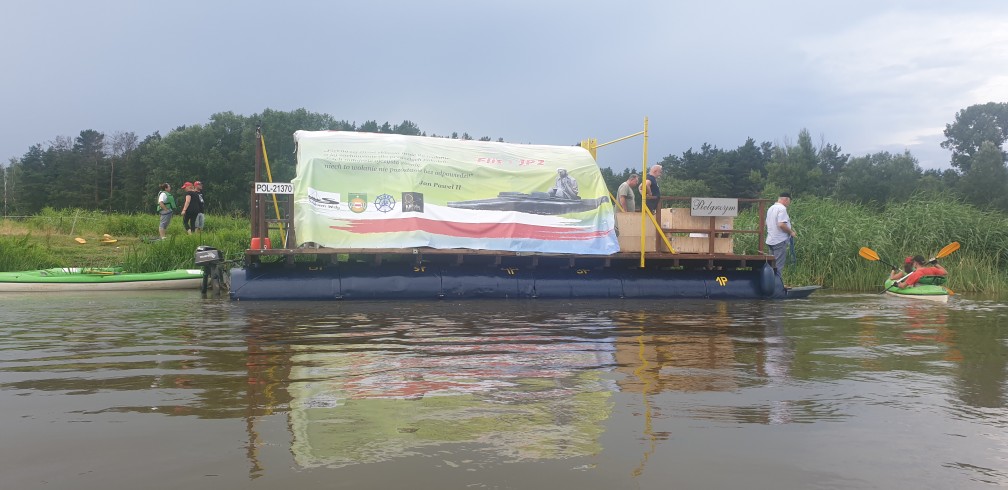 Nadszedł ten najważniejszy dzień. Na 3 sierpnia w sobotę zaplanowano rozpoczęcie eskapady. Niestety ze względu na niski stan wody na Bugu, tratwa Pielgrzym musiała pozostać w Barcinie i tam czekać na kajakarzy. Załoga przesiadła się na kajaki. Na wyszkowskiej plaży zebrało się wielu miłośników wioślarstwa. Z kajaków ułożono napis ,,Flis JP II”. Przybyli przedstawiciele władz, samorządu, różnych organizacji, a przede wszystkim ci, którzy poprzez aktywne uczestnictwo w spływie postanowili przepłynąć trasę i uczcić pamięć Św. Jana Pawła II. Wszystkich zebranych przywitała Elżbieta Kasińska – prezes wyszkowskiego Oddziału LMiR. Kolejnymi mówcami byli: Grzegorz Nowosielski – burmistrz Wyszkowa, Marek Padjas – wiceprezes LMiR, Wojciech Chodkowski – budowniczy tratwy Pielgrzym, Adam Grześkiewicz – Prezes Zarządu Stowarzyszenia Miłośników Rybienka Leśnego i Okolic. Na zakończenie modlitwę w intencji wszystkich zebranych odmówił ksiądz ……Karaś proboszcz parafii Św. Wojciecha. W swojej modlitwie wspomniał o zmarłych członkach załogi tratwy Pielgrzym: Krzysztofie Jarząbku, Antonim Szarmachu i Czesławie Waldemarze Budzyniu, którzy tworzą ,,Niebieską Załogę Tratwy Pielgrzym”.