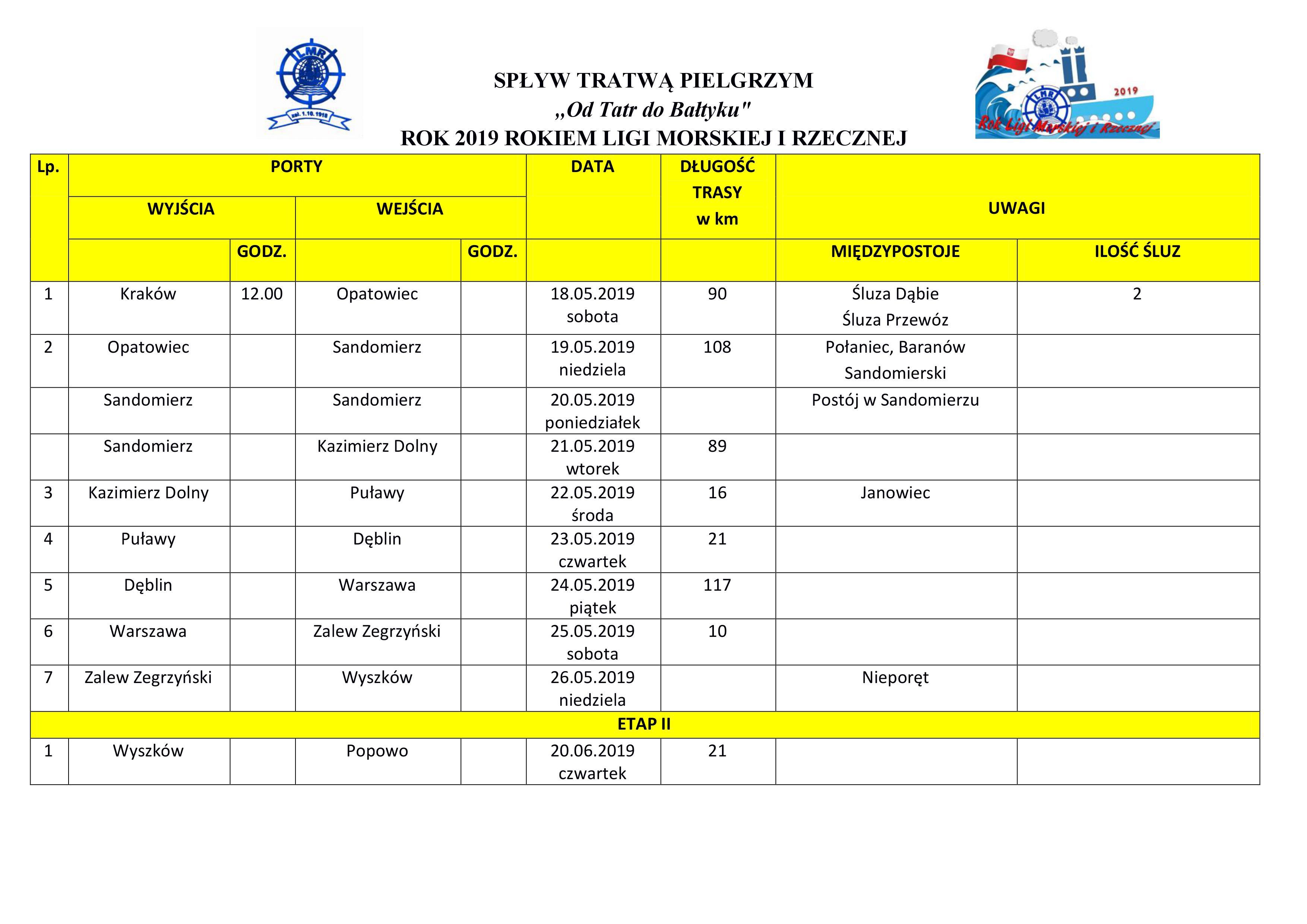 Wielkim, naturalnym dobrem narodowym Polski jest dostęp do morza oraz posiadanie śródlądowych dróg wodnych. Potencjał wynikający z tego bogactwa powinien być jedną z ważnych podstaw przyszłego rozwoju kraju. Rok 2019 został ogłoszony rokiem Ligi Morskiej i Rzecznej. Z tej okazji stowarzyszenie organizuje Spływ Tratwą z Krakowa do Kołobrzegu. Inaugurację ekspedycji zaplanowano na 18 maja 2019 roku w Krakowie, skąd Wisłą, Bugiem Narwią, Notecią, Odrą, przez Zalew Szczeciński i Morze Bałtyckie, aż do Kołobrzegu. Na pokładzie tratwy popłyną przedstawiciele różnych środowisk, zawodów i zainteresowań. Młodzież i dorośli. Uczestnicy rejsu odwiedzą wiele miejscowości niosąc przesłanie o ich znaczeniu i naturalnym oraz historyczno-kulturowym, dziedzictwie. Na osiemnastometrowym maszcie podniesiona zostanie biało – czerwona bandera, a tratwa nosi nazwę Pielgrzym.