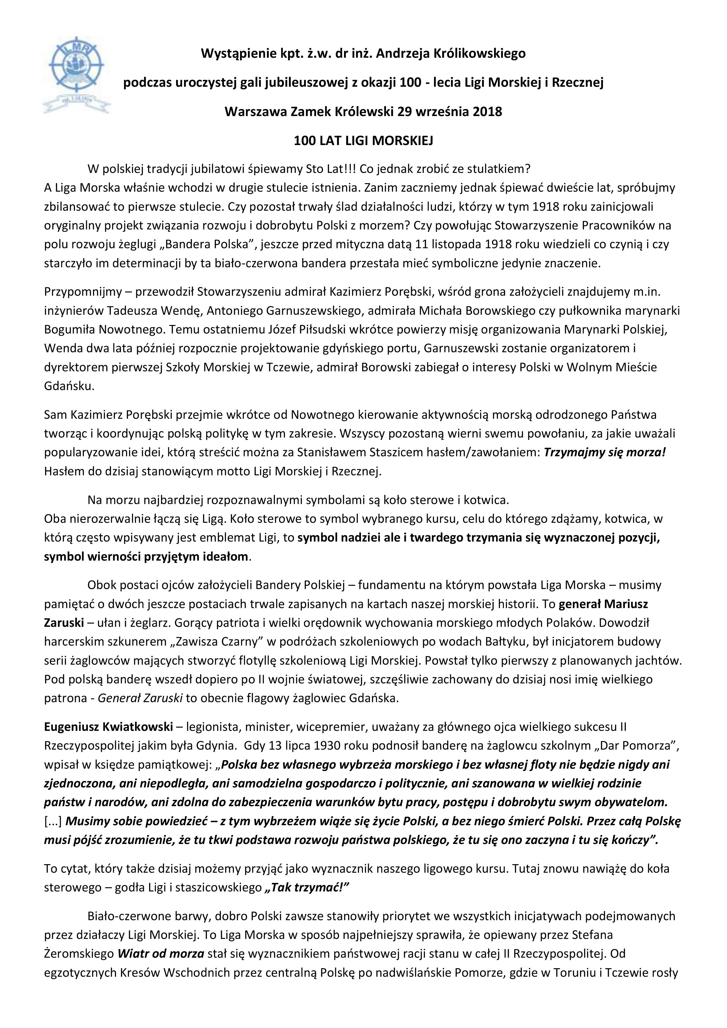 Wystąpienie kpt. ż.w. dr. inż. Andrzeja Królikowskiego podczas uroczystej gali jubileuszowej z okazji 100 -lecia LMiR