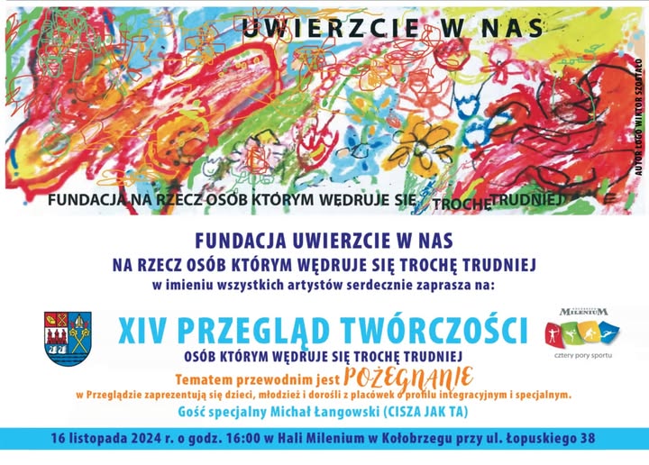 Przegląd Twórczości Osób, Którym Wędruje Się Trochę Trudniej jest okazją do zaprezentowania swoich umiejętności przez dzieci, młodzież i dorosłych z kołobrzeskich placówek o profilu integracyjnym i specjalnym. Jak co roku Przegląd wpisał się w obchody Międzynarodowego Dnia Tolerancji. Przegląd w Hali Milenium odbył się już po raz 14. Przegląd Twórczości Osób, Którym Wędruje Się Trochę Trudniej to niezwykłe spotkanie i piękna lekcja o wrażliwości, zrozumieniu i radości, mówiła podczas wydarzenia Anna Mieczkowska prezydent Kołobrzegu. Wierzę, że swoją misję wypełniłam, że mój osobisty cel zaczął obrastać w skrzydła przecudnej sprawczości, mówiła podczas przeglądu Małgorzata Szmidt. Spotkanie było również okazją do uhonorowania i podziękowań za społeczną pracę na rzecz ,,Tych, którym wędruje się trochę trudniej”. Pamiątkowe statuetki otrzymali: Anna Mieczkowska i Janusz Gromek – aktualna i były prezydenci Kołobrzegu – za stałe, wieloletnie wspieranie programu, Krzysztof Legun za prawną opiekę nad fundacją i Marek Padjas za łamanie barier i pokazywanie tego co za horyzontem. Całe wydarzenie przebiegało w wyjątkowej atmosferze, a zaprezentowane występy skłaniały do refleksji oraz dostarczyły wiele wzruszeń. Gościem specjalnym przeglądu był Michał Łangowski z zespołu poezji śpiewanej „Cisza Jak Ta”.