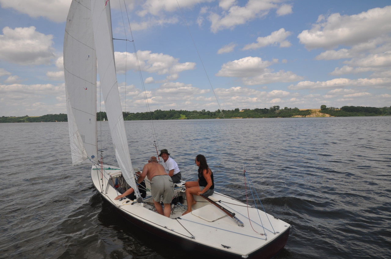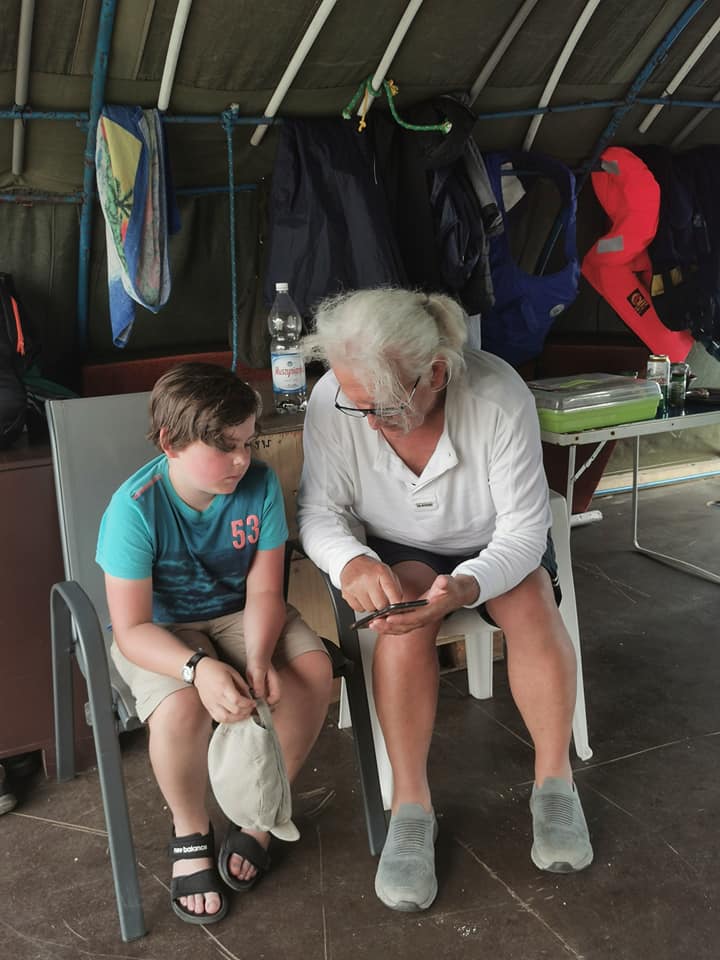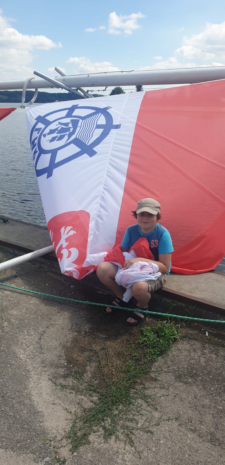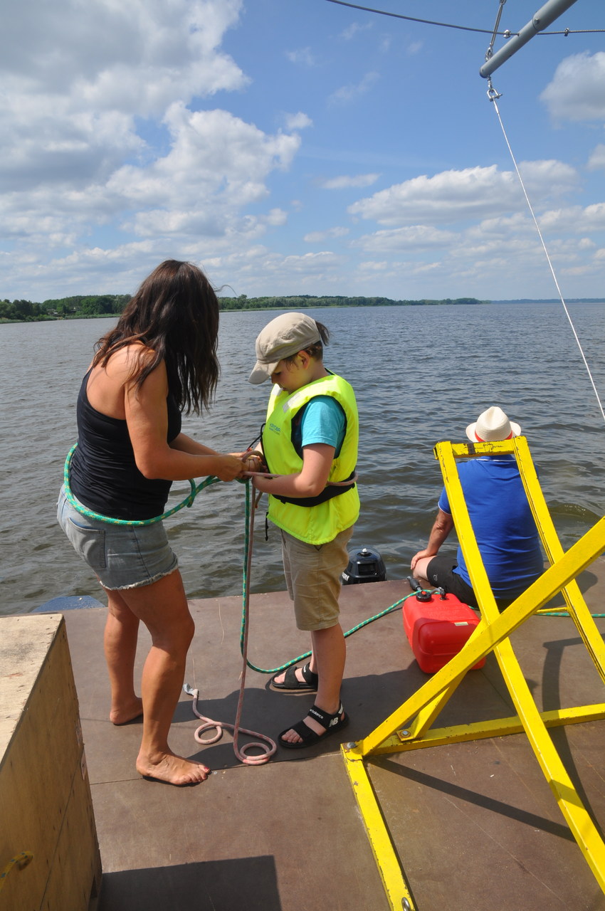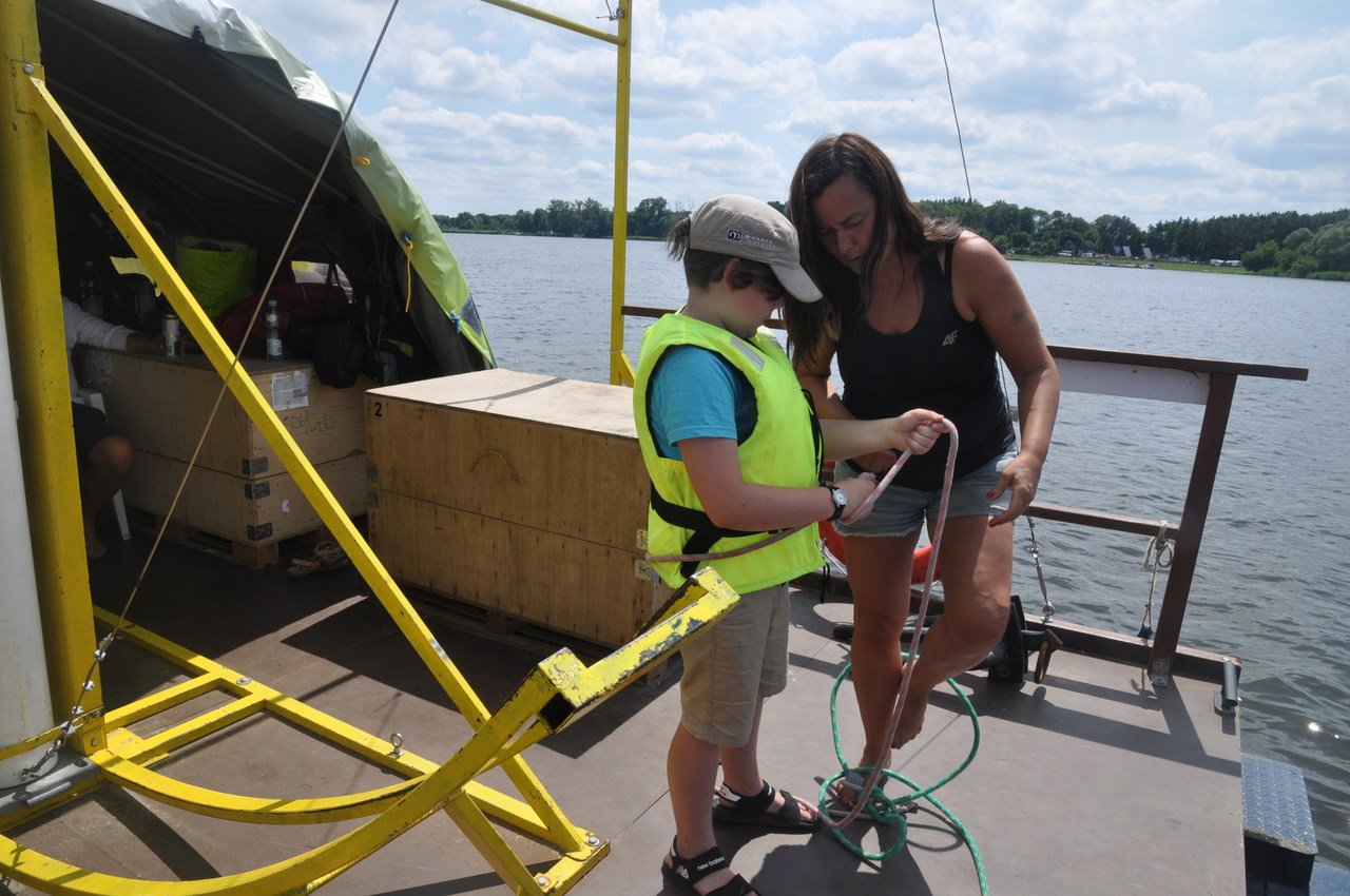 Wszystko gotowe, mijamy główki wyjściowe mariny. Razem z nami płyną na swojej łodzi Andrzej i Ula. Najmłodszy załogant rozpoczyna szkolenie. Po pierwsze zakładanie kamizelki asekuracyjnej – zajęcia prowadzi kapitan Wojtek. Kolejne to nauka węzłów – tu prym wiedzie kapitan Gabrysia. No i sterowanie – to już moje zadanie. Obserwujemy brzegi i staramy się określać nasze położenie. Locja to dział wiedzy nautycznej opisujący wody żeglowne. My ,,odrobiliśmy lekcje”.