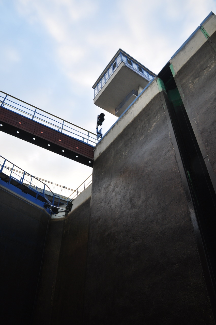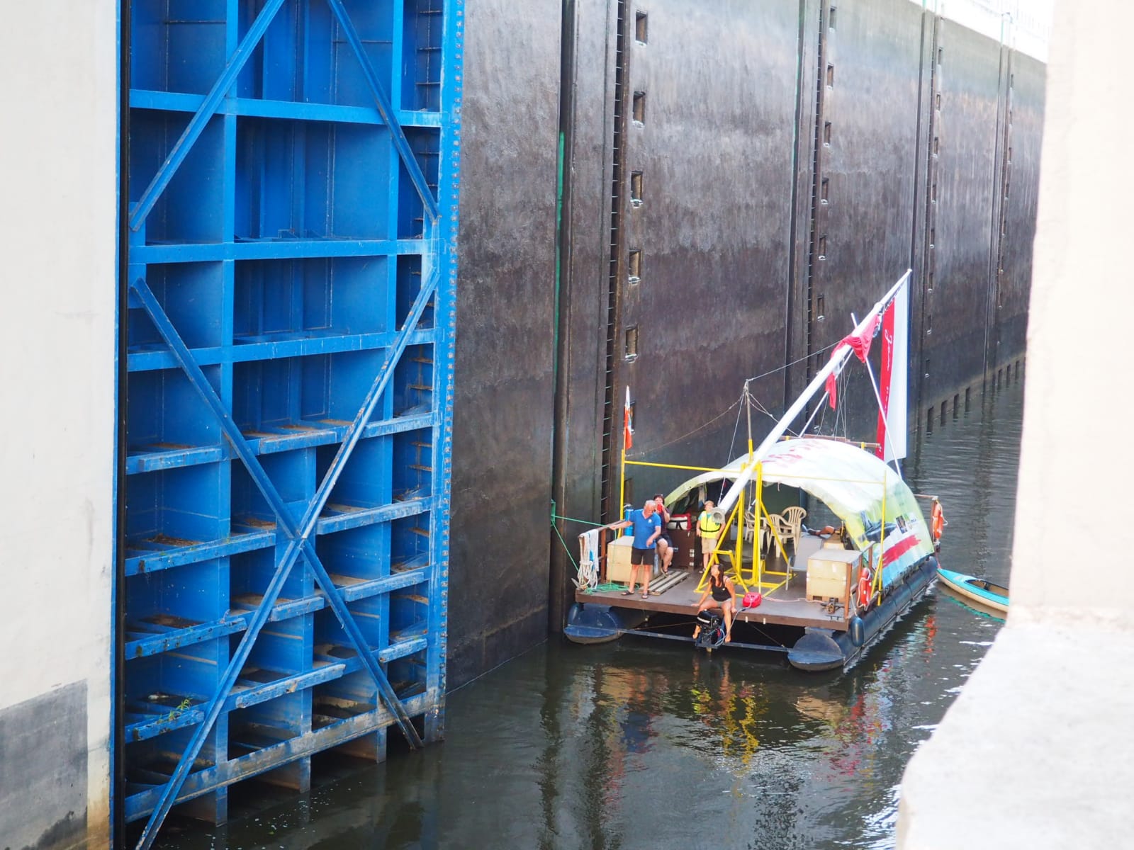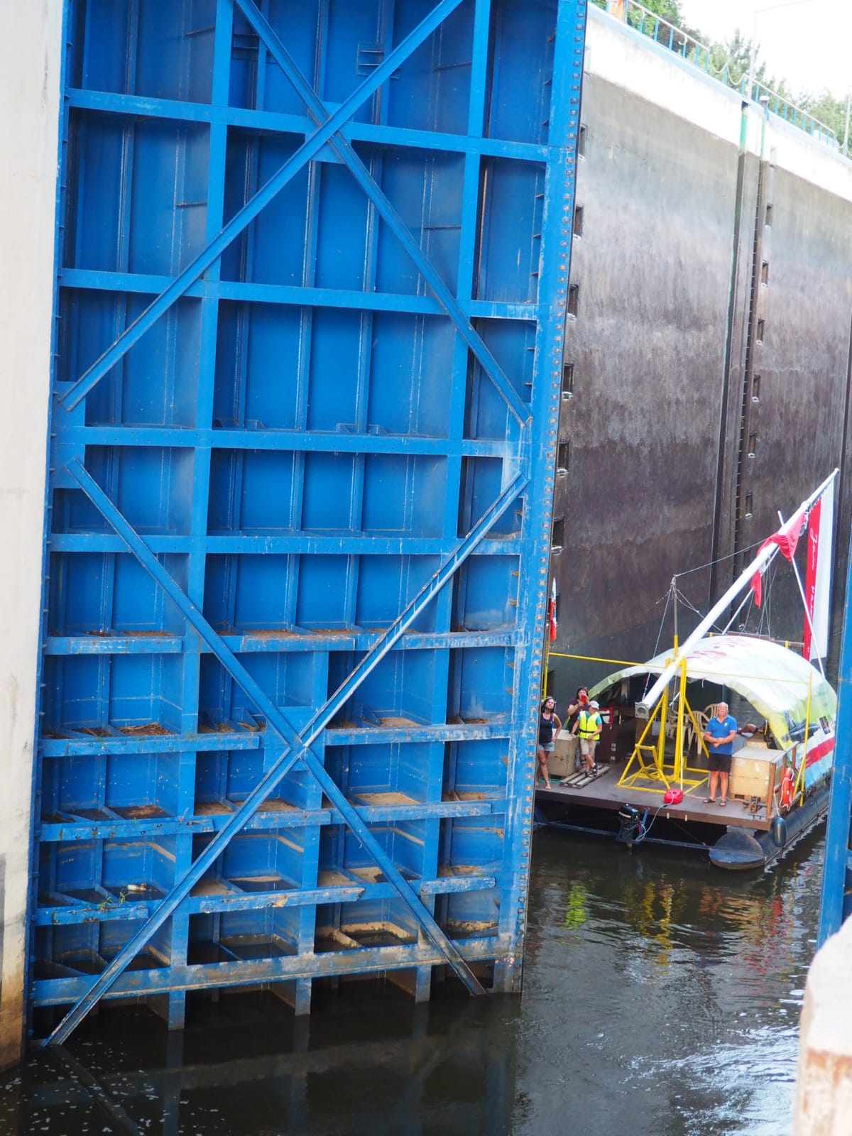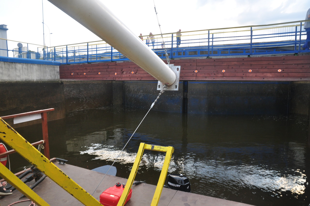 Przyszedł czas na pokaz śluzowania. „Pielgrzym” wpływa do śluzy, wrota za nim zostały zamknięte. Tratwę zacumowano na biegowo do specjalnego mechanizmu, który nie pozwolił jej przemieszczać się po zbiorniku oraz opuszczał się z nią wraz ze zniżaniem się poziomu wody. Ogrom stali i betonu robi wrażenie. Pielgrzym opadł o kilkanaście metrów w dół i zakończyła się pierwsza faza śluzowania. Teraz, czekamy aby wrota się otworzyły i można było wypłynąć. Ruszamy, dolny awanport jest zarośnięty. Trzeba wspomagać się bosakiem i łopatą odgarniać rośliny nawijające się na śrubę. Wypływamy na rzekę. Trzeba ostrożnie manewrować blisko lewego brzegu. Po prawej burcie widać płycizny i katarakty.