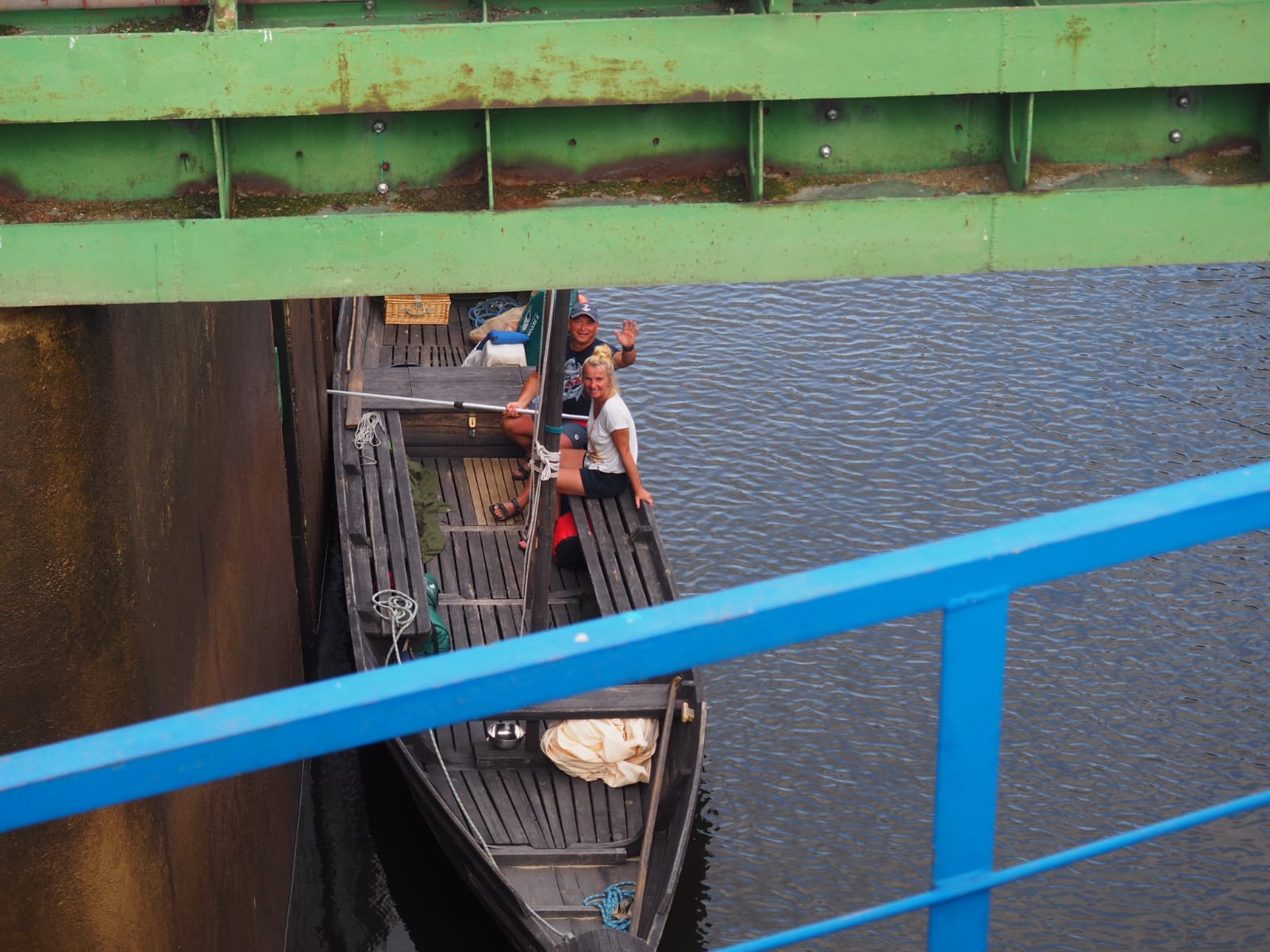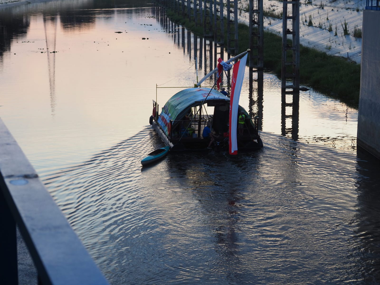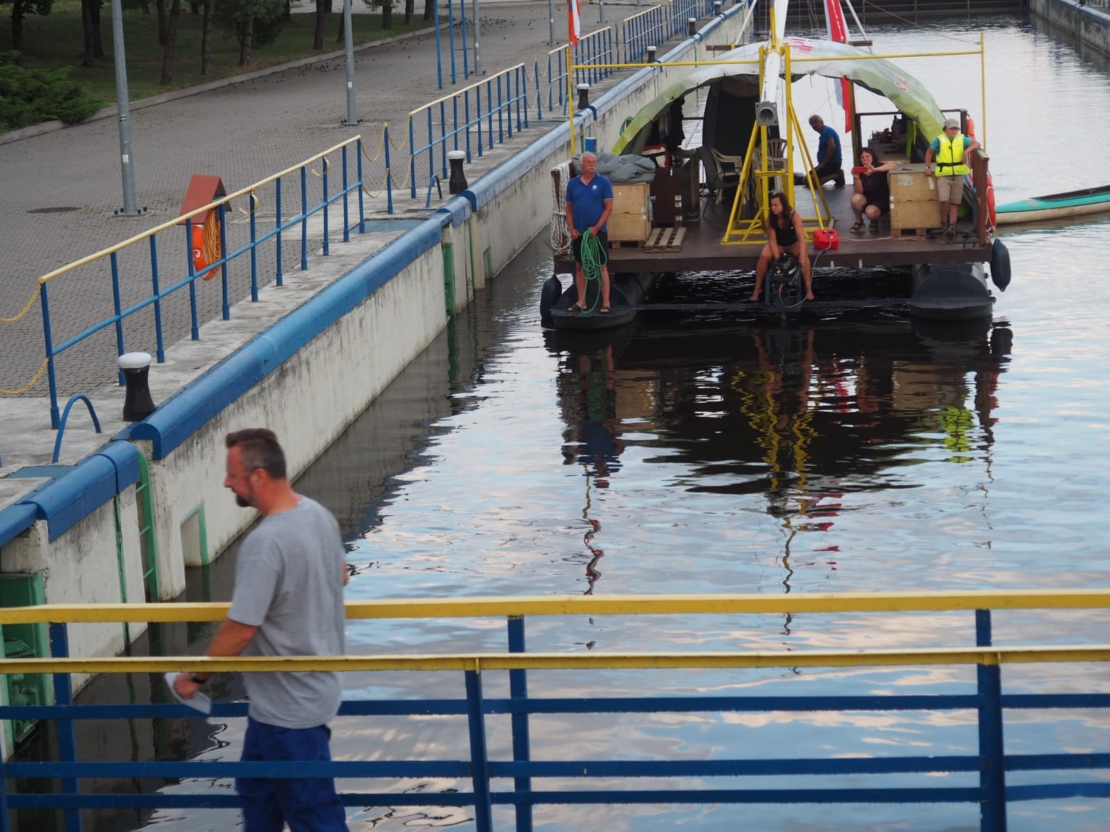 Przyszedł czas na pokaz śluzowania. „Pielgrzym” wpływa do śluzy, wrota za nim zostały zamknięte. Tratwę zacumowano na biegowo do specjalnego mechanizmu, który nie pozwolił jej przemieszczać się po zbiorniku oraz opuszczał się z nią wraz ze zniżaniem się poziomu wody. Ogrom stali i betonu robi wrażenie. Pielgrzym opadł o kilkanaście metrów w dół i zakończyła się pierwsza faza śluzowania. Teraz, czekamy aby wrota się otworzyły i można było wypłynąć. Ruszamy, dolny awanport jest zarośnięty. Trzeba wspomagać się bosakiem i łopatą odgarniać rośliny nawijające się na śrubę. Wypływamy na rzekę. Trzeba ostrożnie manewrować blisko lewego brzegu. Po prawej burcie widać płycizny i katarakty.