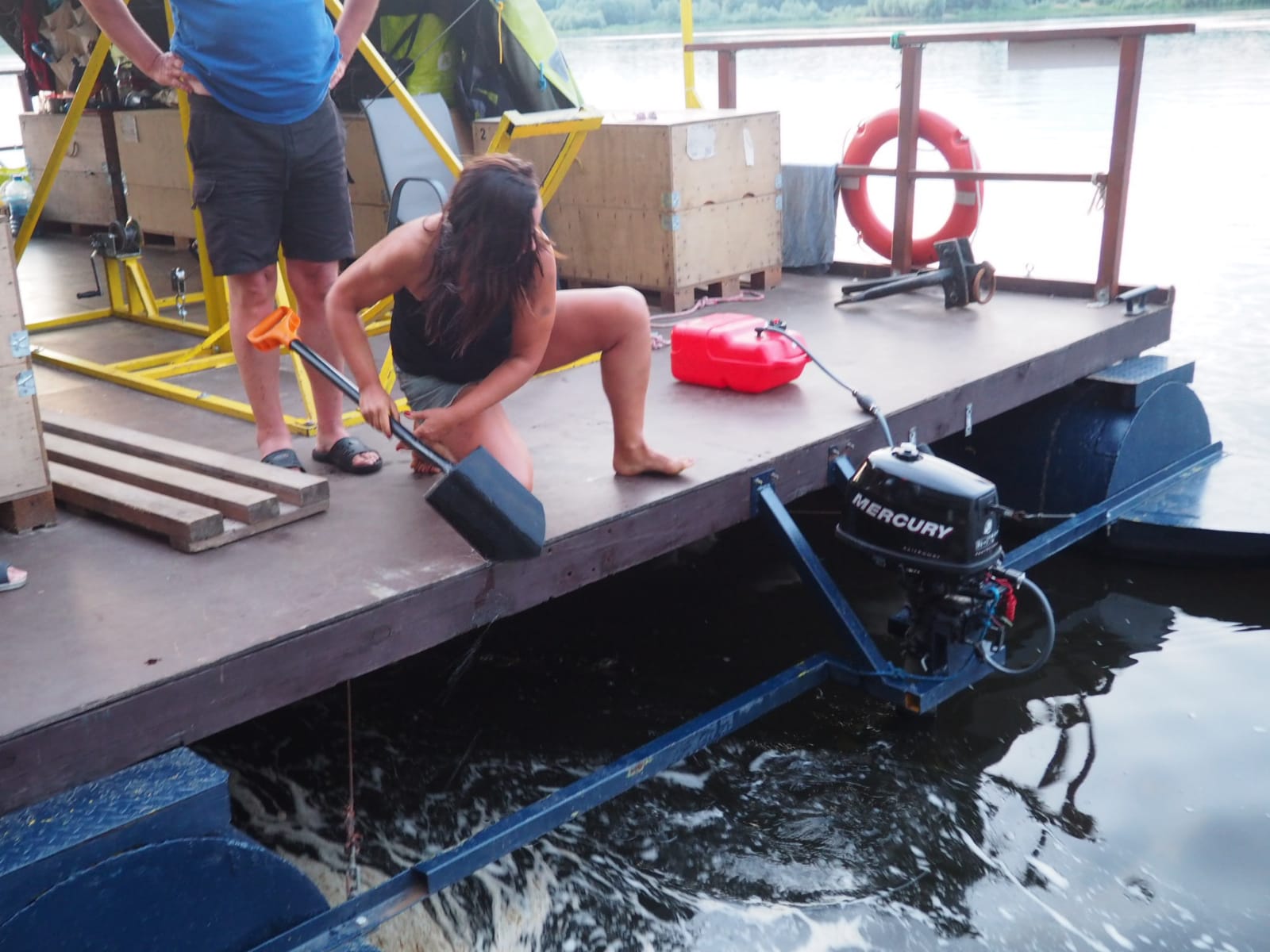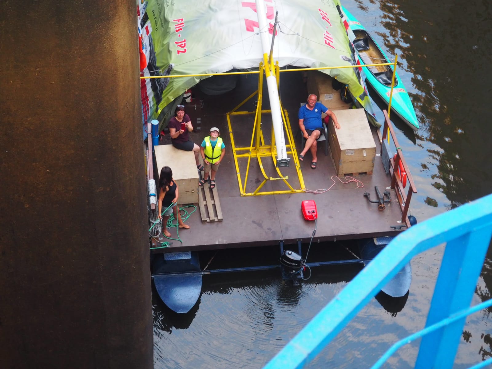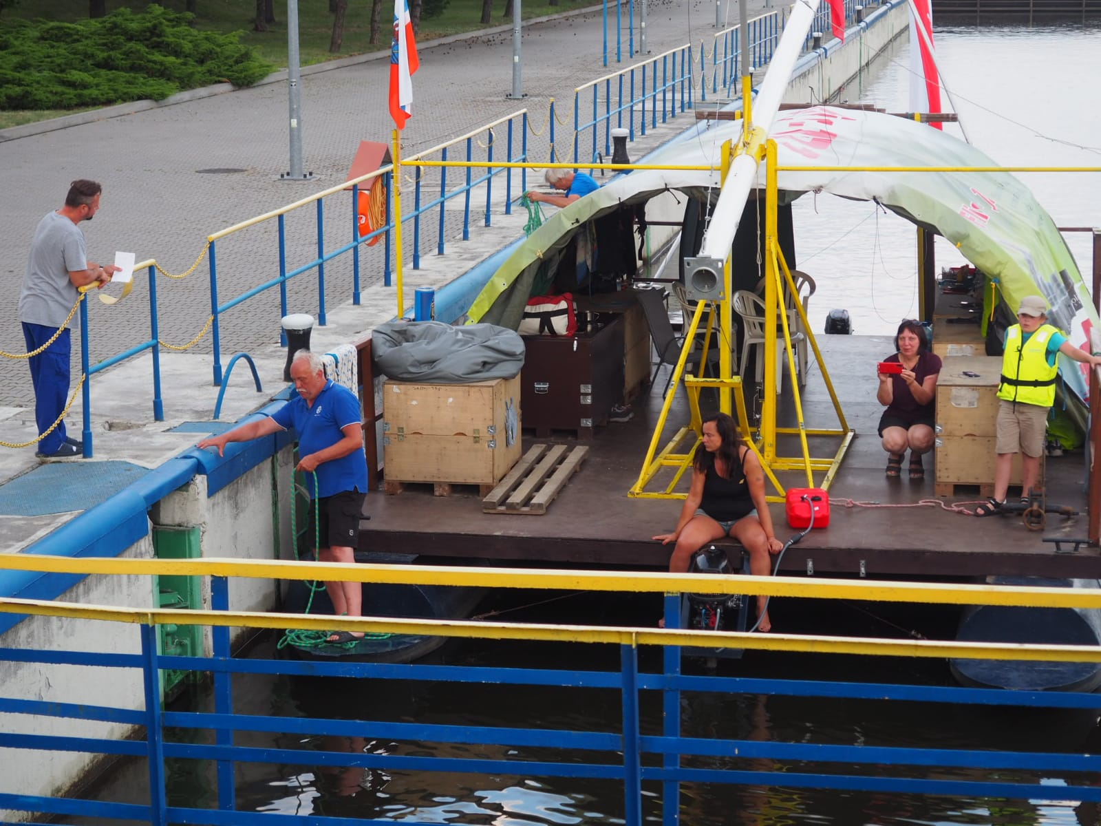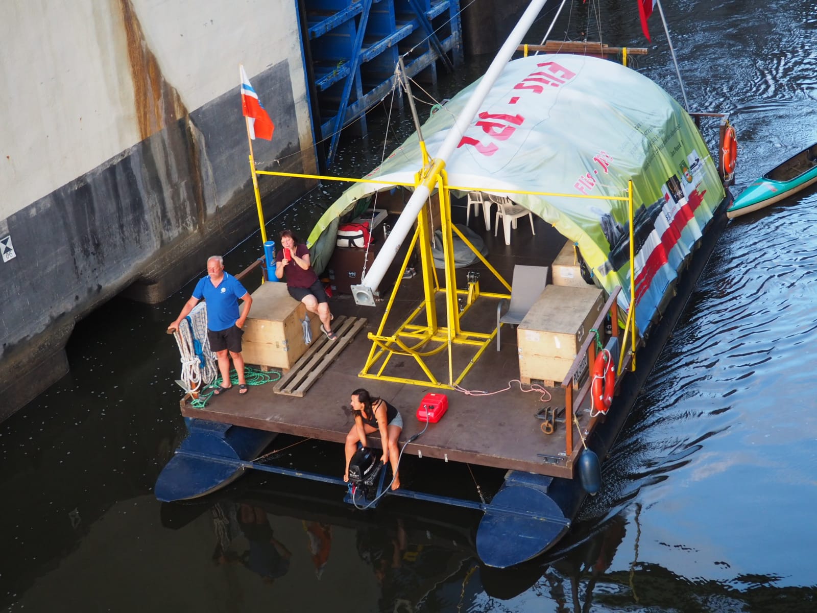 Przyszedł czas na pokaz śluzowania. „Pielgrzym” wpływa do śluzy, wrota za nim zostały zamknięte. Tratwę zacumowano na biegowo do specjalnego mechanizmu, który nie pozwolił jej przemieszczać się po zbiorniku oraz opuszczał się z nią wraz ze zniżaniem się poziomu wody. Ogrom stali i betonu robi wrażenie. Pielgrzym opadł o kilkanaście metrów w dół i zakończyła się pierwsza faza śluzowania. Teraz, czekamy aby wrota się otworzyły i można było wypłynąć. Ruszamy, dolny awanport jest zarośnięty. Trzeba wspomagać się bosakiem i łopatą odgarniać rośliny nawijające się na śrubę. Wypływamy na rzekę. Trzeba ostrożnie manewrować blisko lewego brzegu. Po prawej burcie widać płycizny i katarakty.