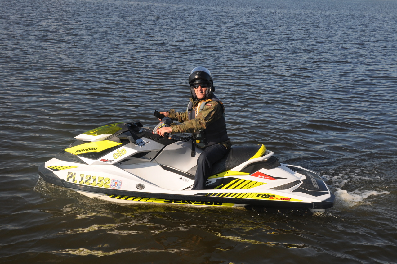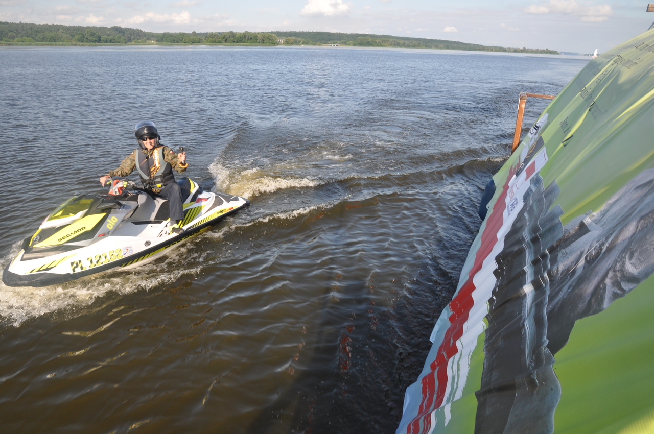 Do naszej burty podpływa skuter wodny. Za kierownicą Aleksander Ożóg. Dowiadujemy się, że ma zamiar pobić rekord przepłynięcia najdłuższego dystansu skuterem wodnym w ciągu 24 godzin z prądem i pod prąd. Wyruszył o godzinie 4:31 z Portu w Płocku, a jego zadaniem było przepłynąć przynajmniej 800 km na odcinku Wisły Płock-Włocławek, w tę i z powrotem. Już z mediów wiemy, że Pan Aleksander pokonał wymagane minimum już po 12 godzinach. Rejs zakończył się dokładnie o godzinie 19:52, po 15 godzinach i 21 minutach z wynikiem 1008,9 km!