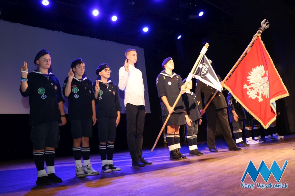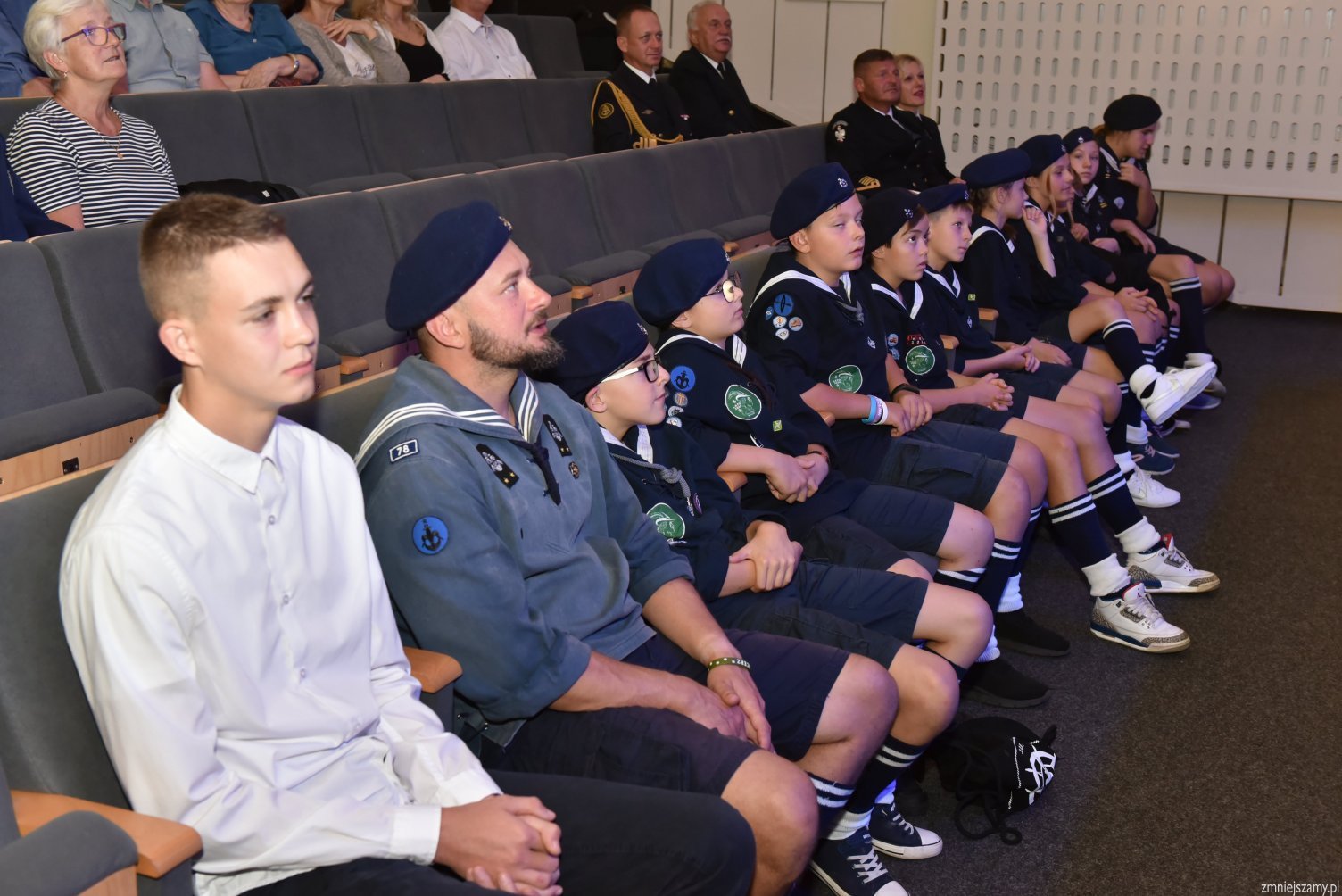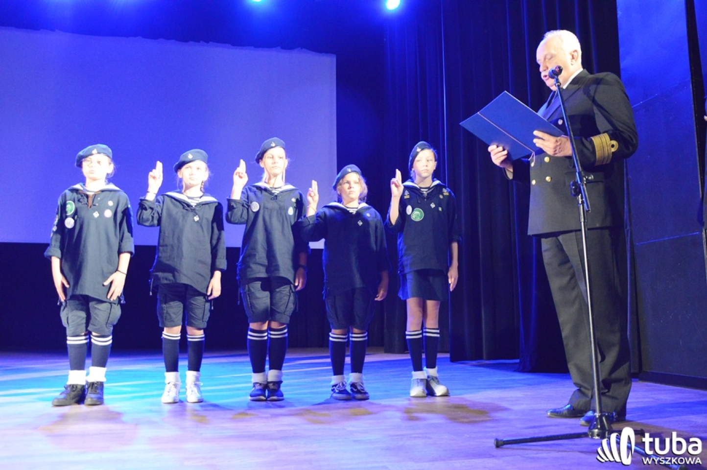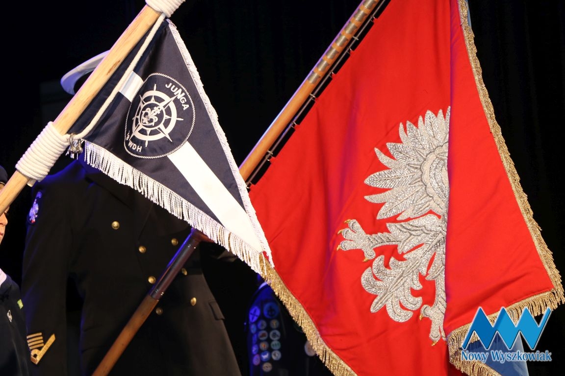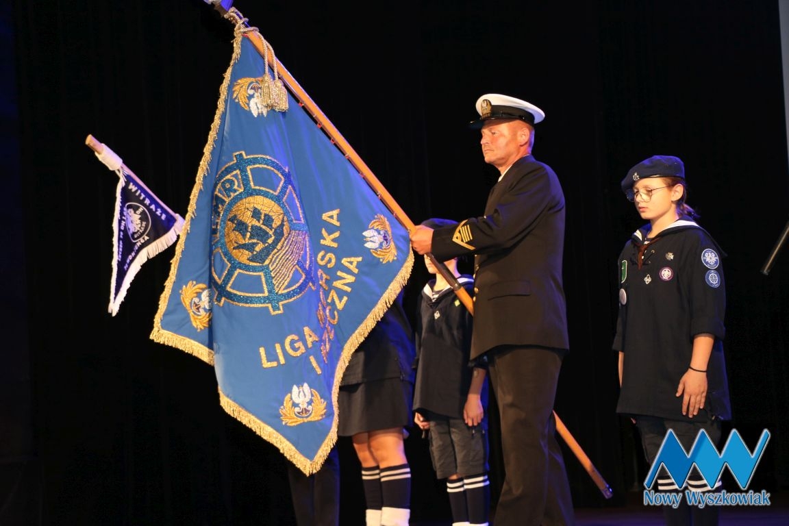Nadszedł czas na drugą część uroczystości. Na sali koncertowej wszystkich zebranych powitała Elżbieta Kasińska prezes wyszkowskiego oddziału LMiR. Szczególnie gorąco powitała młodzież i najstarszego członka Ligi Jerzego Dąbrowskiego. Odniosła się do roli jaką odgrywają wszystkie organizacje społeczne w budowaniu Polski Morskiej i Rzecznej. Takim wspaniałym przykładem może być bardzo dobra współpraca ze Związkiem Harcerstwa Polskiego, stowarzyszeniem mieszkańców Rybienka Leśnego i okolic, oraz innymi grupami zainteresowanymi ,,ożywieniem” rzeki Bug. Podkreśliła znaczenie pracy z młodzieżą na rzecz wychowania wodniackiego. Po powitaniu wprowadzony został sztandar Ligi Morskiej i Rzecznej. Zebrani odśpiewali Hymn do Bałtyku. Na scenę zaproszono jungów 48 WDH Junga. Złożyli oni ślubowanie. Rotę odczytał kmdr Marek Padjas. Ze względu na pandemiczną sytuację uroczystość nie mogła odbyć się nad brzegiem Bugu.