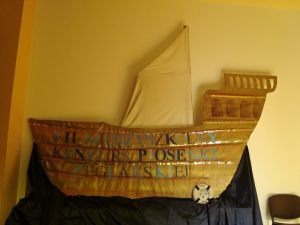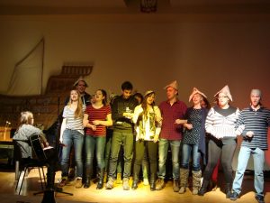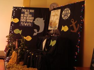 Spotkanie z piosenką żeglarską stało się okazją do przypomnienia przez uczniów kl. I IV LO wydarzeń historycznych, dzięki którym po latach niewoli Polacy wywalczyli sobie swobodny dostęp do morza, rzek i jezior: rok 1918 – Powstanie Ligi Morskiej i utworzenie Marynarki Wojennej RP, luty 1920 r. – Zaślubiny Polski z Morzem w Pucku oraz marzec 1945 – Zaślubiny w Kołobrzegu. Szczególnych wzruszeń dostarczyła inscenizacja z zaślubin puckich, które jak wierzono były początkiem odzyskiwania pełnego dostępu Polski do morza. Oto gen. Haller w błękitnym mundurze, z biało – czerwoną szarfą na szyi, jak kapłan stułą związuje splecione dłonie: Jego – Bałtyku i Jej – Polski, a Oni ślubują sobie miłość, wierność, uczciwość i że się nie opuszczą aż do śmierci. W tle widać obraz Wojciecha Kossaka przedstawiający gen. Józefa Hallera na koniu, wrzucającego pierścień w wody zatoki Puckiej oraz zdjęcie żołnierzy I Armii Wojska Polskiego zanurzających Biało-Czerwony Sztandar w kołobrzeskich falach Bałtyku. Słychać też dziennikarza relacjonującego te uroczystości.